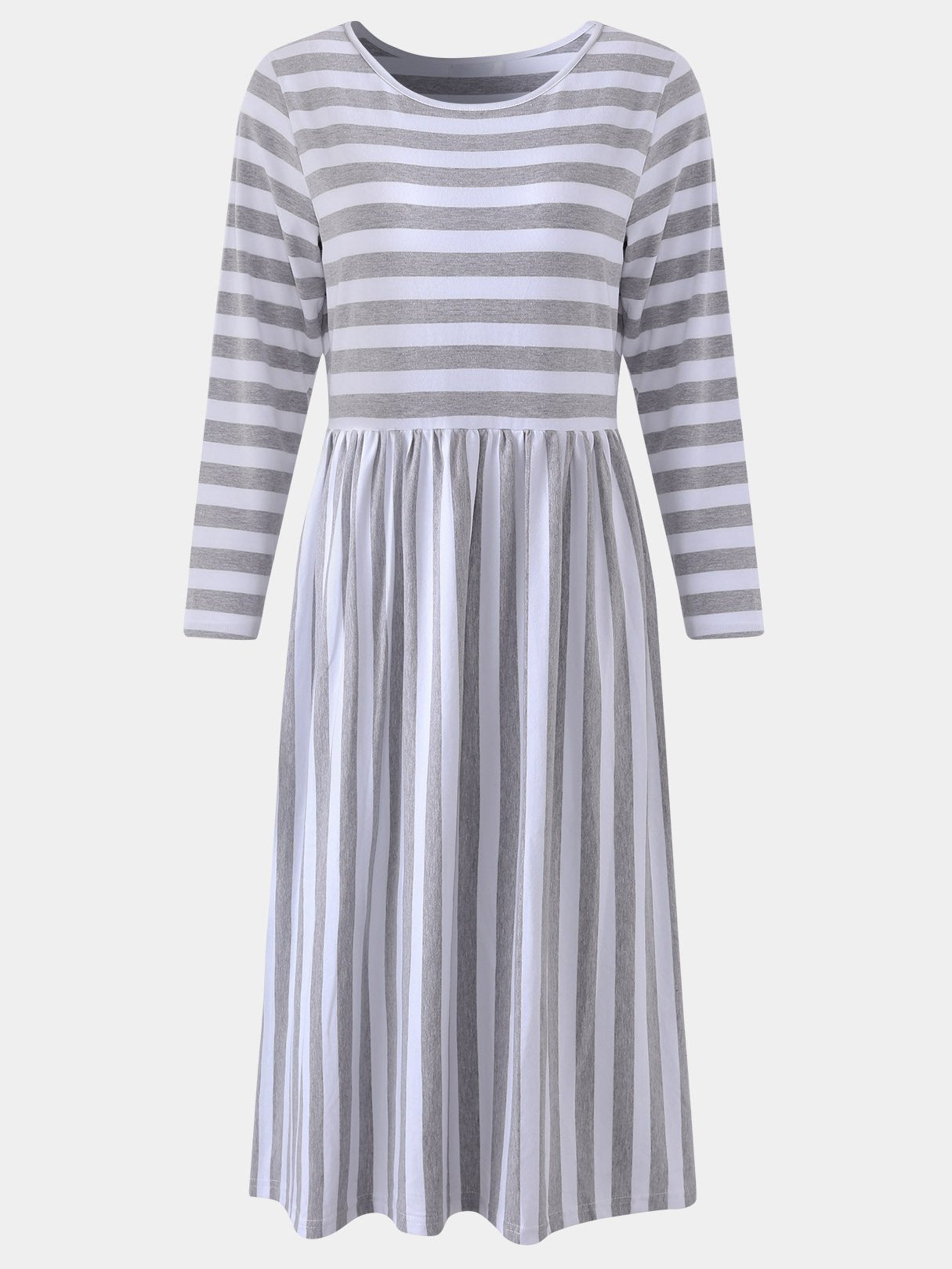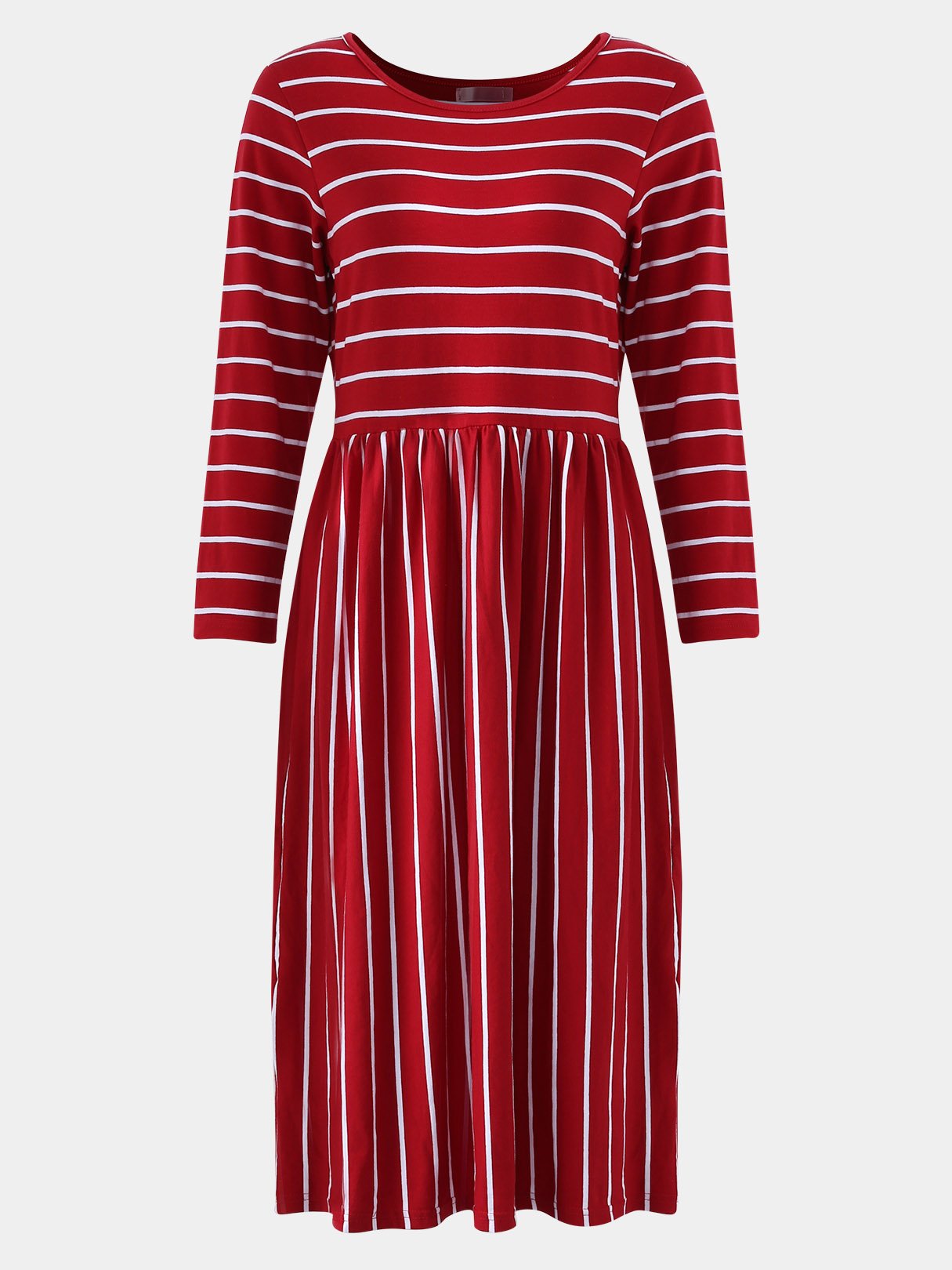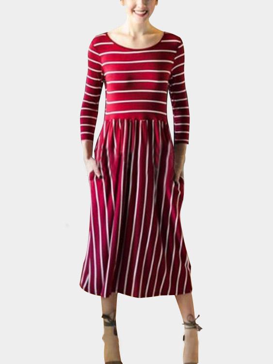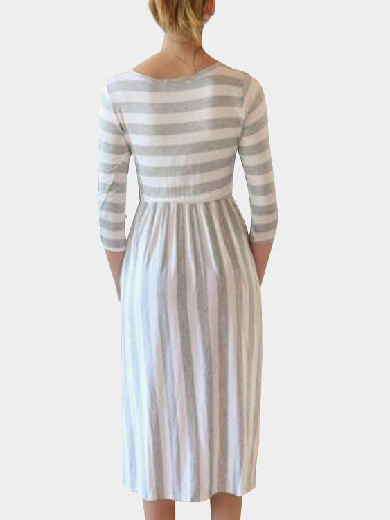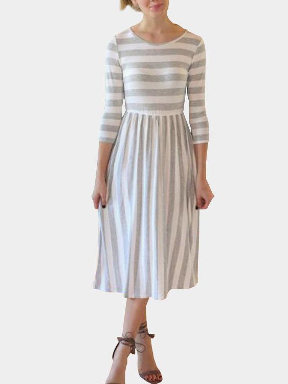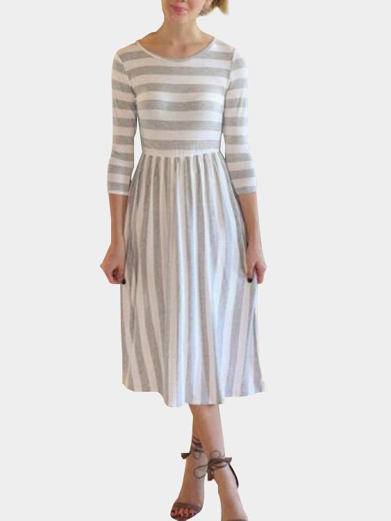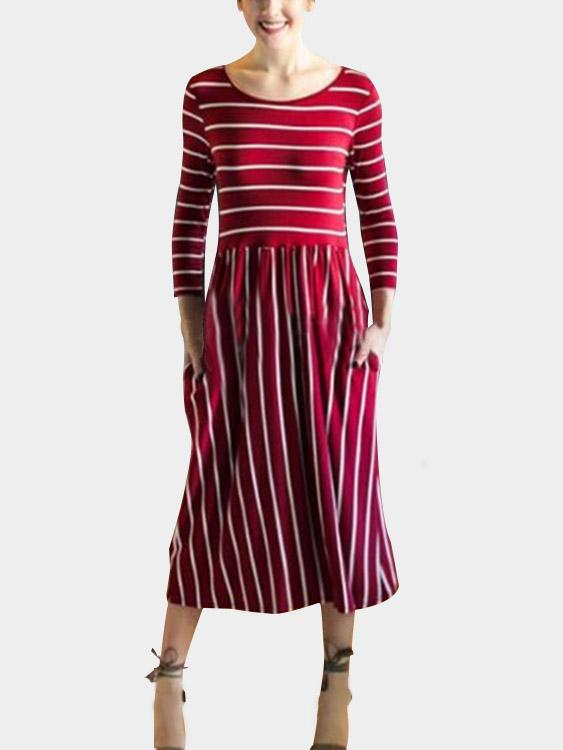 Round Neck 3/4 Length Sleeve Stripe Ruffle Hem Dresses