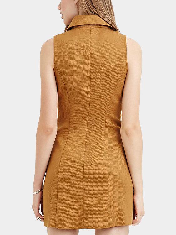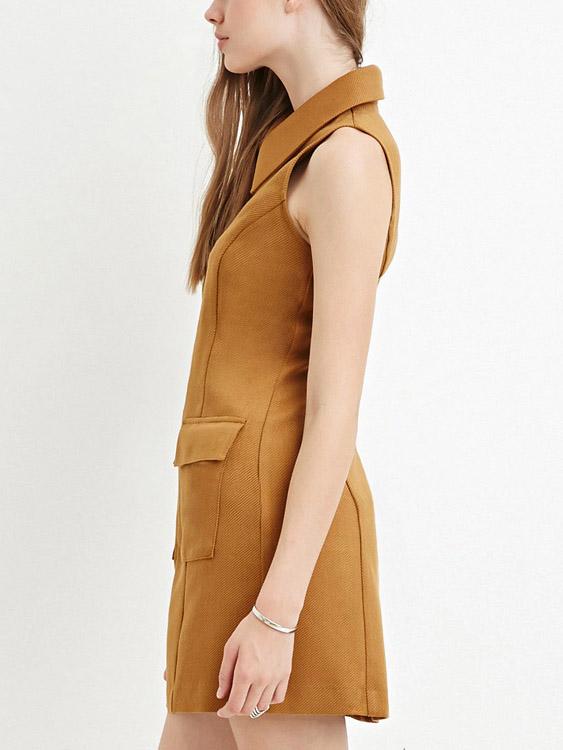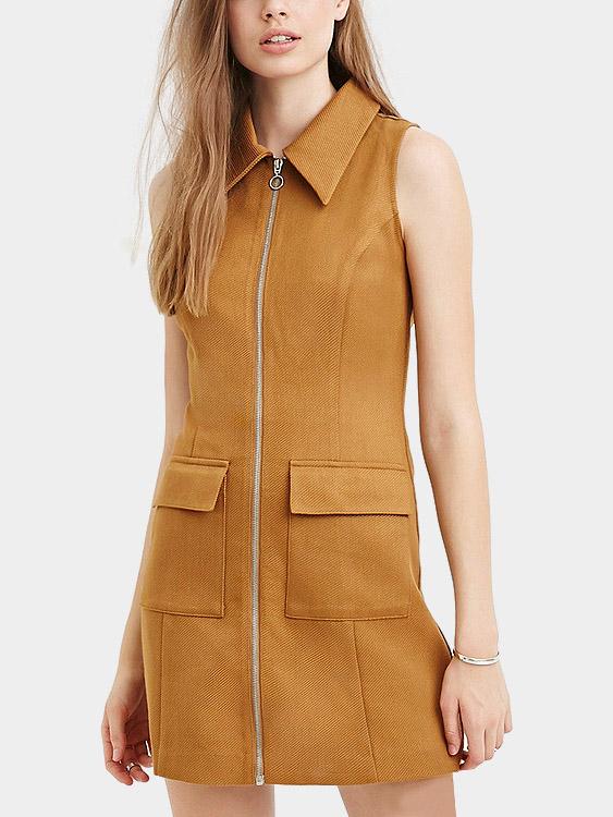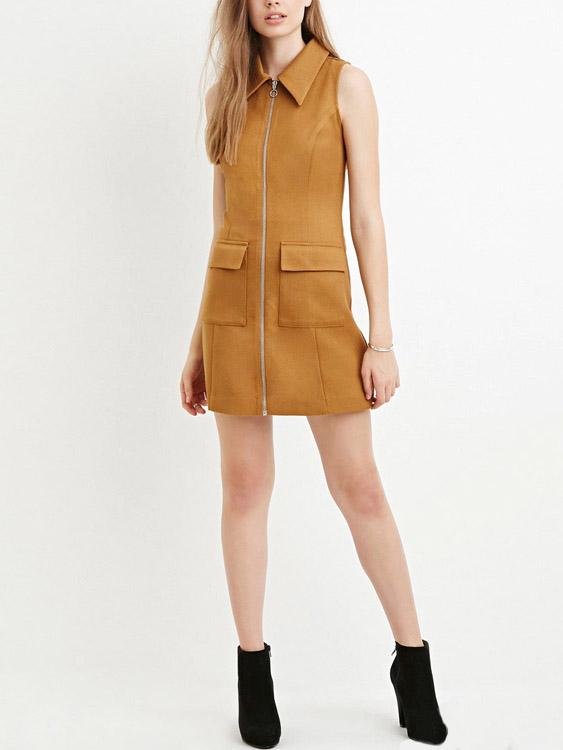 Yellow Classic Collar Sleeveless Side Pockets Dresses