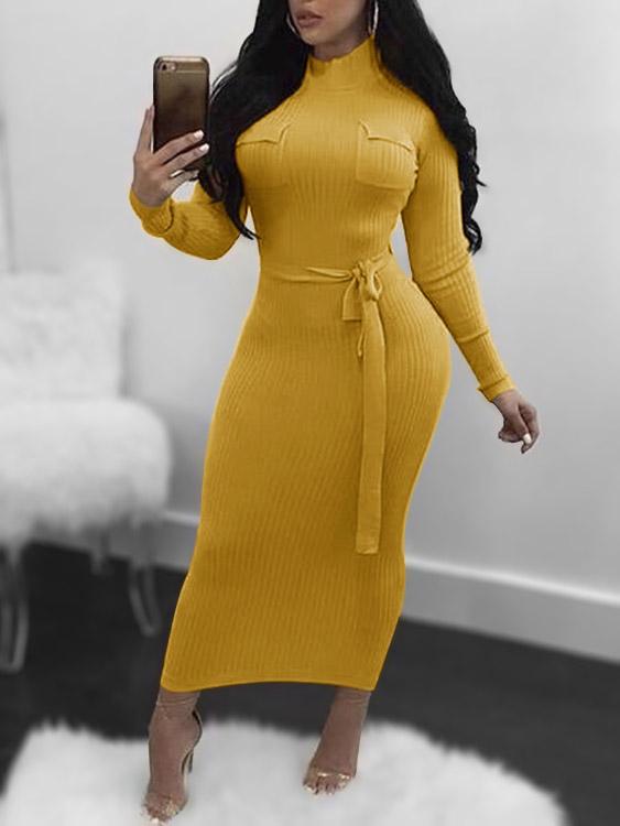 Yellow Perkins Collar Long Sleeve Plain Dresses