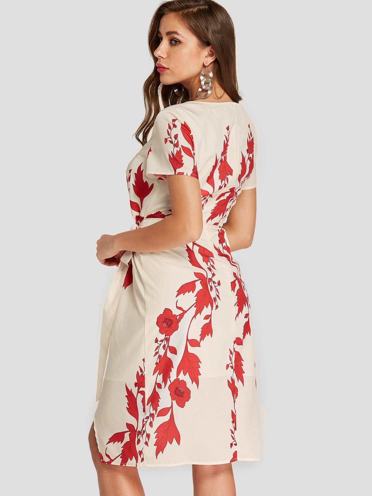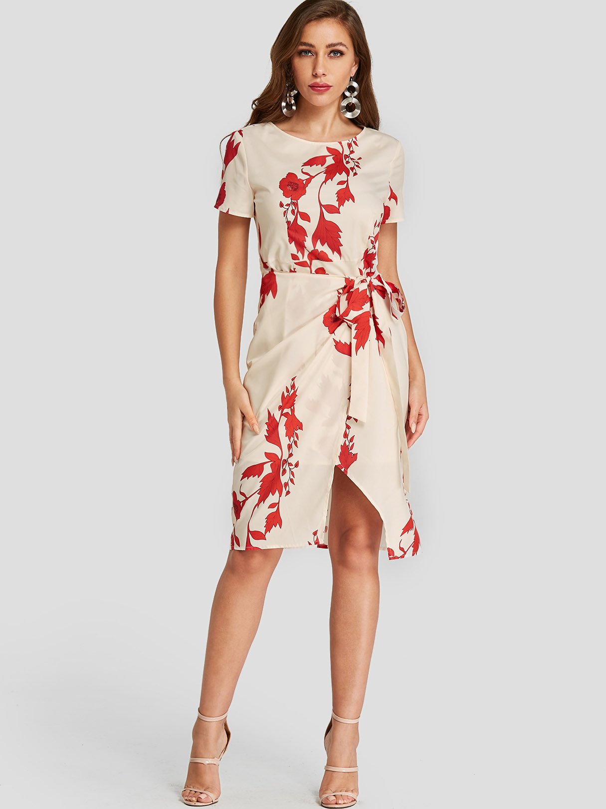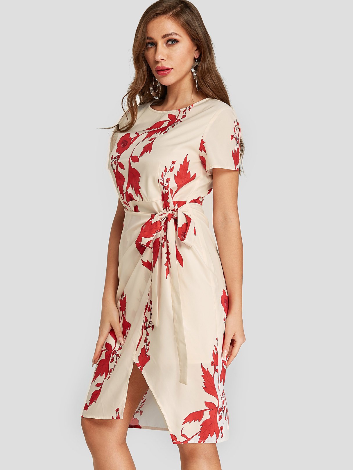 Apricot Round Neck Short Sleeve Floral Print Slit Irregular Hem Dresses