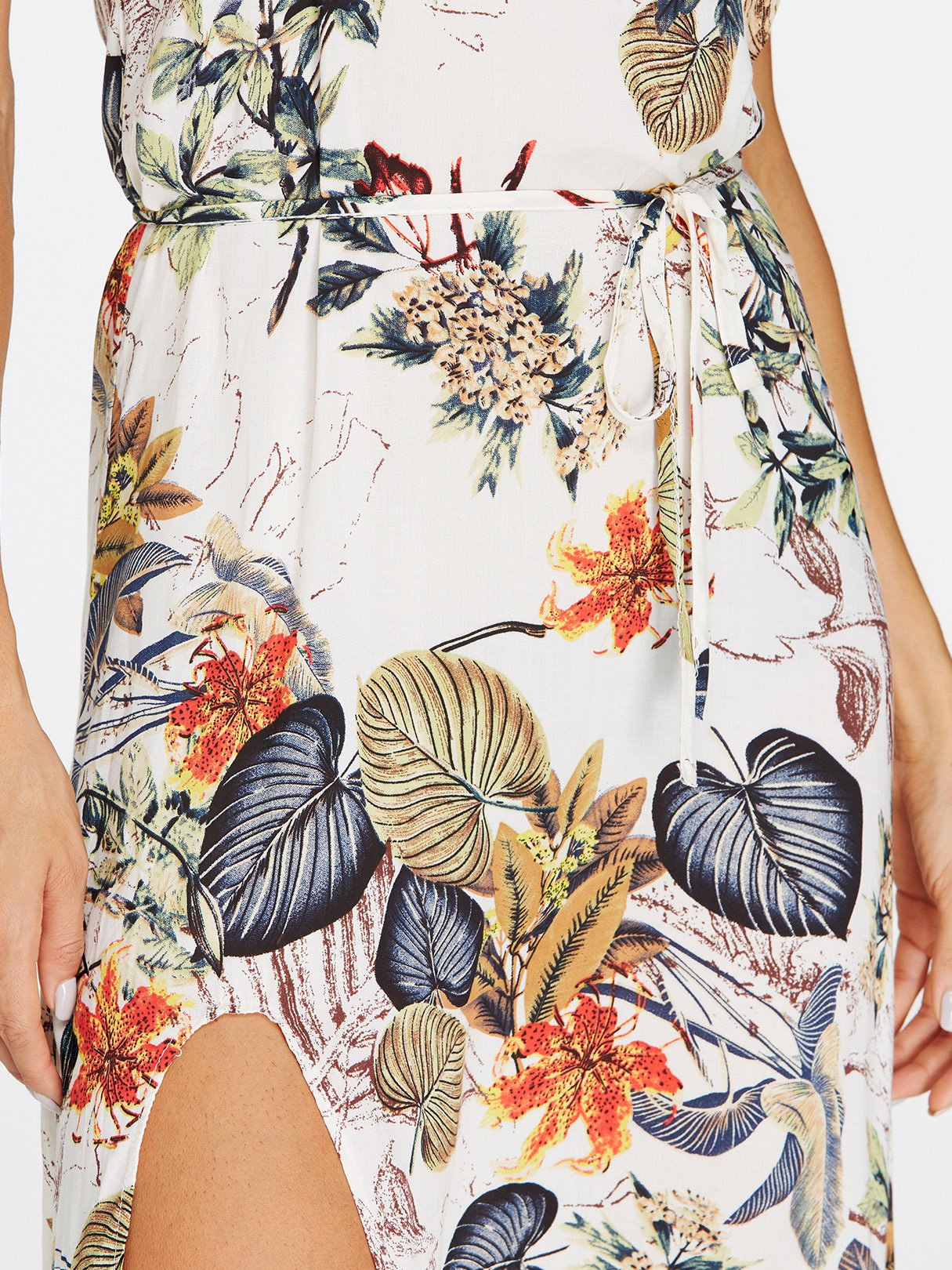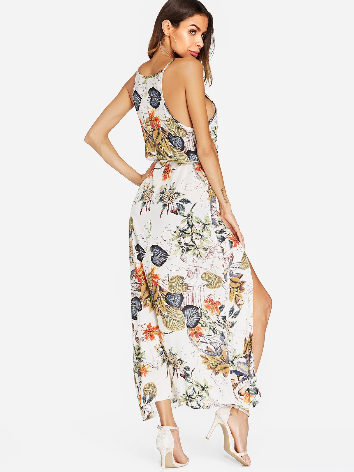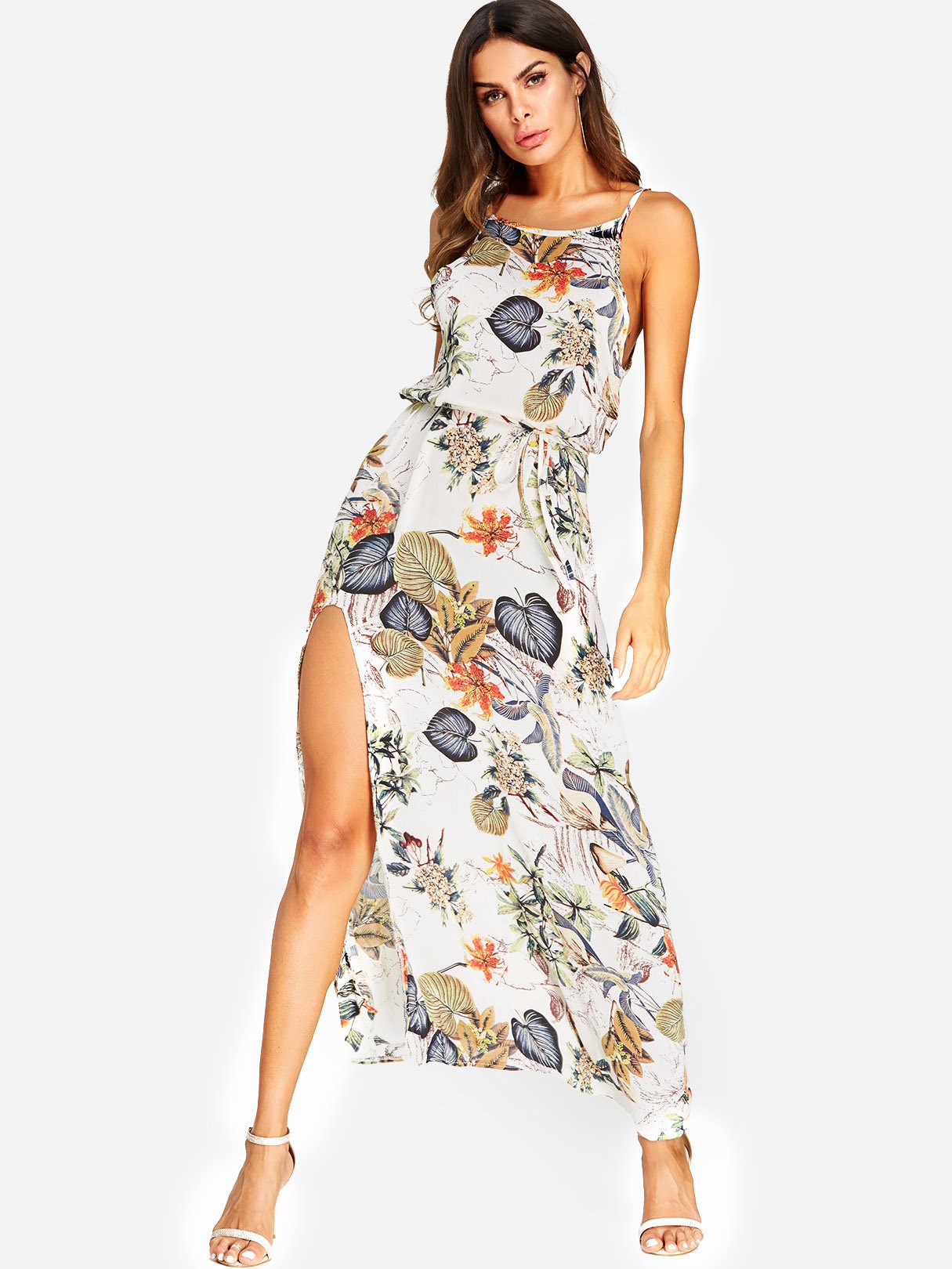 Apricot Round Neck Sleeveless Floral Print Spaghetti Strap Belt Slit Hem Dresses