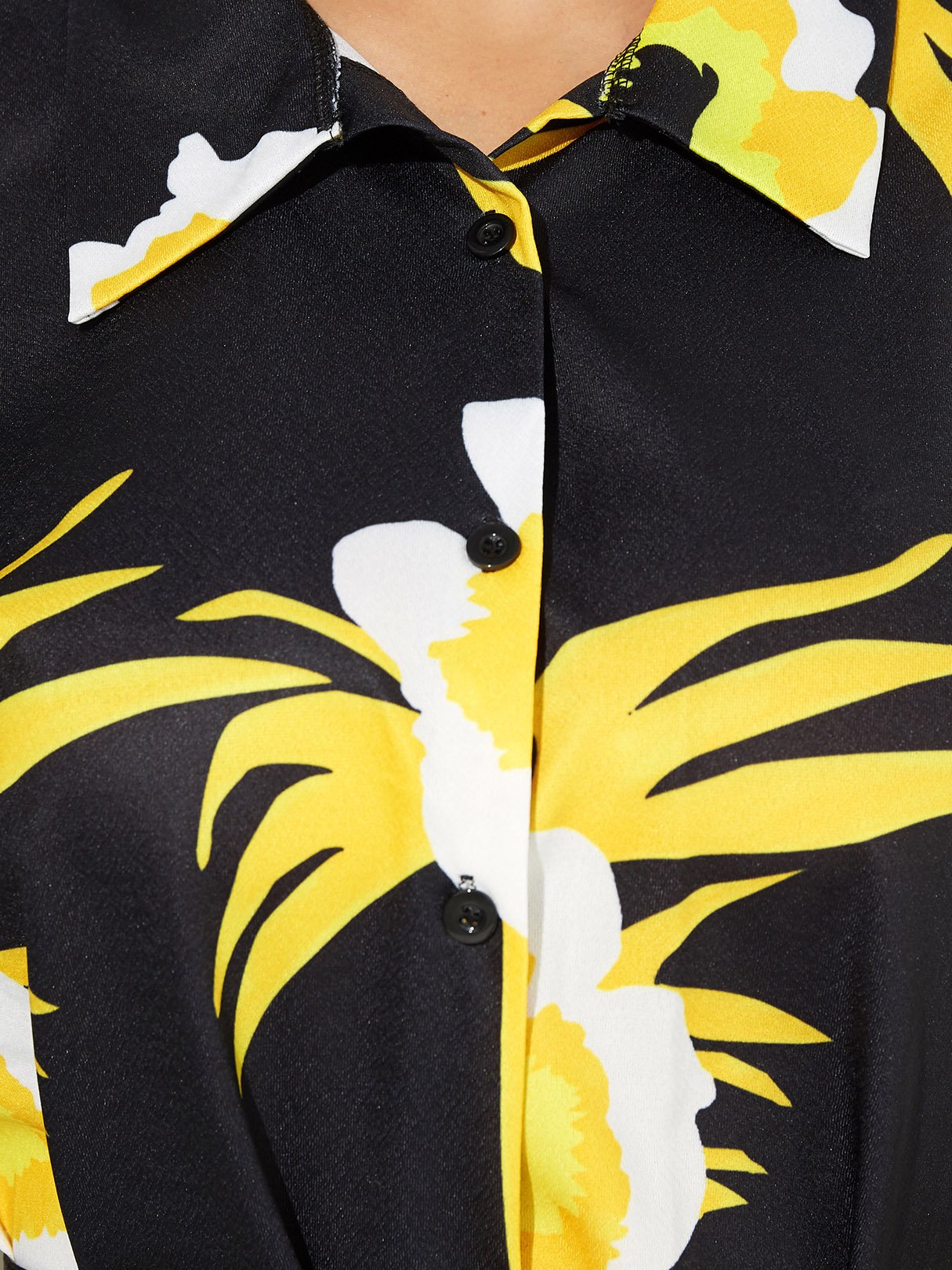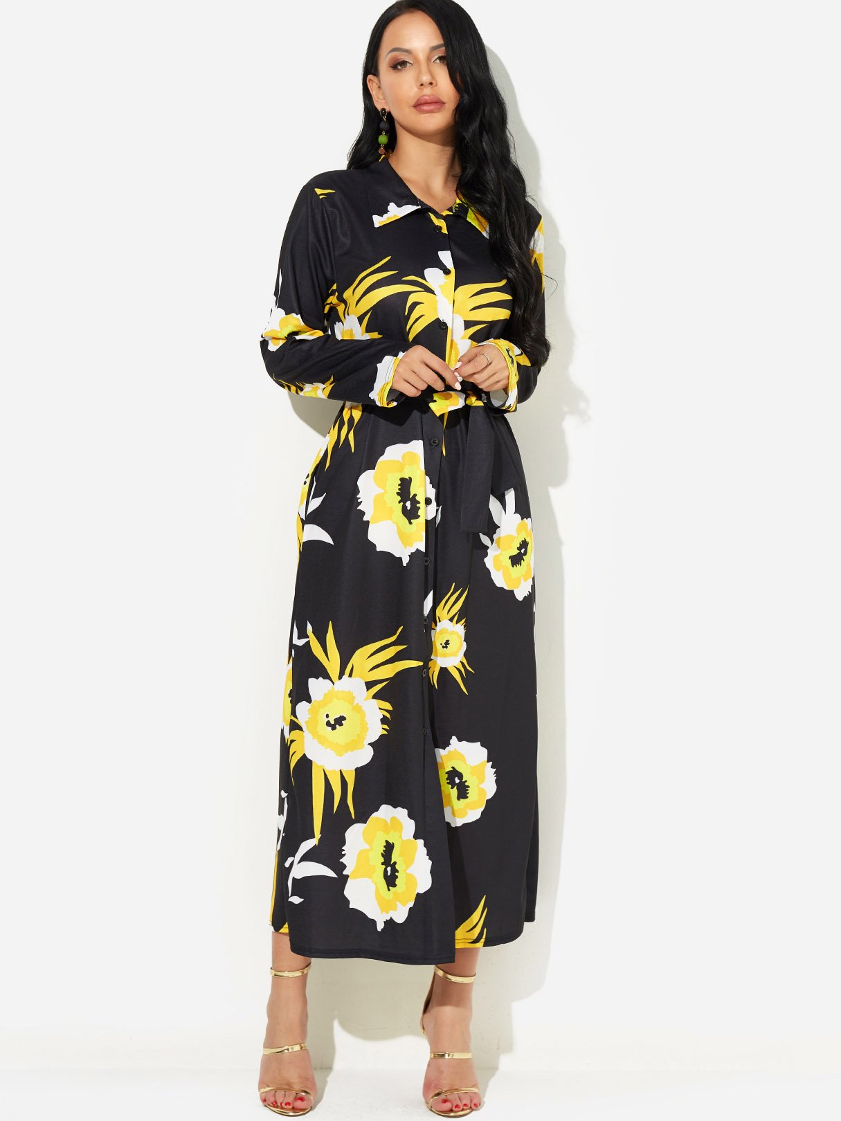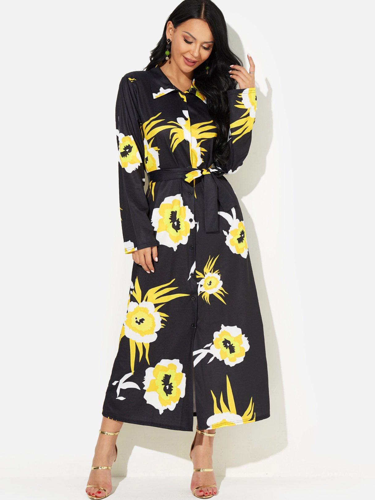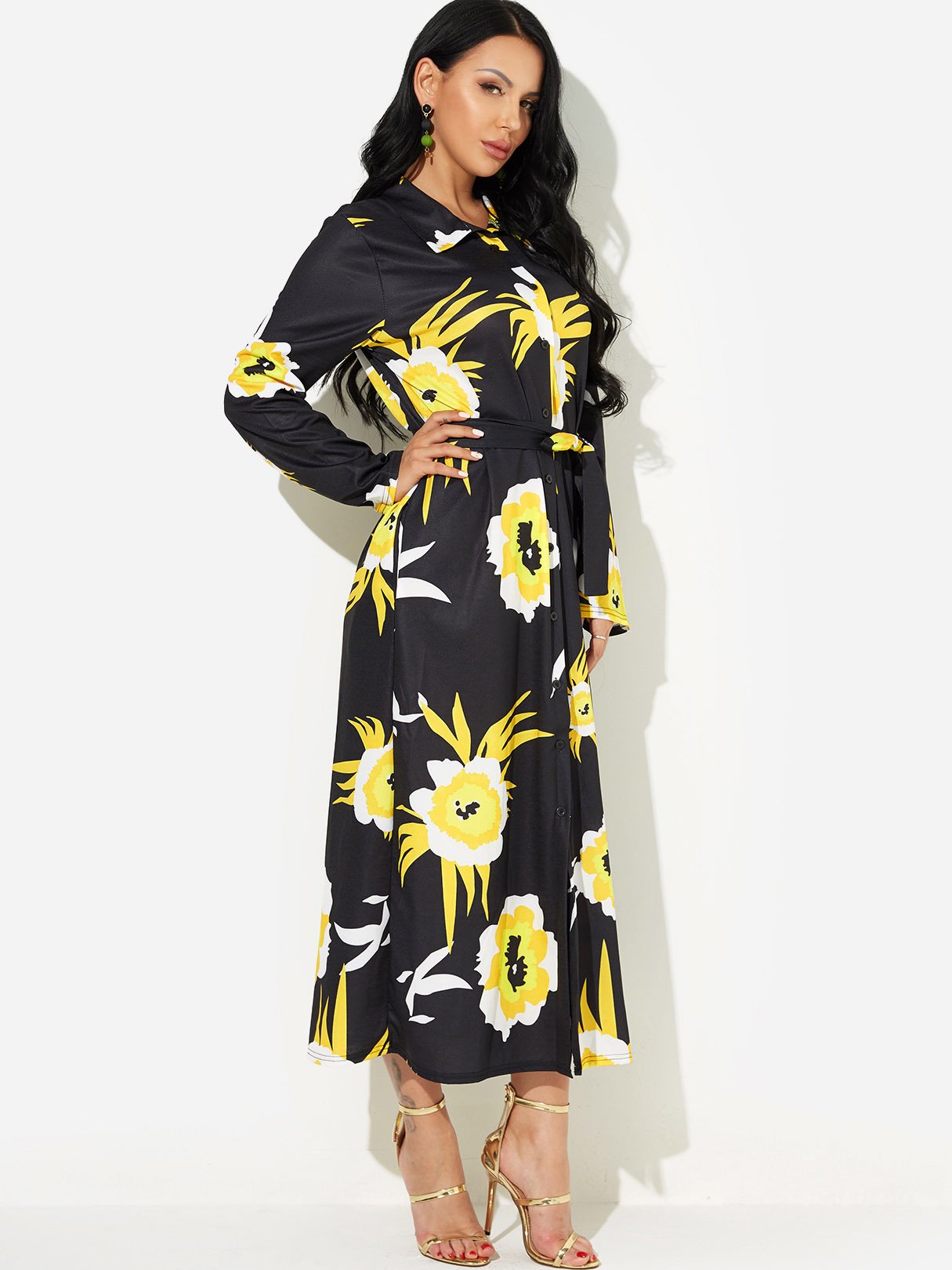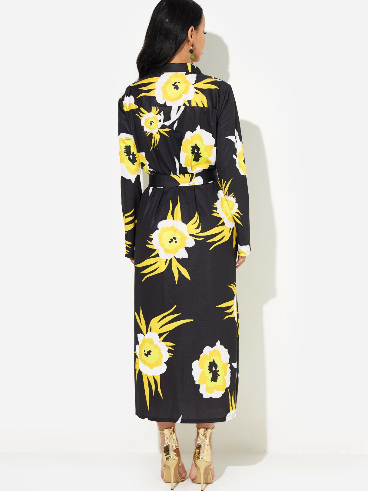 Black Classic Collar Long Sleeve Floral Print Self-Tie Slit Hem Dresses