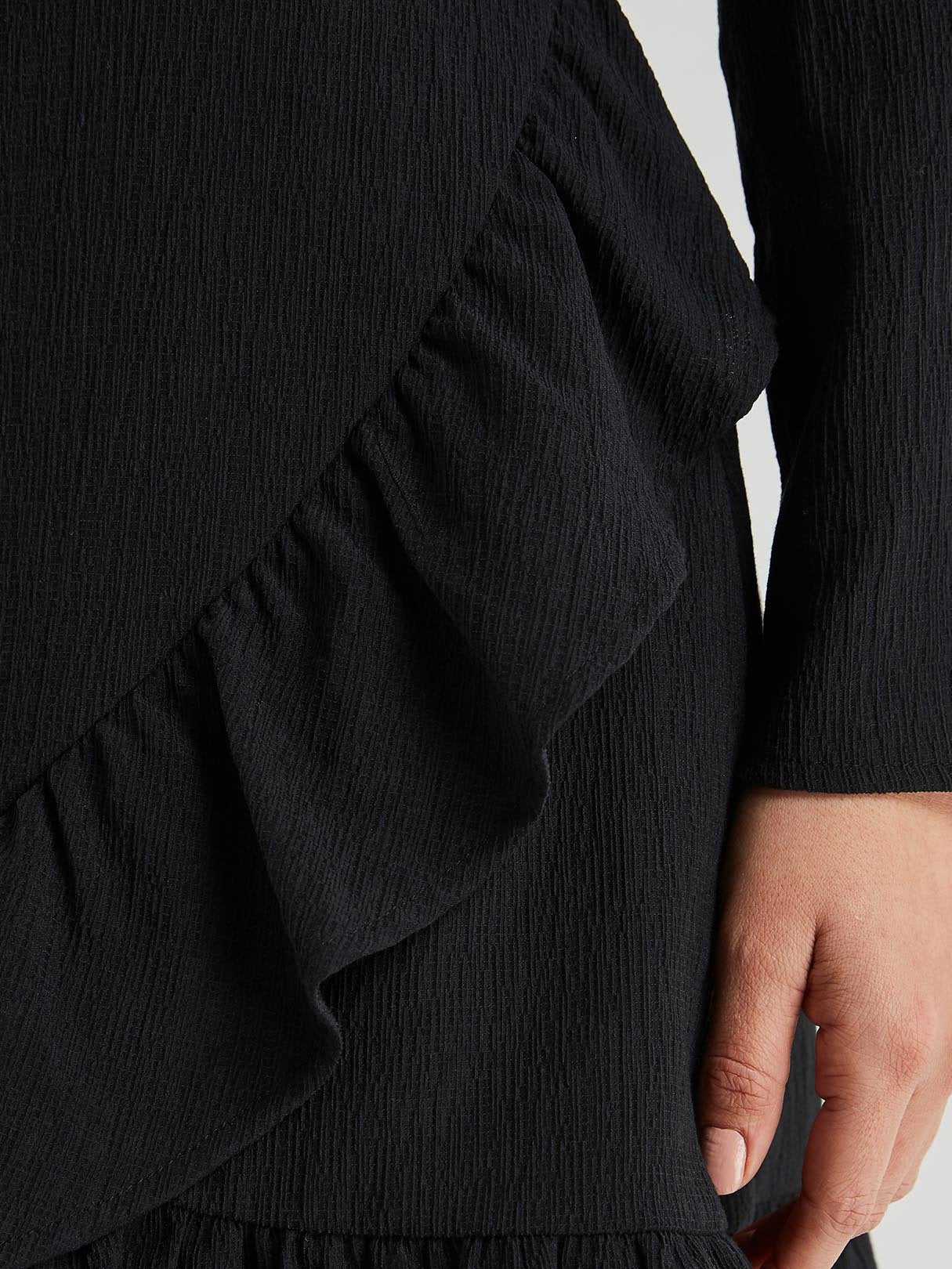 Black Deep V Neck Long Sleeve Wrap Flounced Hem Dresses
