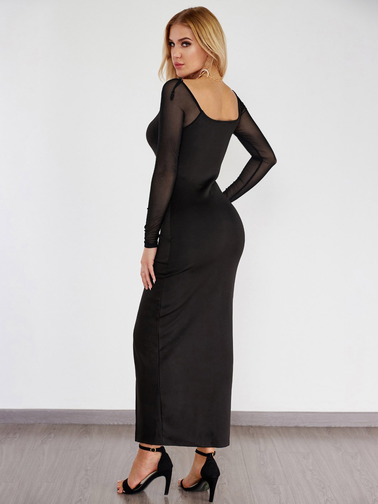 Black Deep V Neck Long Sleeve Zip Back See Through Slit Hem Maxi Dress - Black / S is backordered and will ship as soon as it is back in stock.