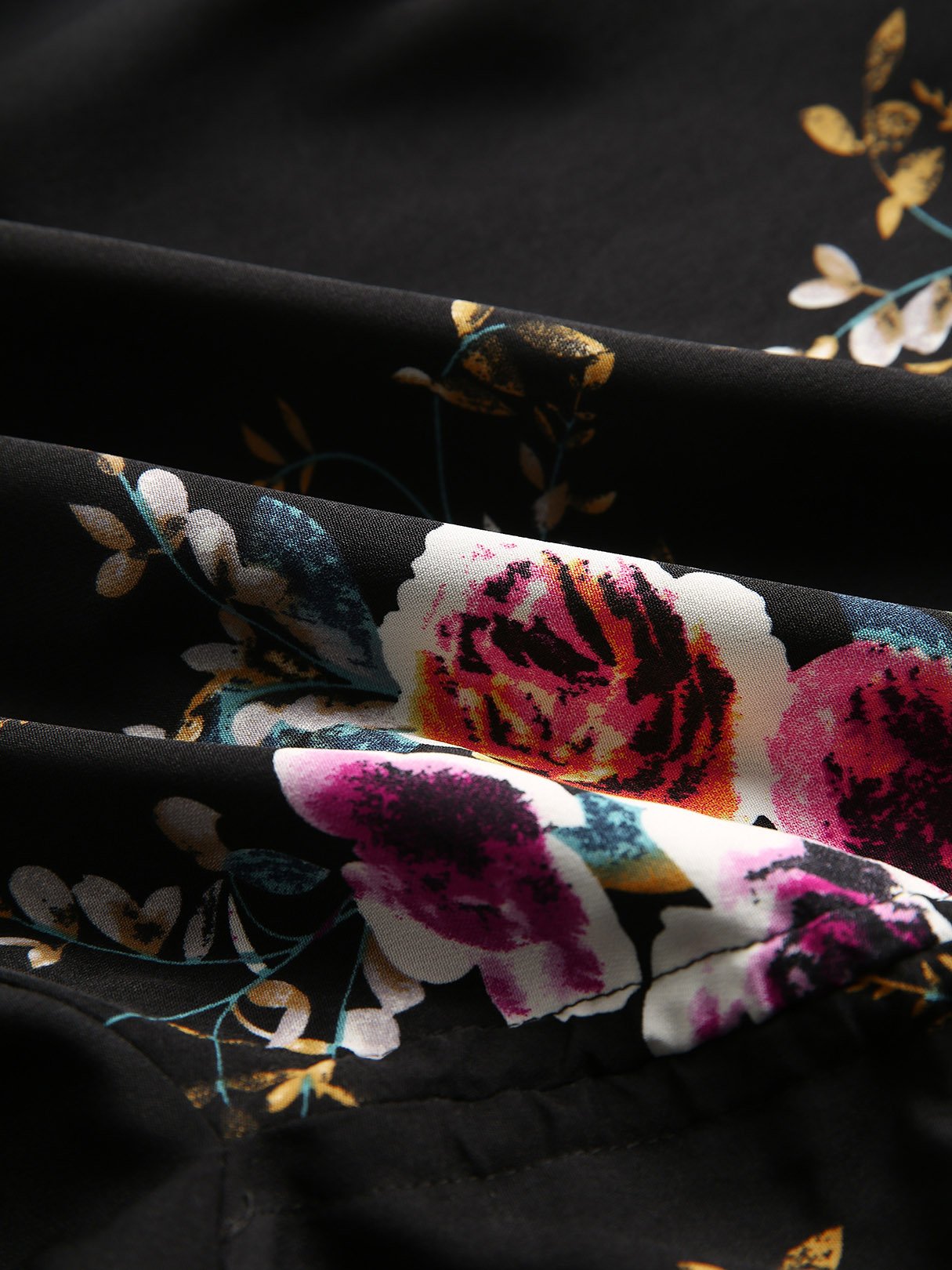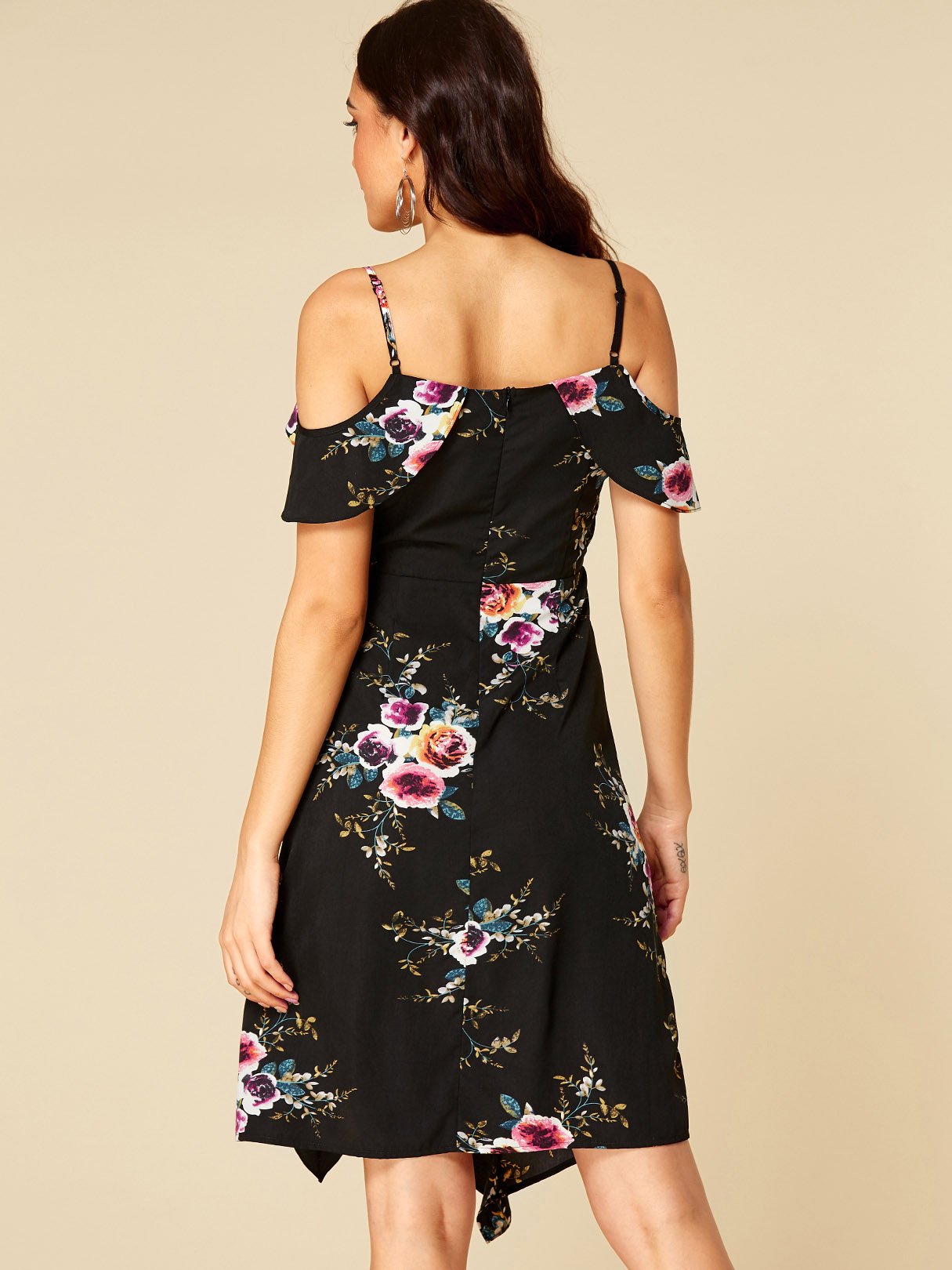 Black Deep V Neck Short Sleeve Floral Print Slit Spaghetti Strap Wrap Flounced Hem Dresses