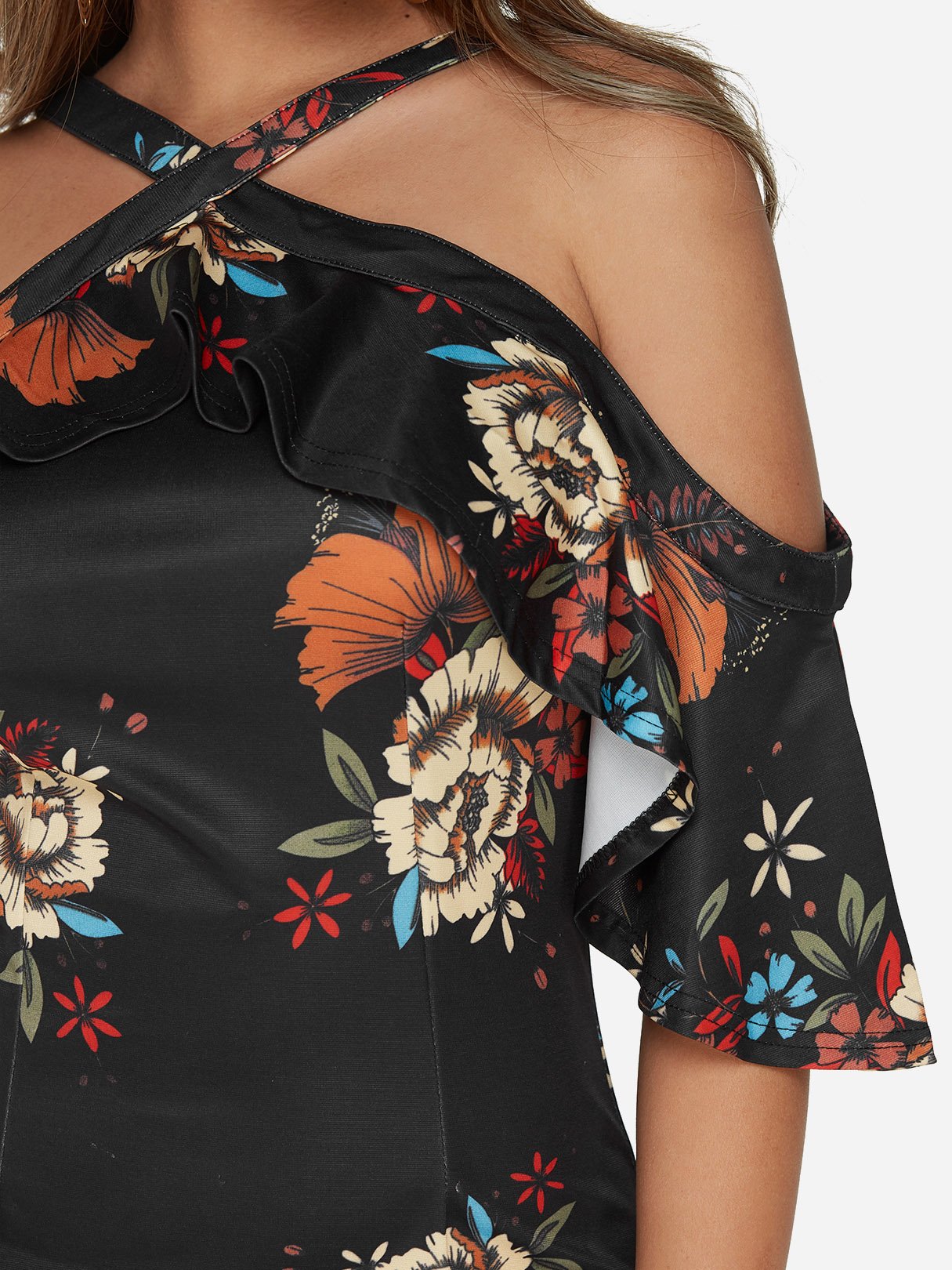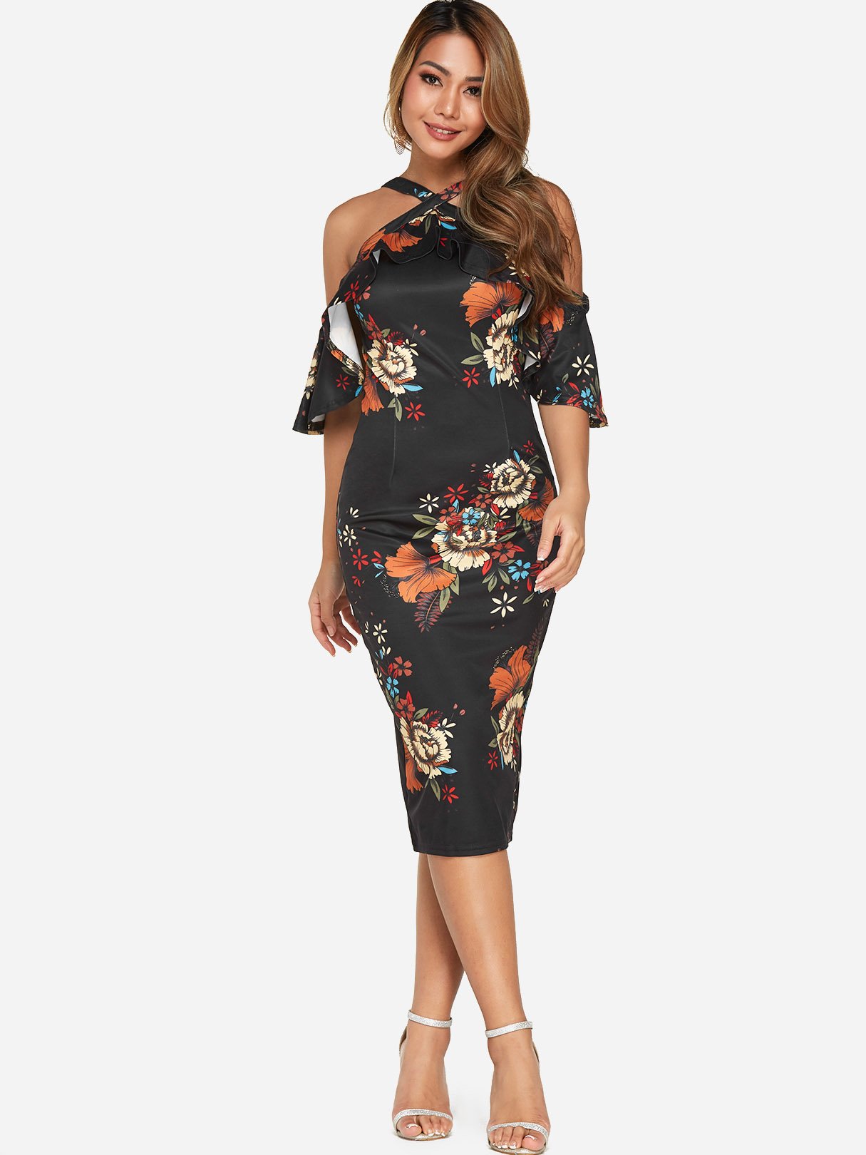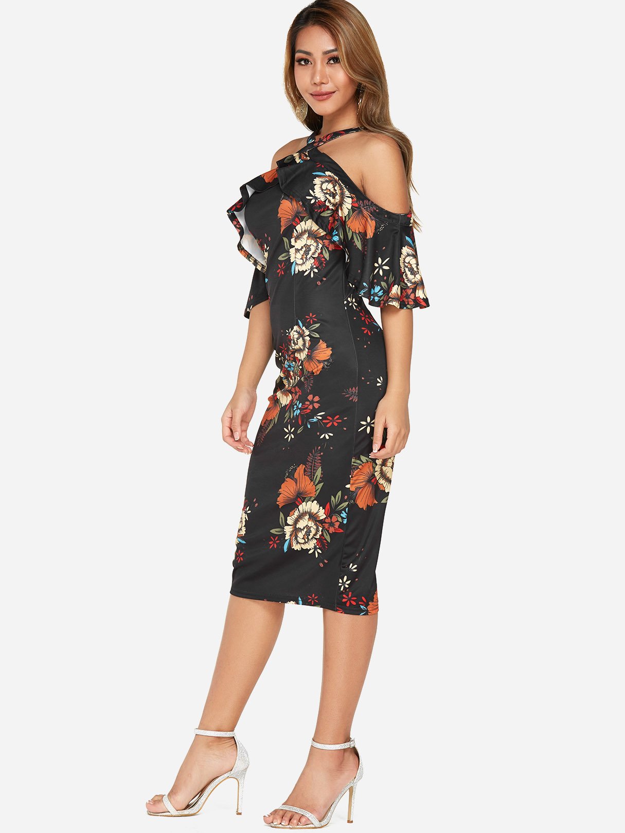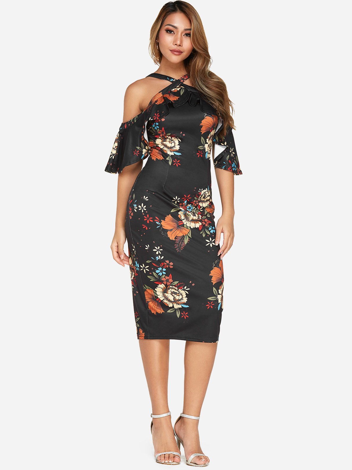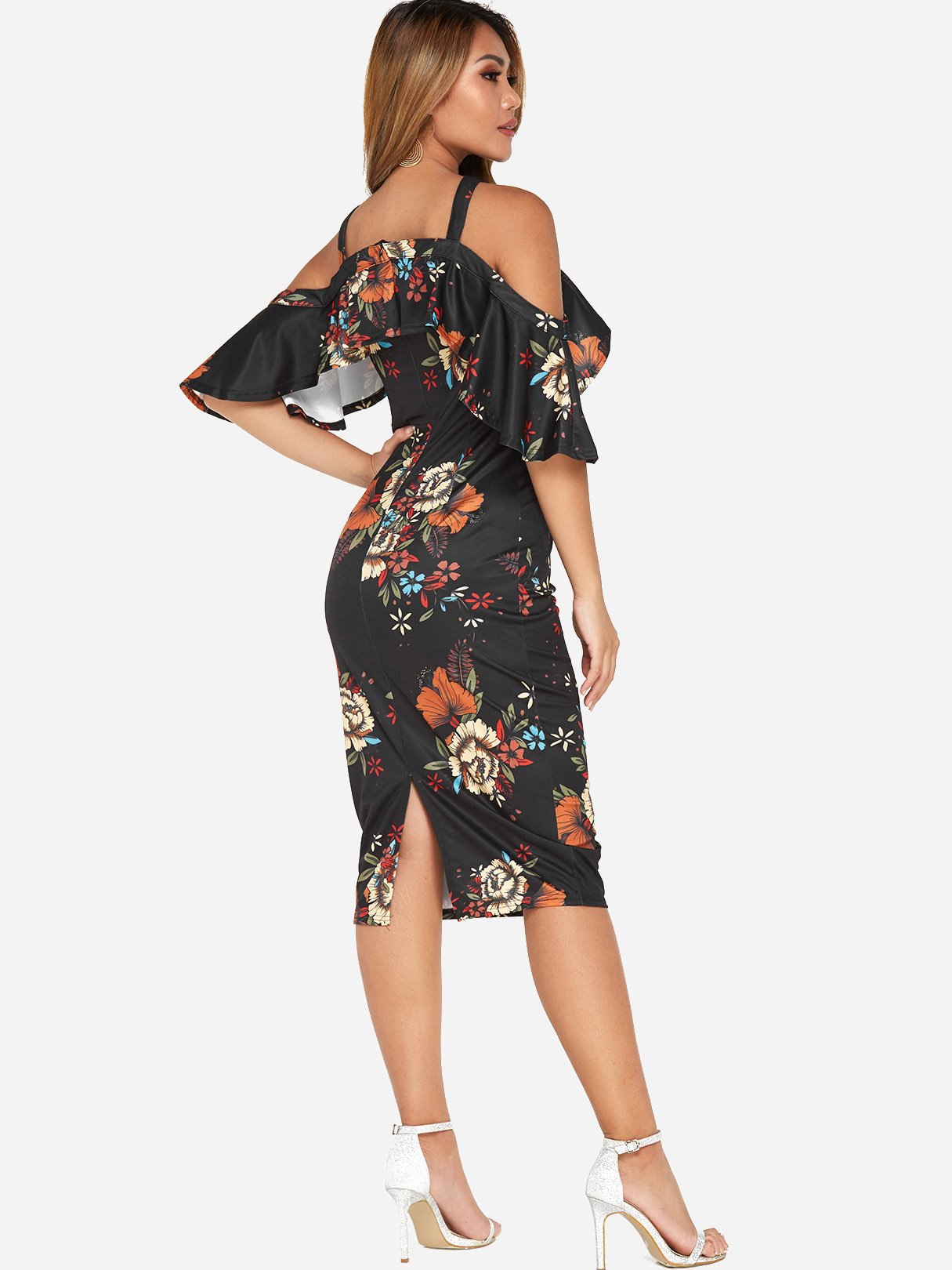Black Half Sleeve Floral Print Slit Hem Dresses