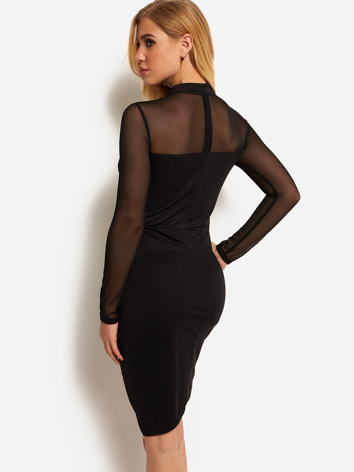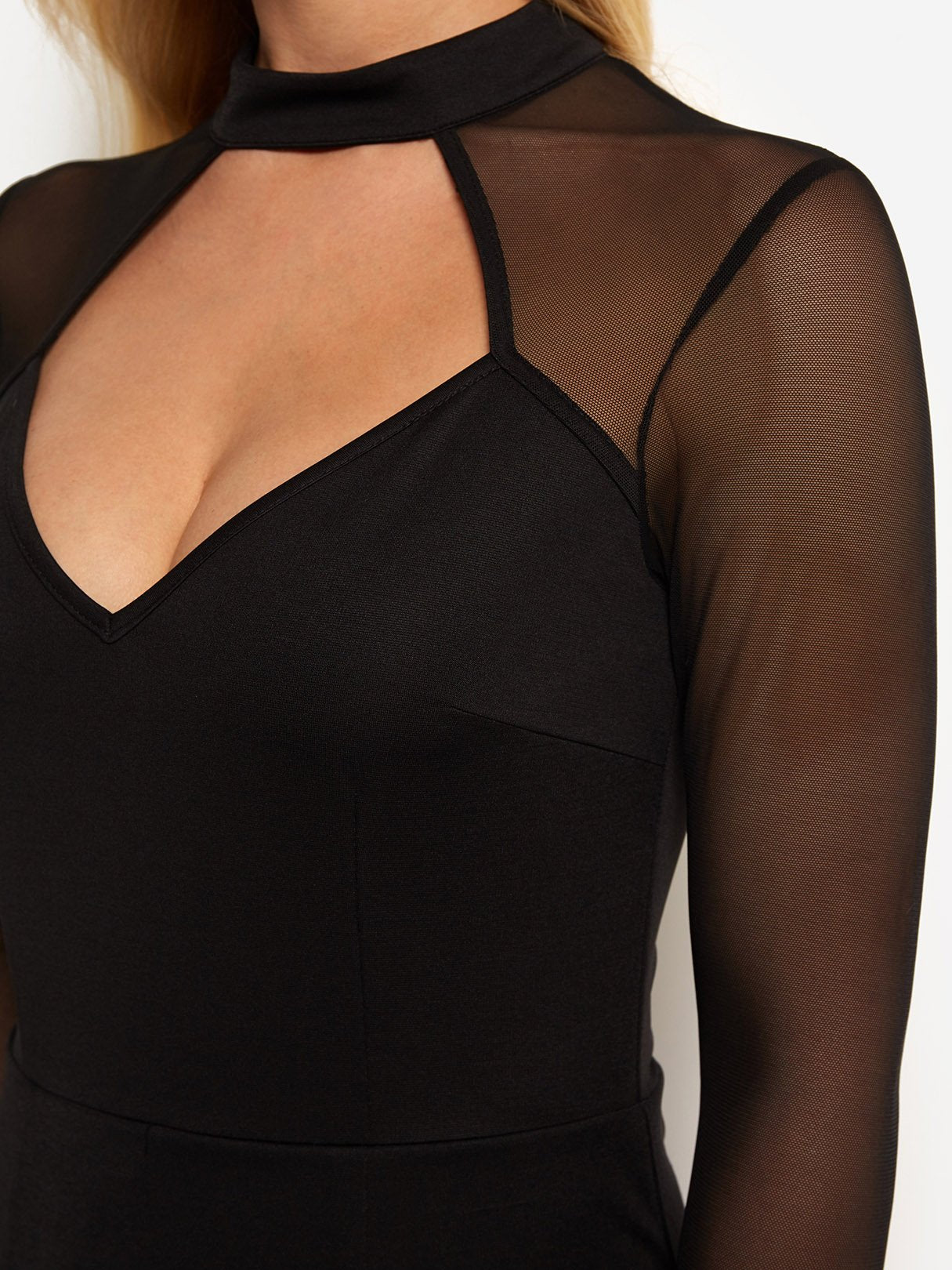 Black Halter Long Sleeve Plain Cut Out See Through Irregular Hem Sexy Dress