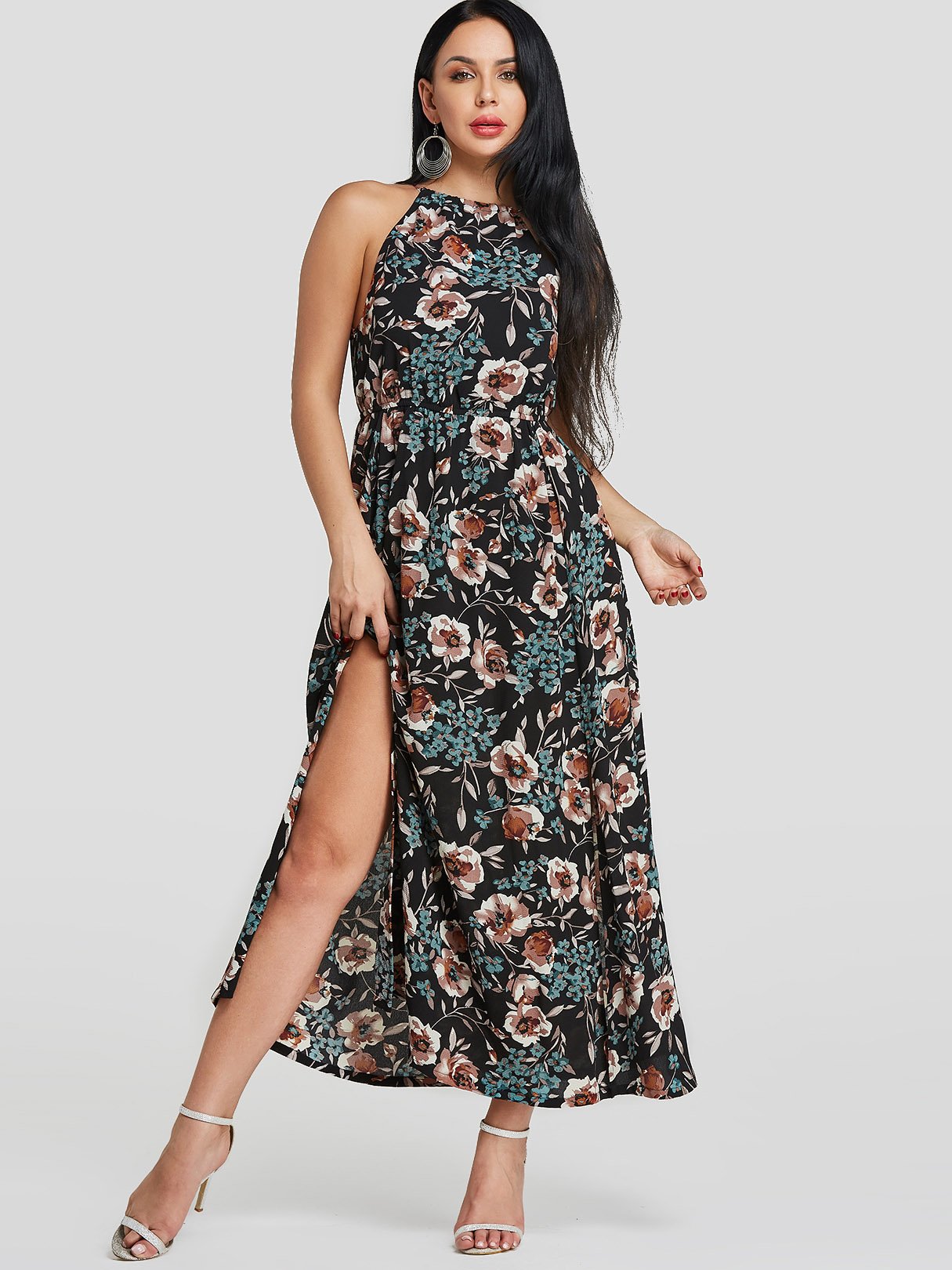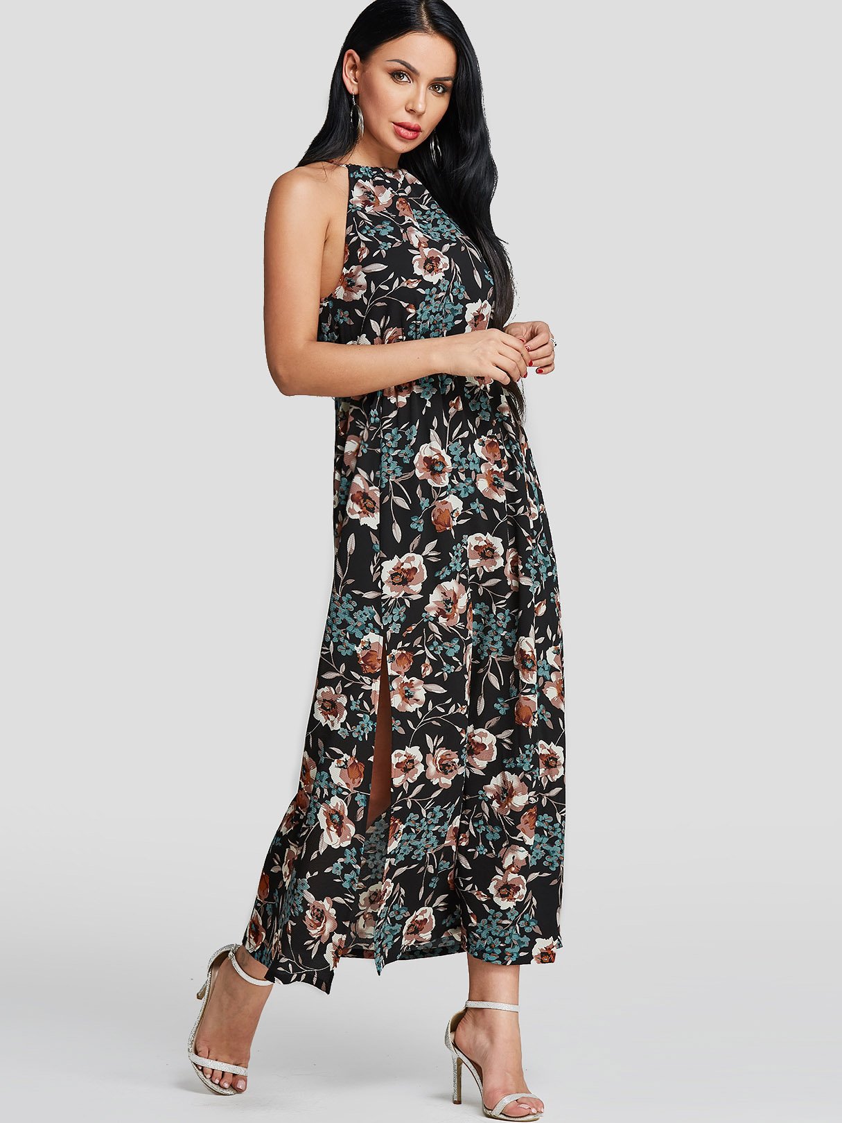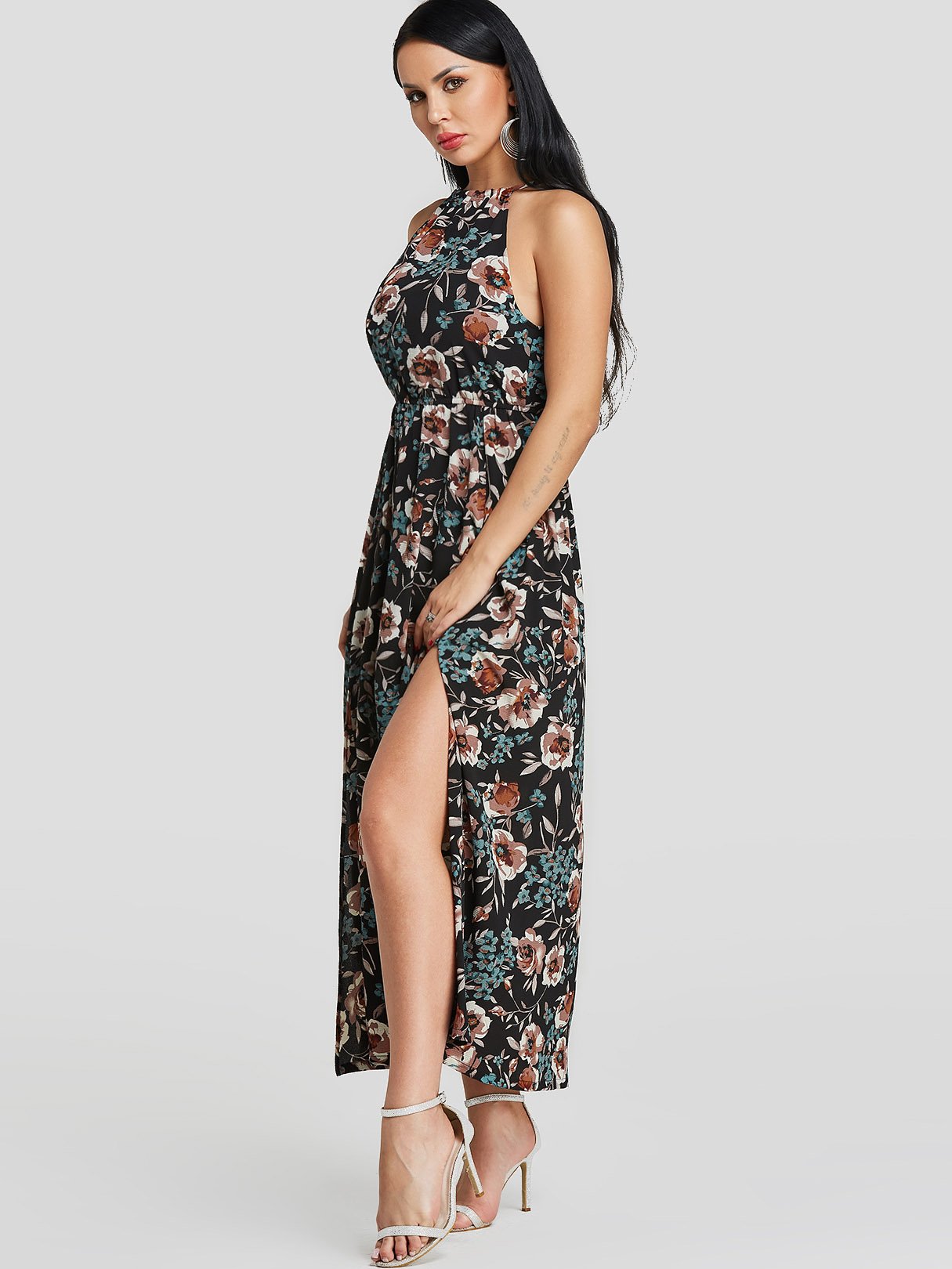 Black Halter Sleeveless Floral Print Slit Hem Dresses