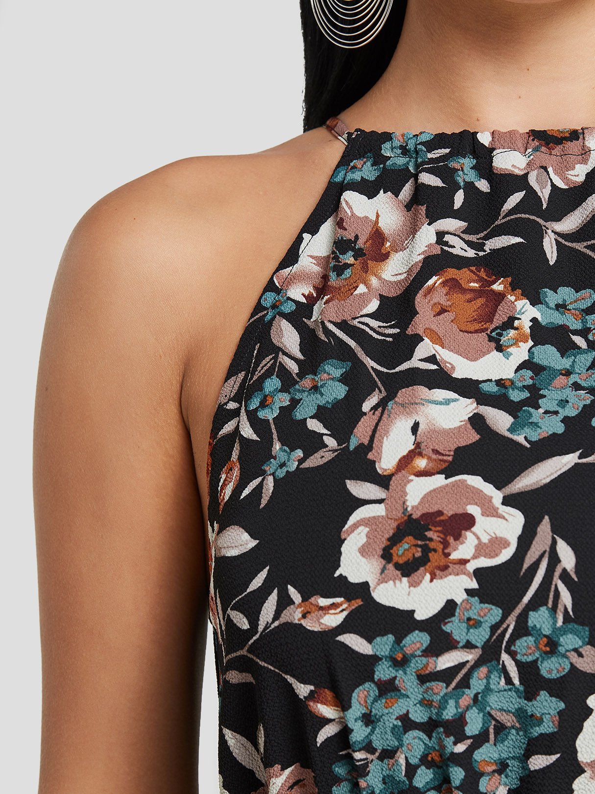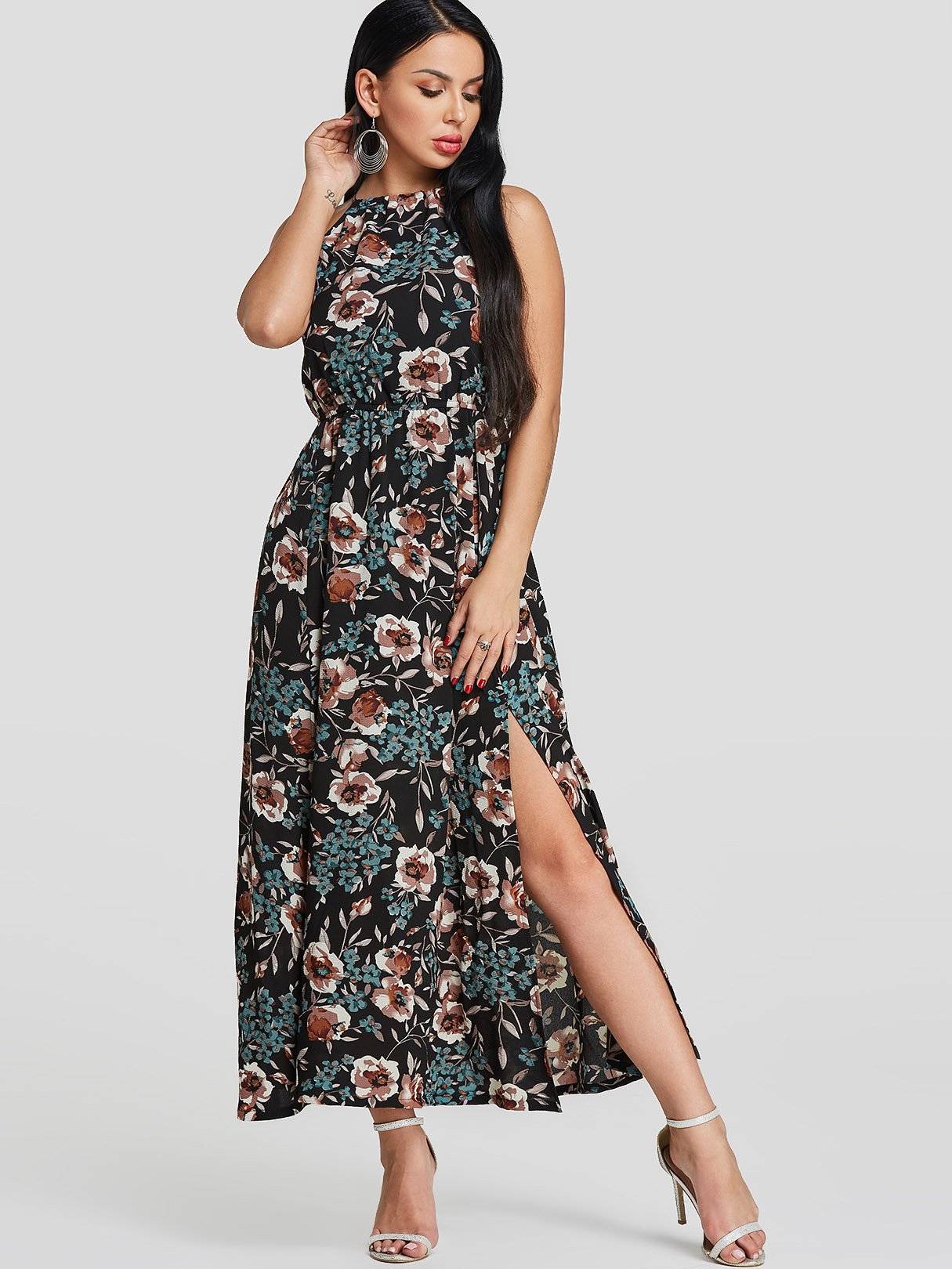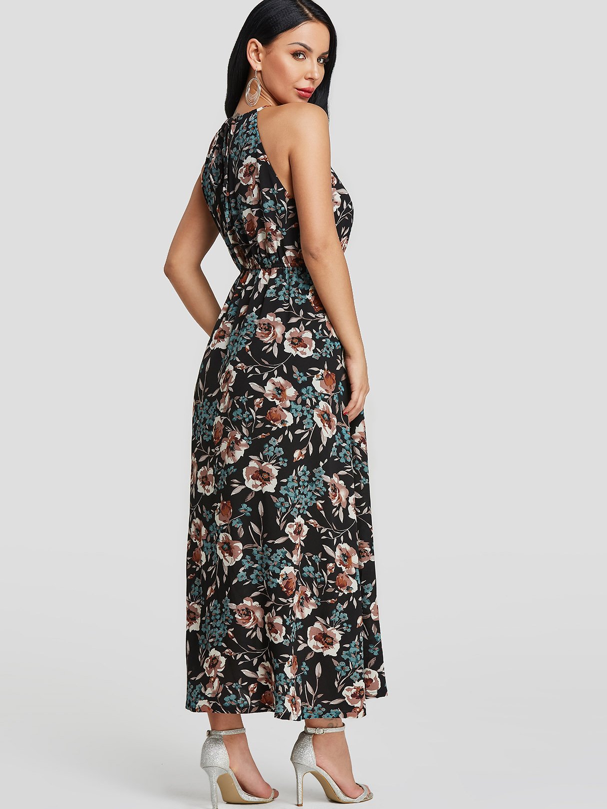 Black Halter Sleeveless Floral Print Slit Hem Dresses