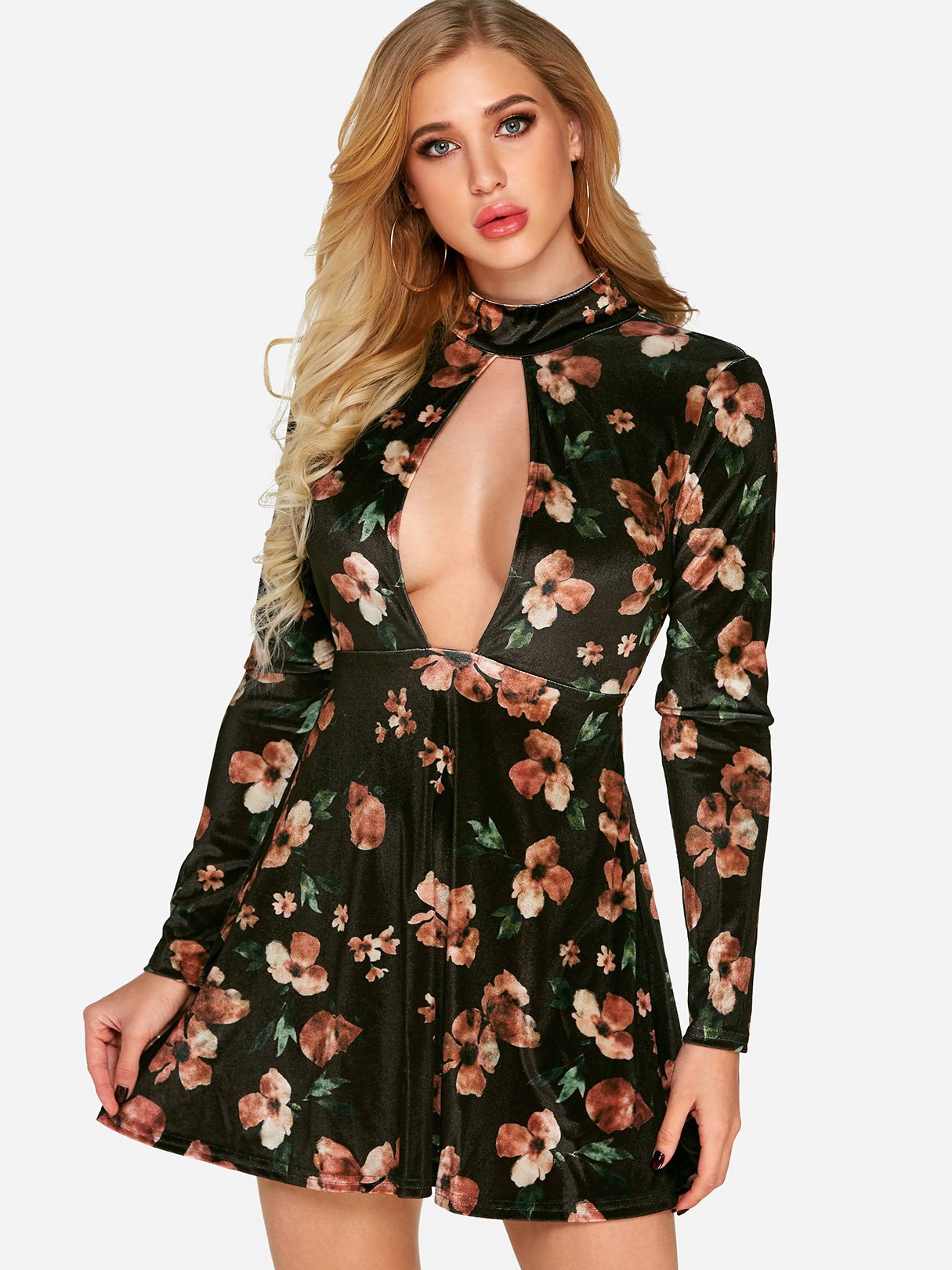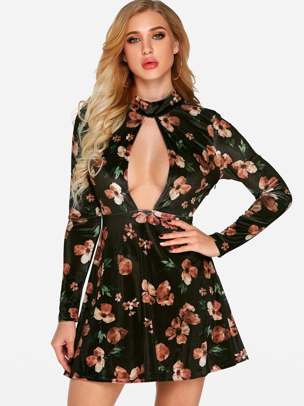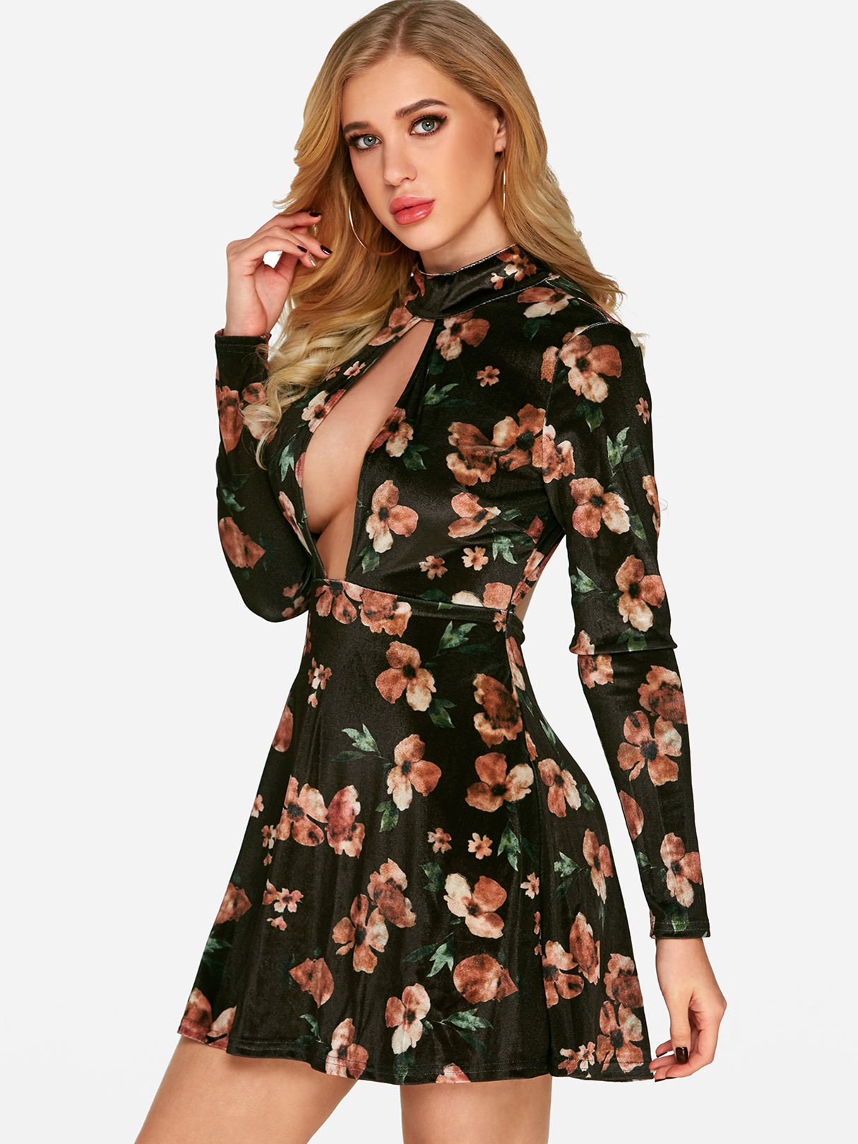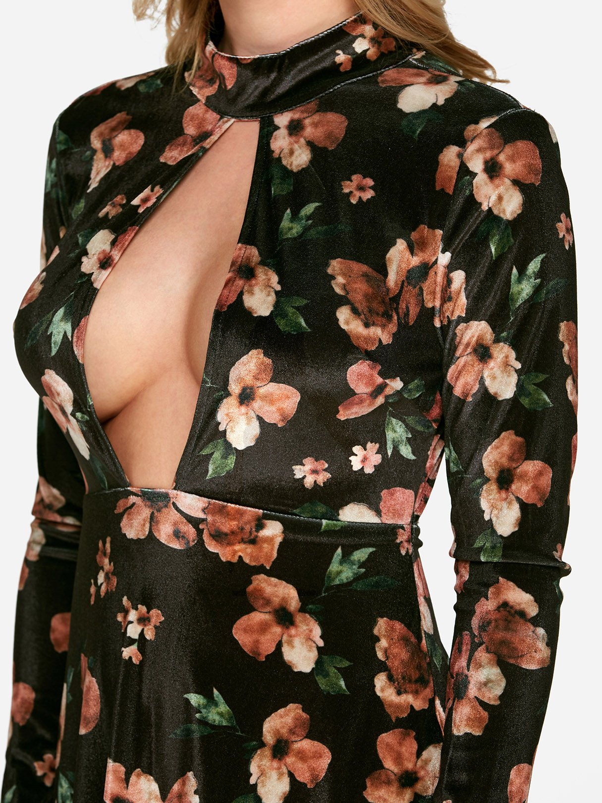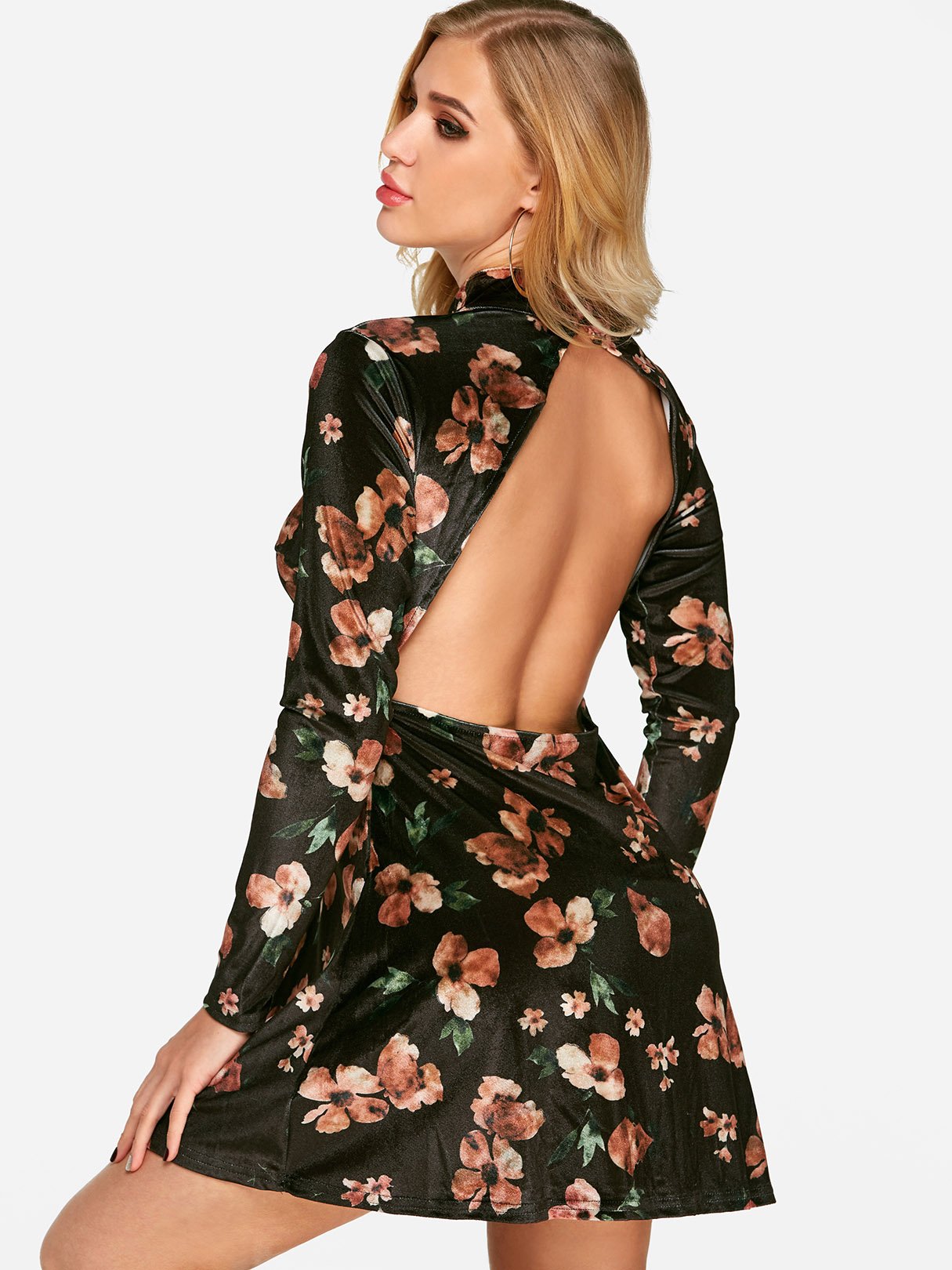 Black Long Sleeve Floral Print Zip Back Backless Cut Out Dress