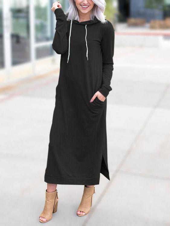 Black Pullover Long Sleeve Plain Side Pockets Hooded Slit Maxi Dress