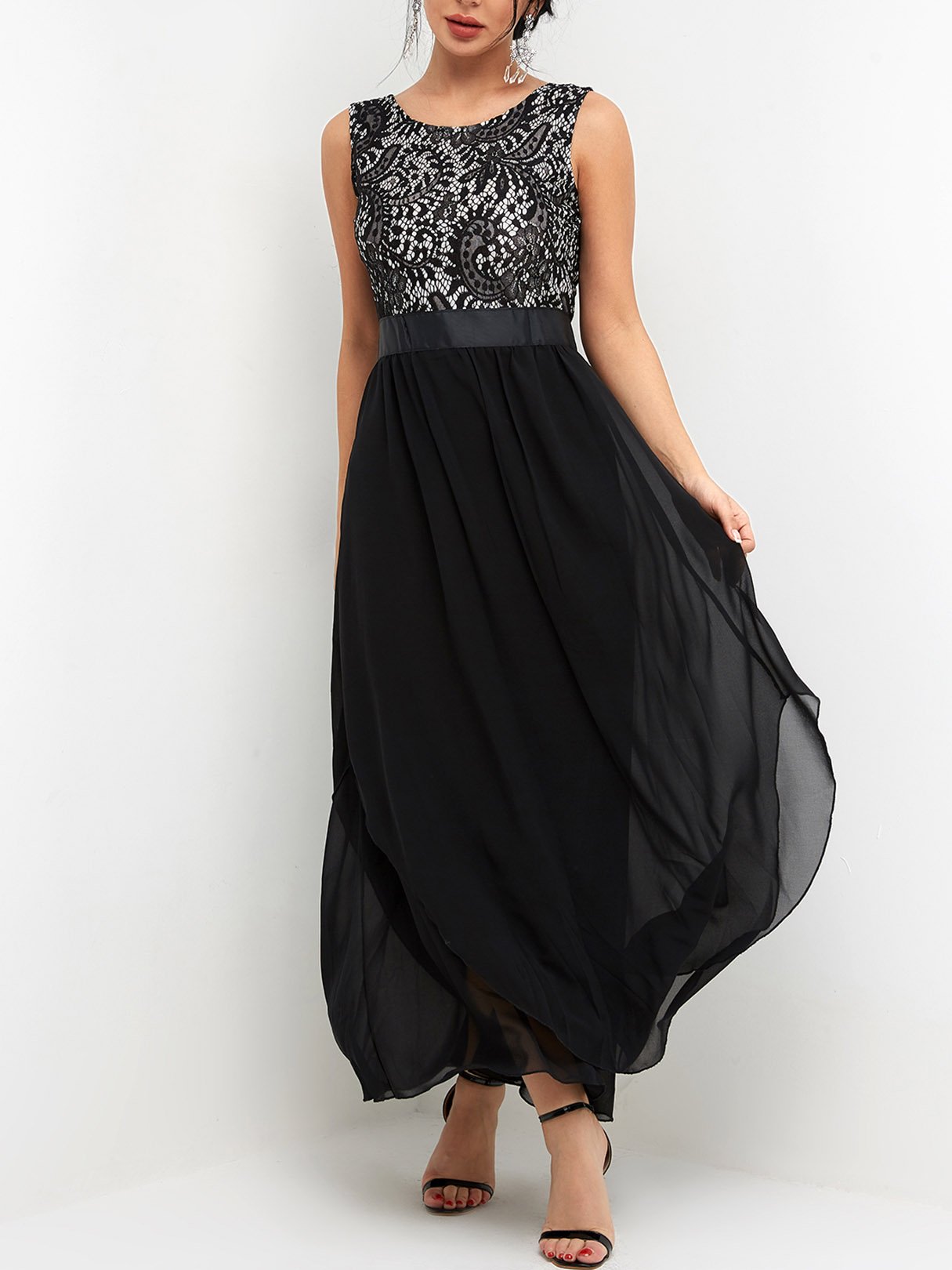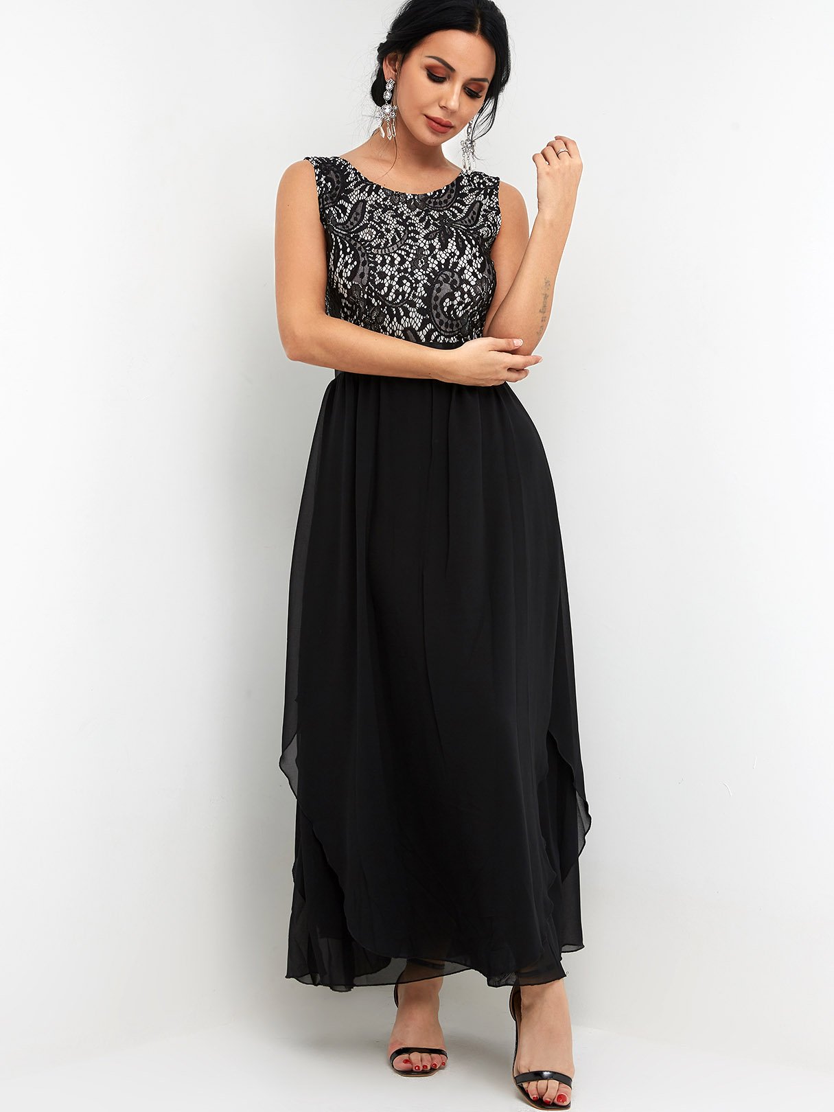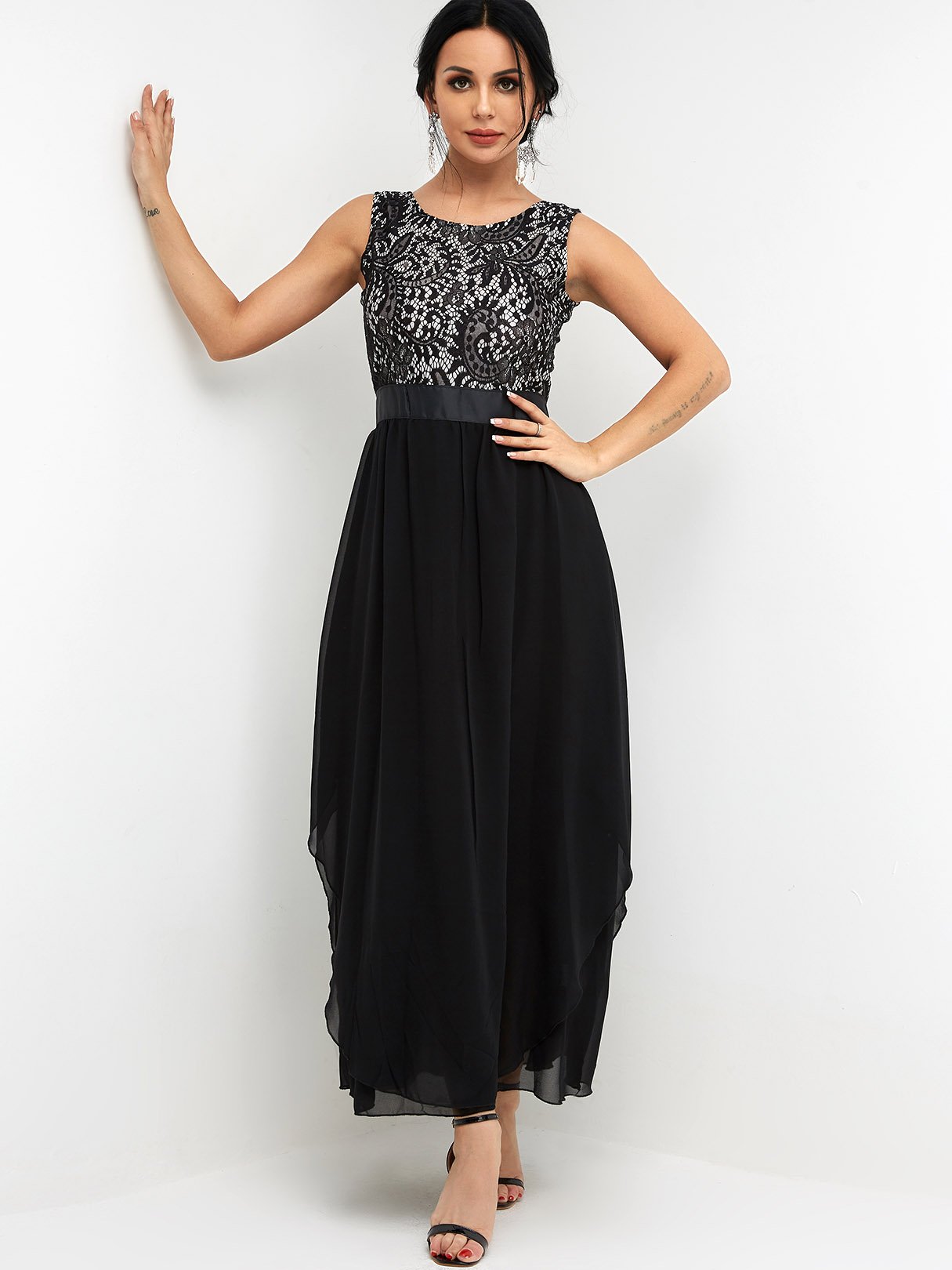 Black Round Neck Sleeveless Lace Partially Lined Flounced Hem High-Waisted Maxi Dresses