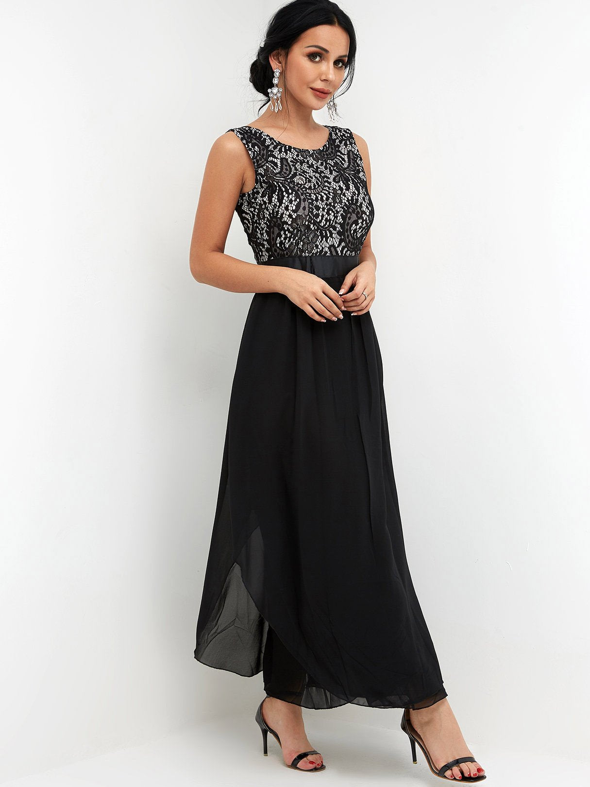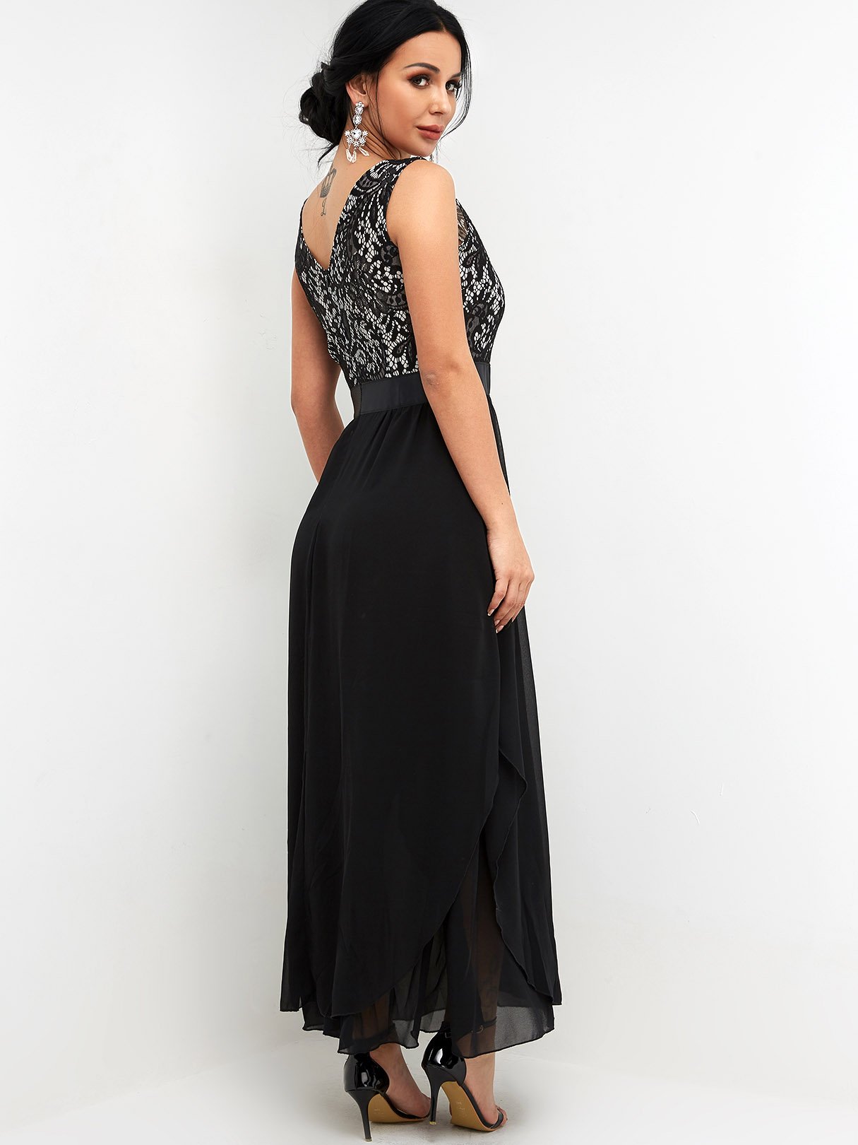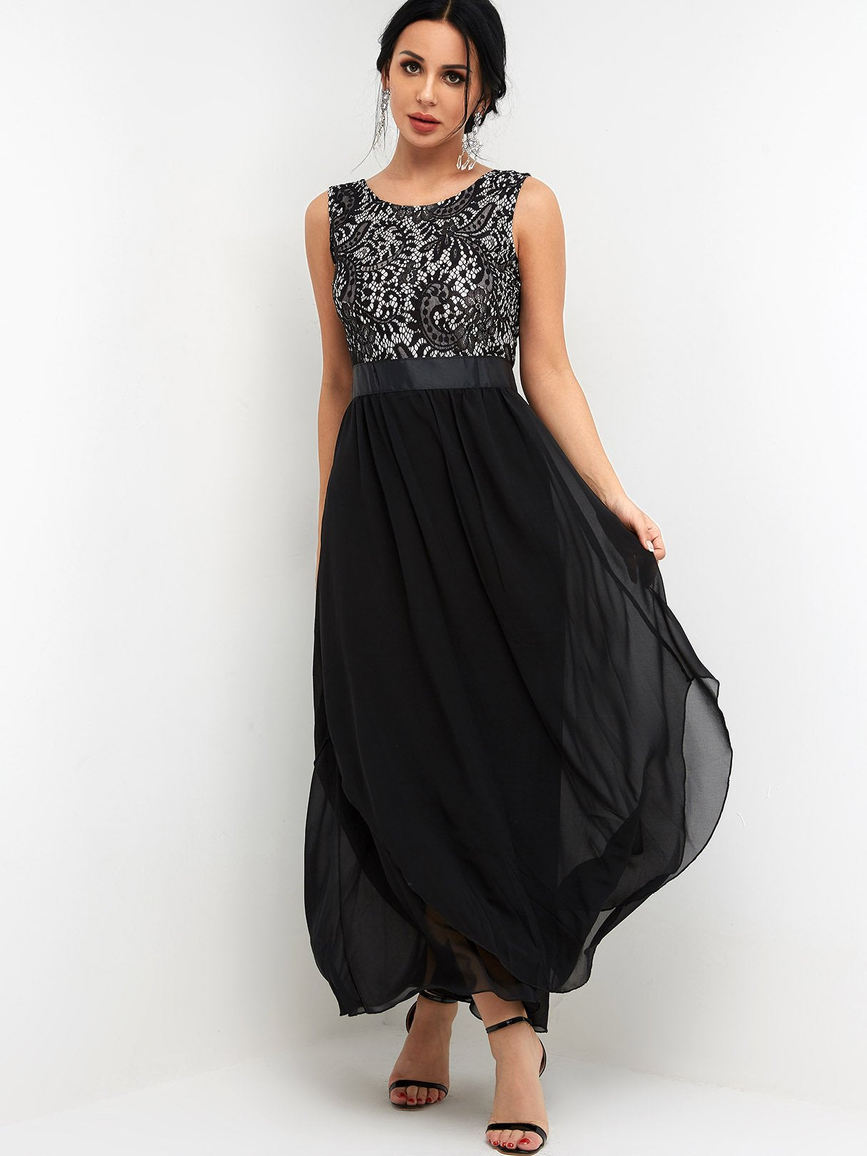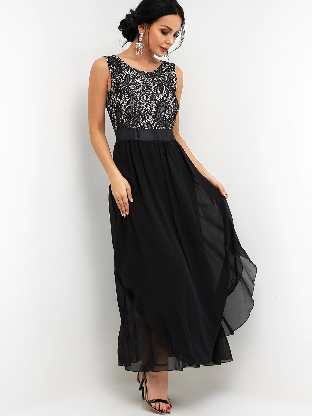 Black Round Neck Sleeveless Lace Partially Lined Flounced Hem High-Waisted Maxi Dresses