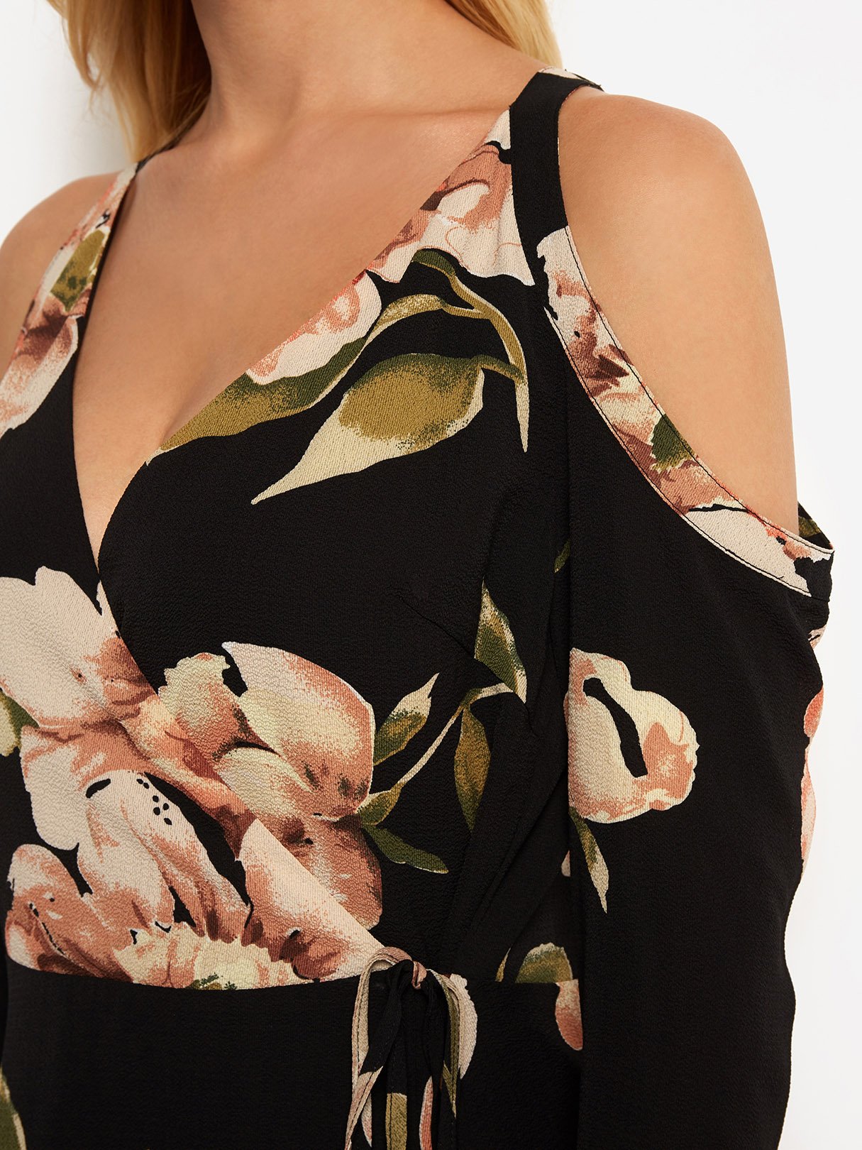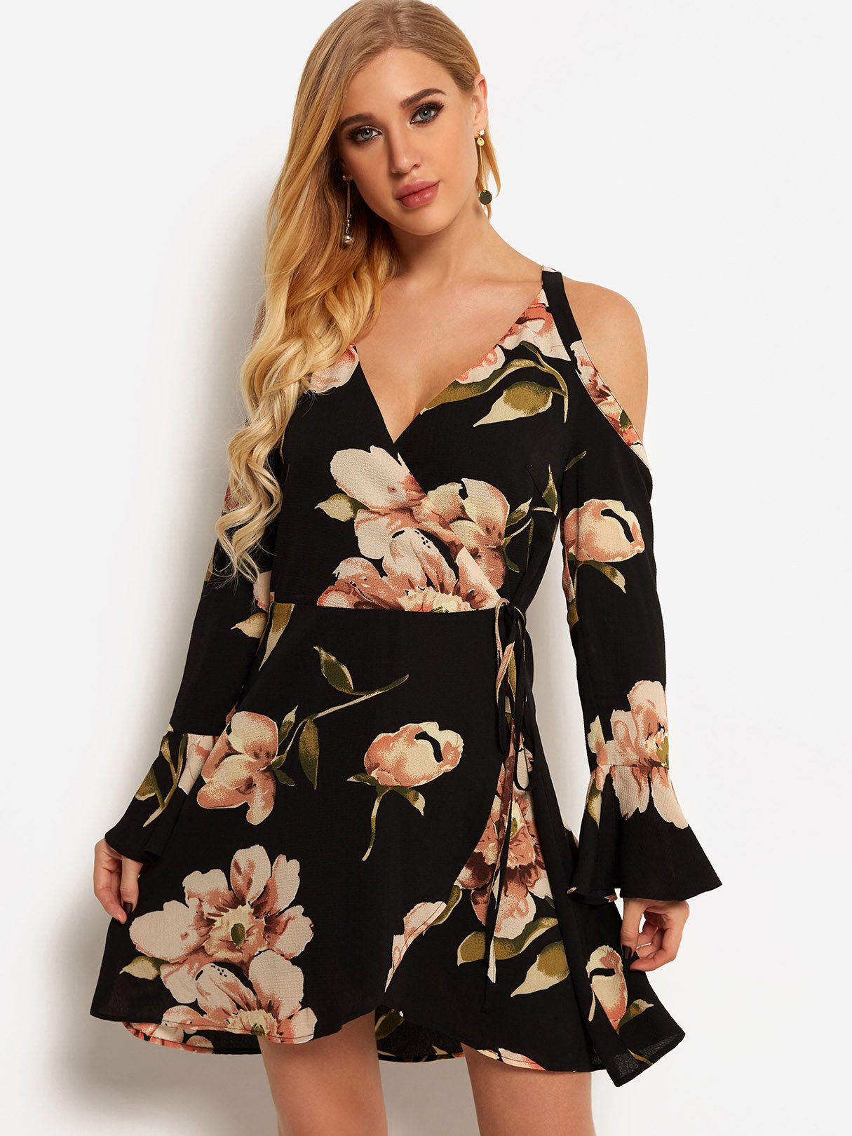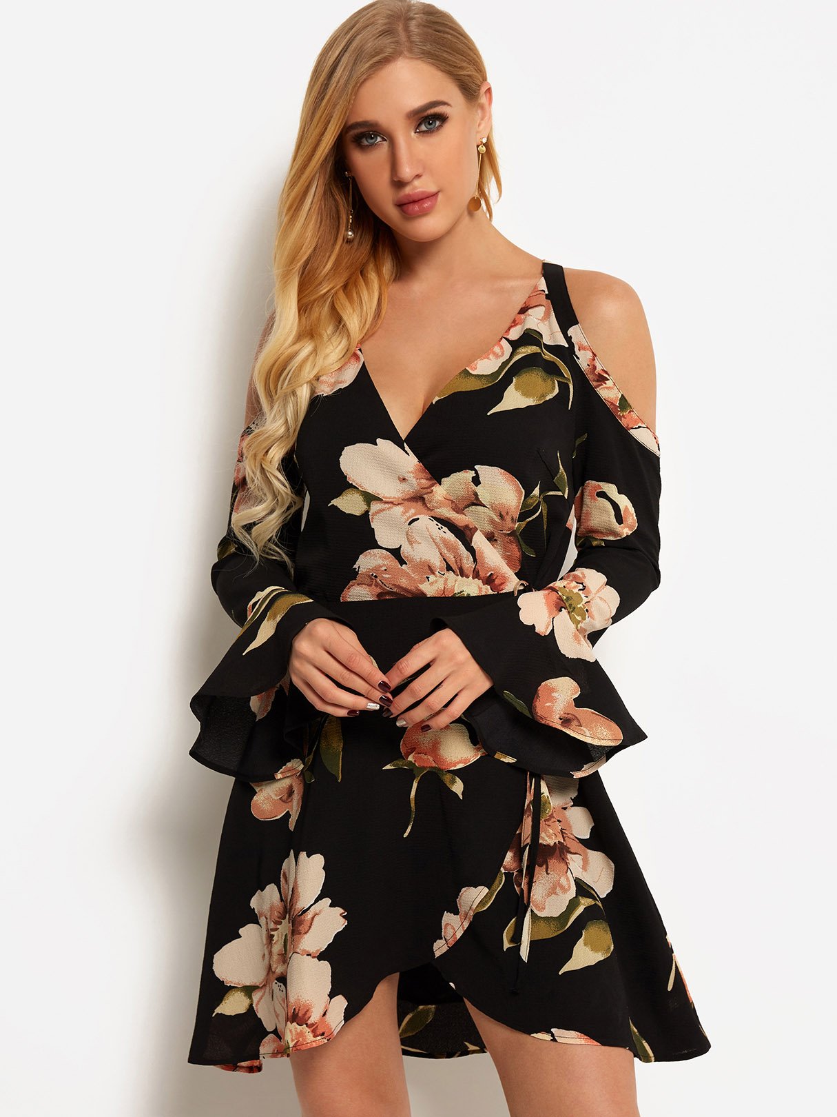 Black V-Neck Cold Shoulder Long Sleeve Floral Print Self-Tie Criss-Cross Flounced Hem Dresses