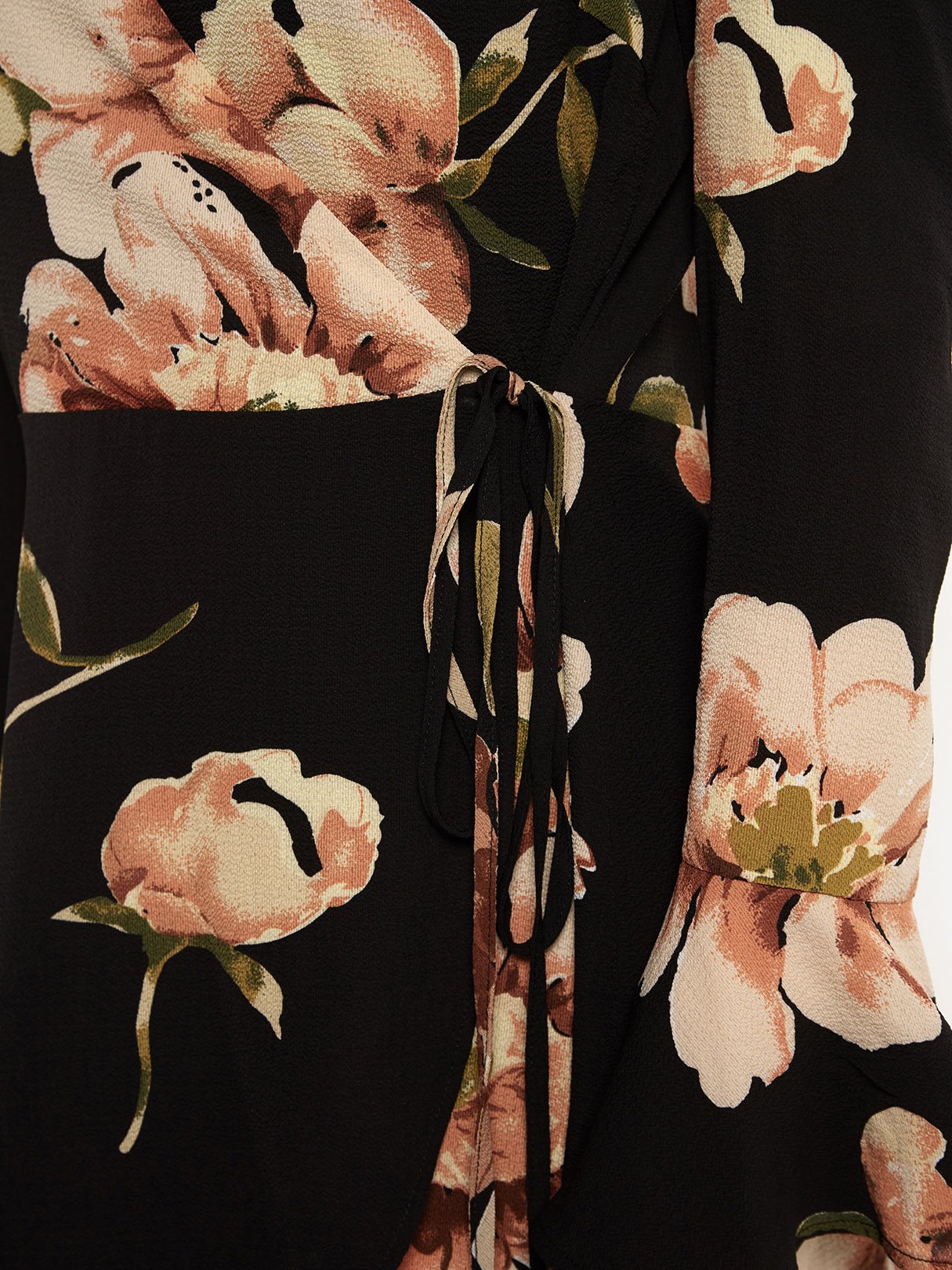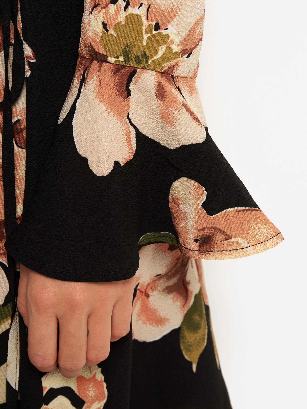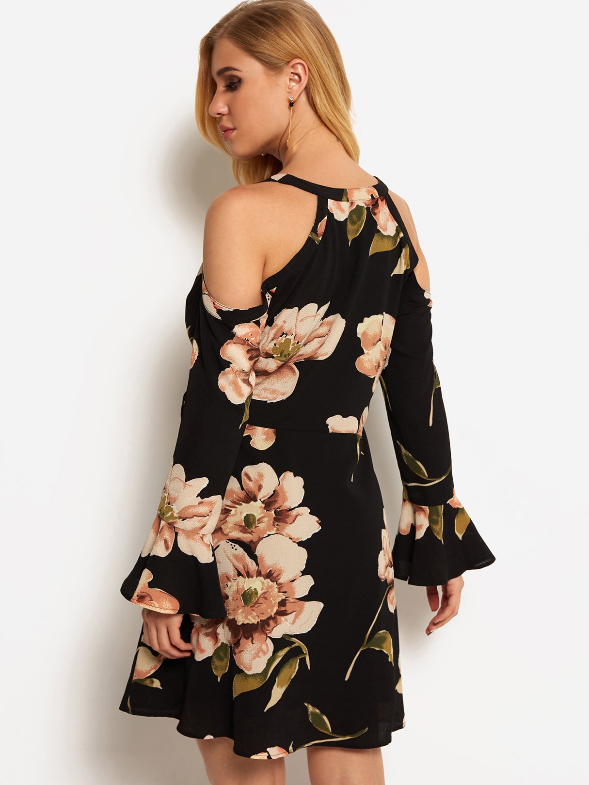Black V-Neck Cold Shoulder Long Sleeve Floral Print Self-Tie Criss-Cross Flounced Hem Dresses