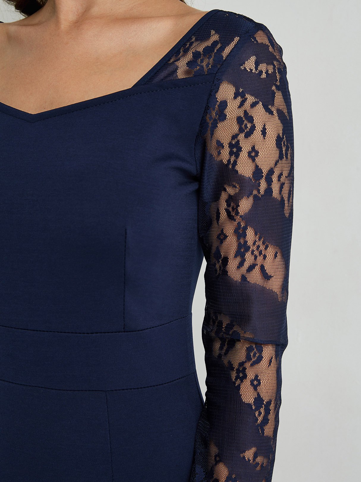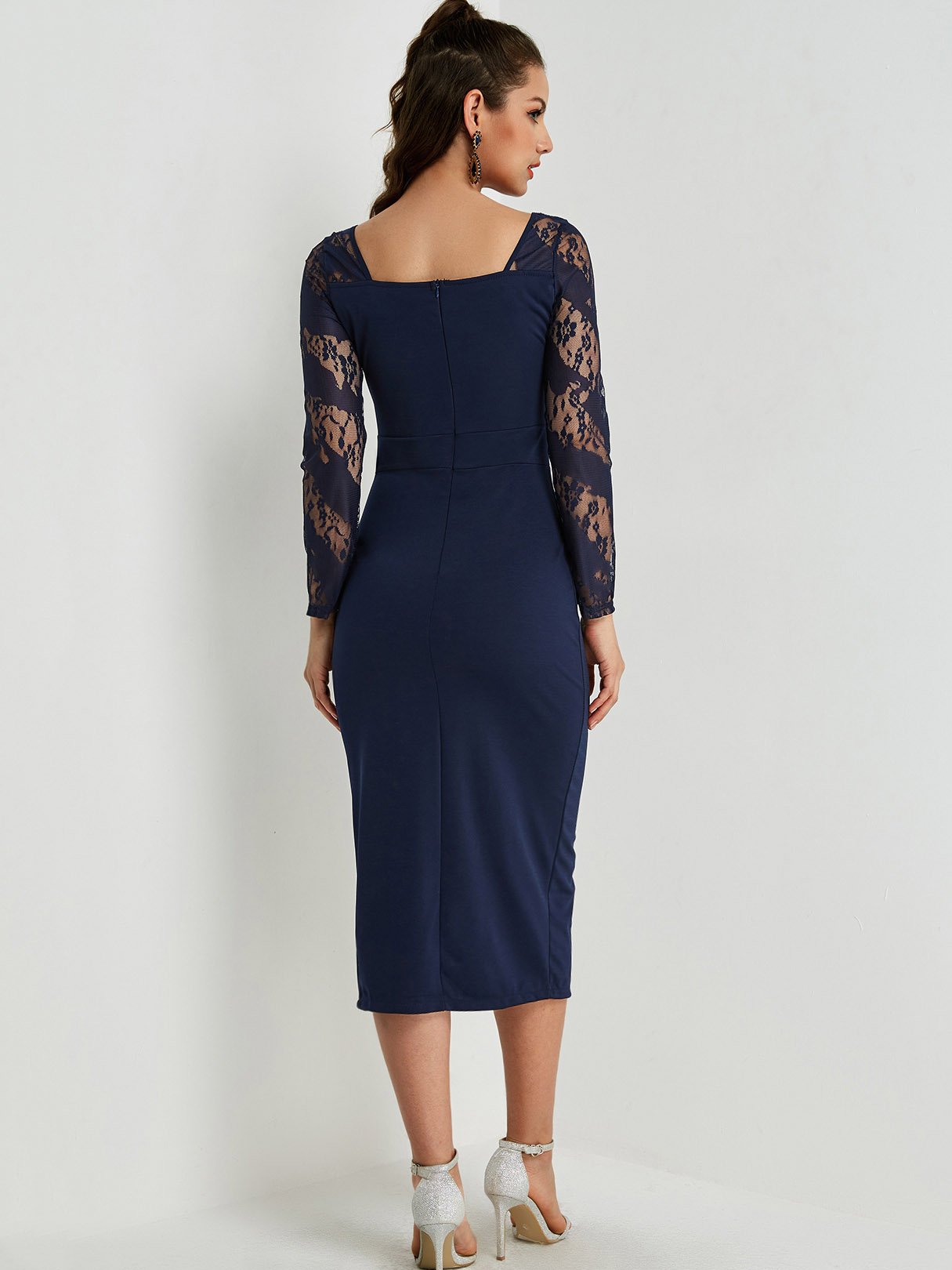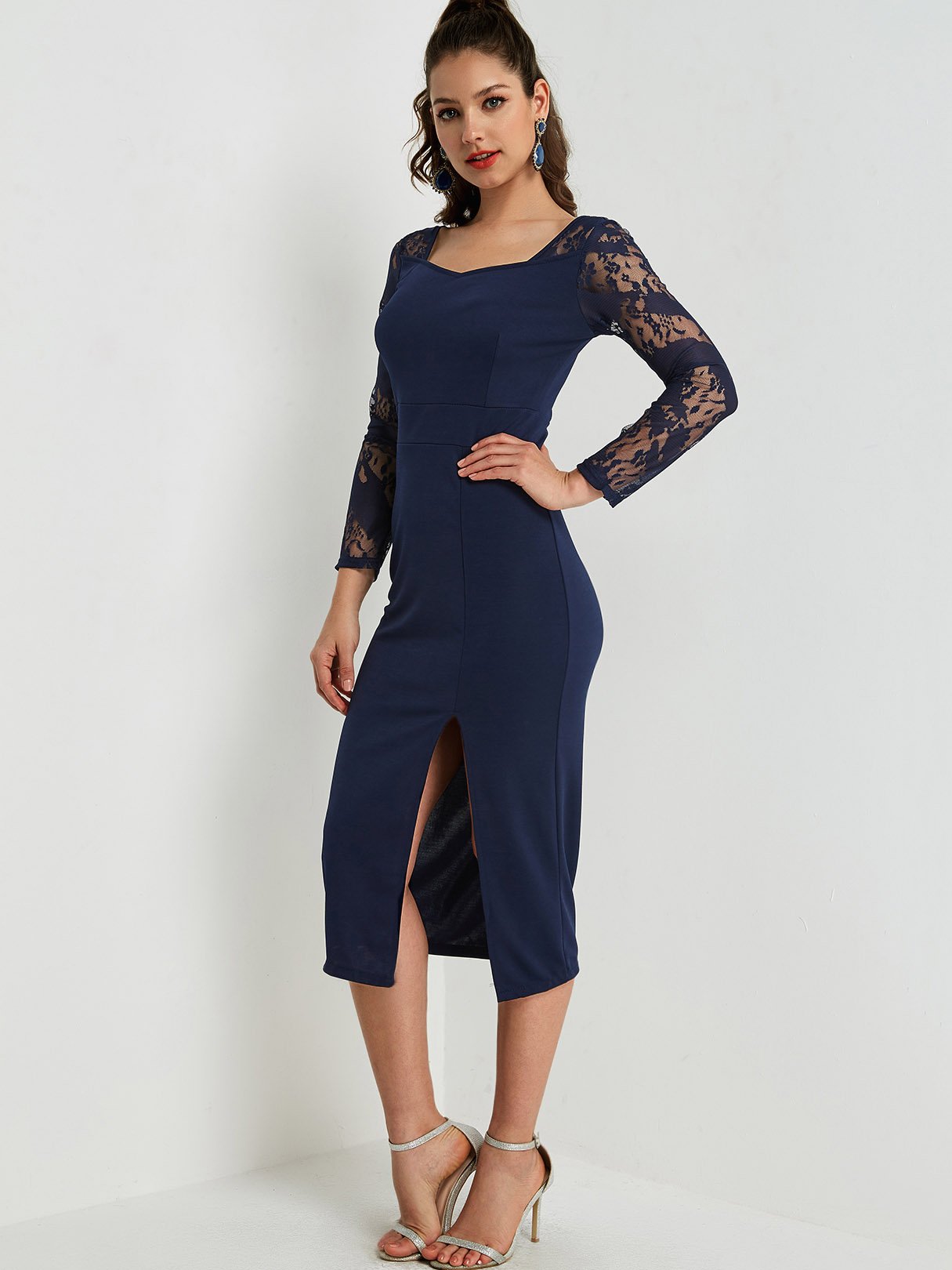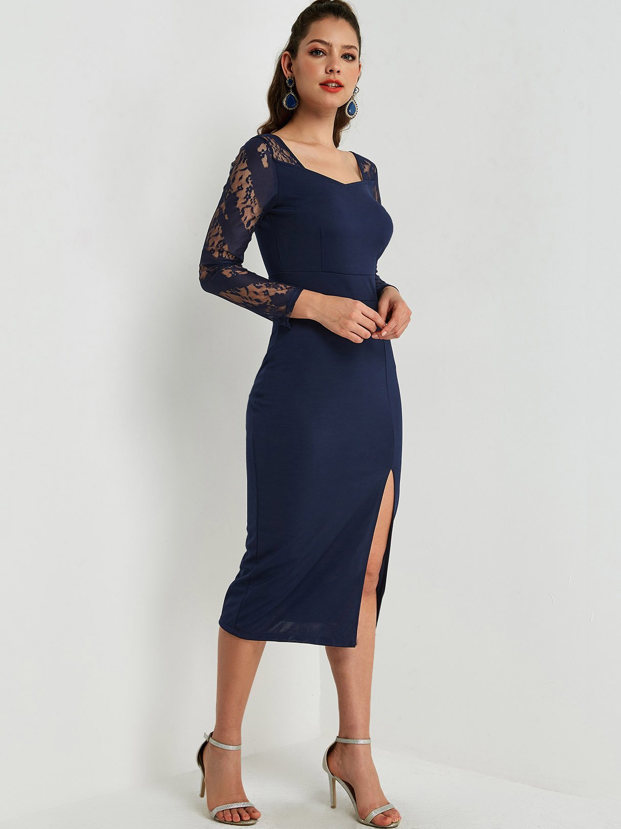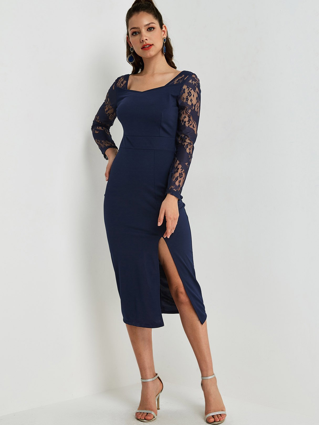 Blue Square Neck Long Sleeve Lace Slit Hem Sexy Dresses