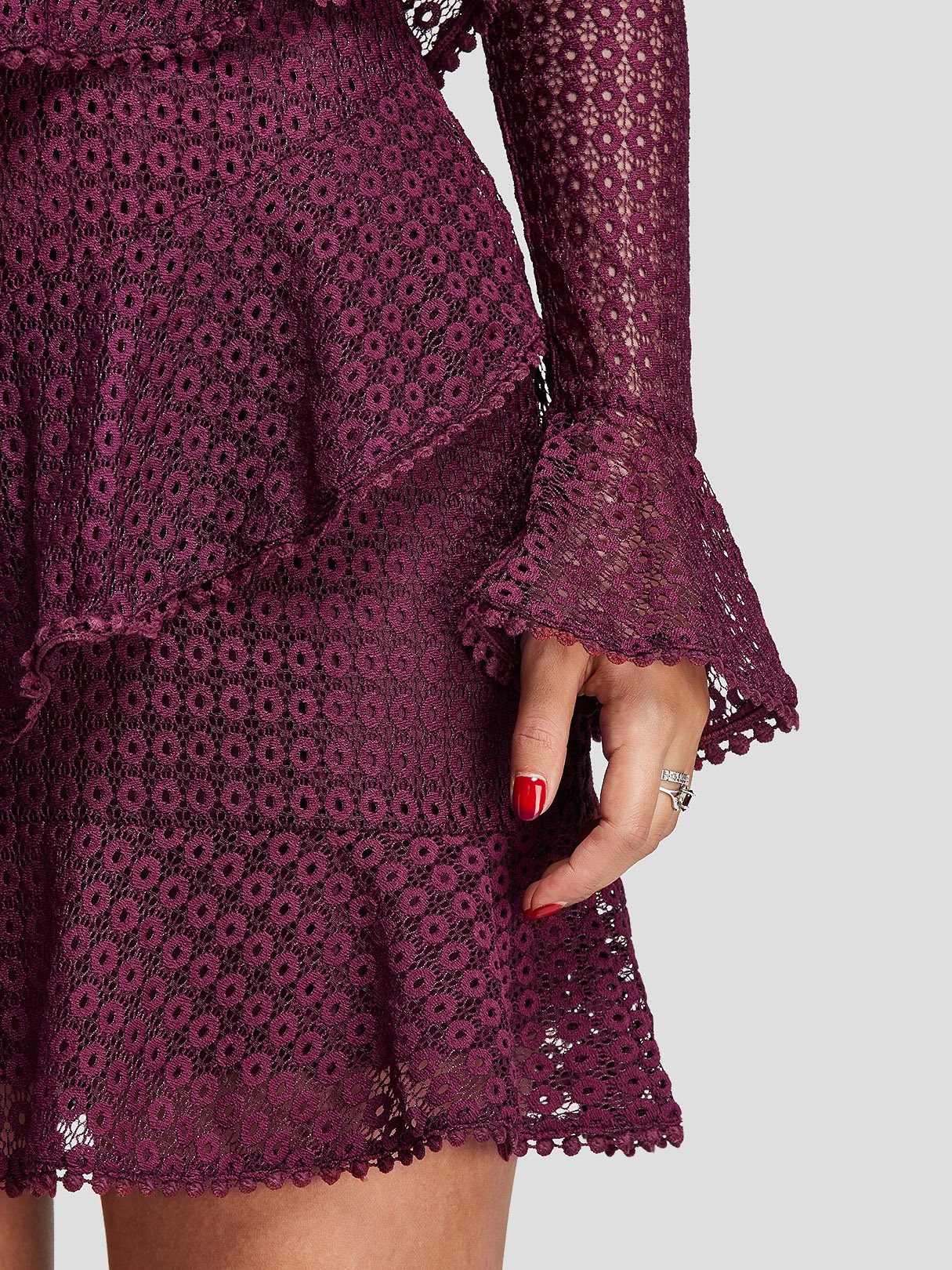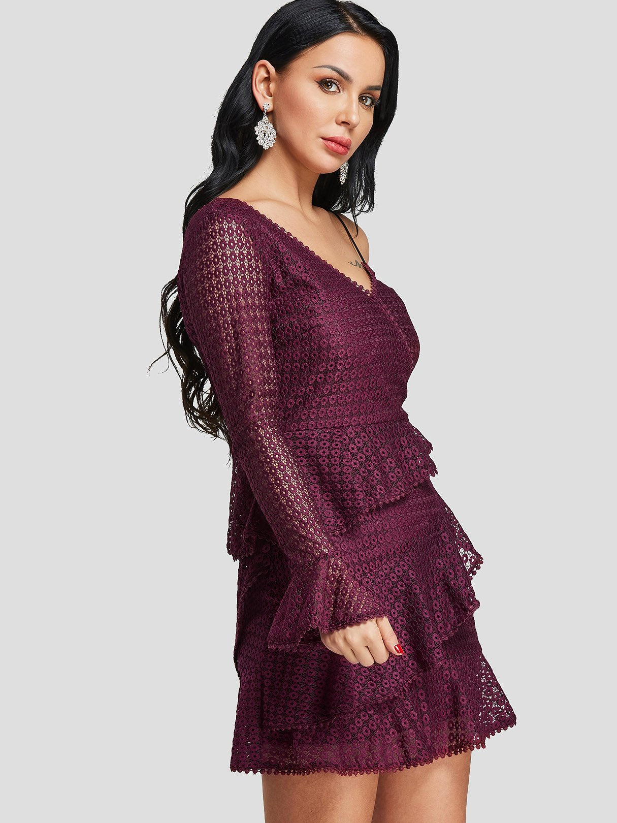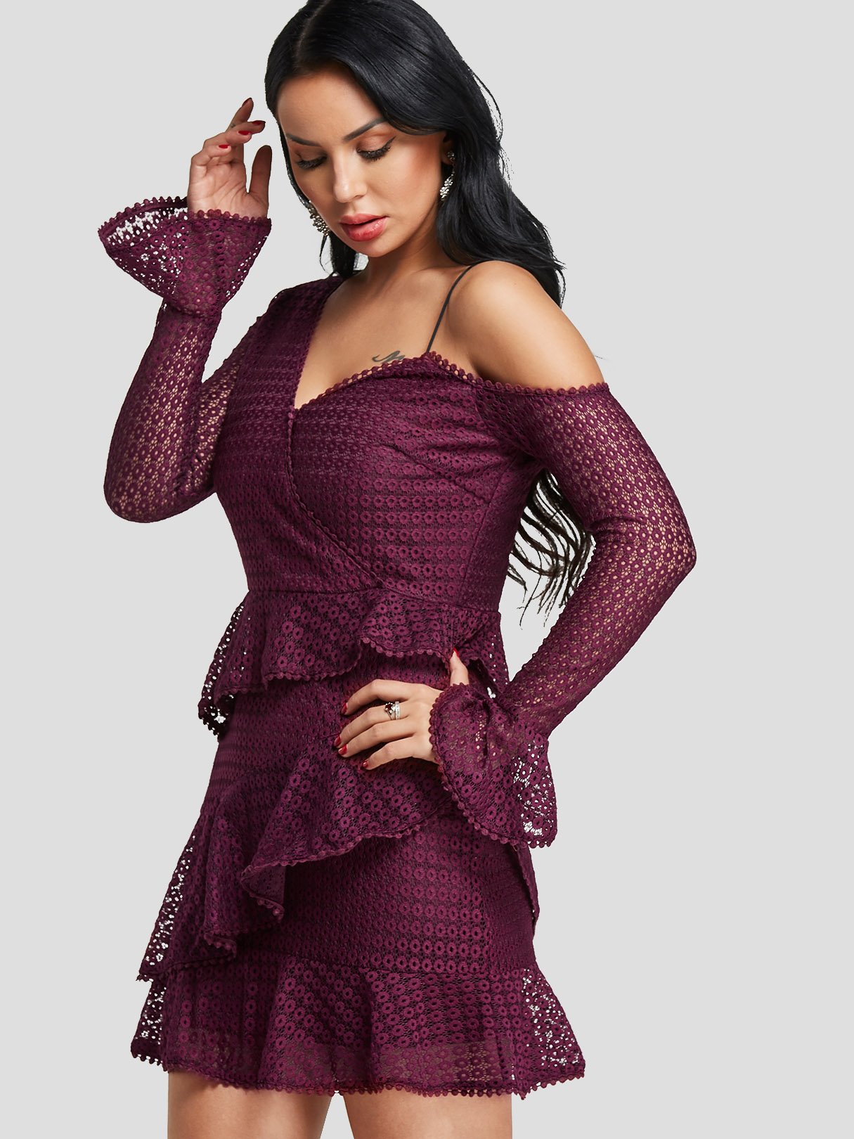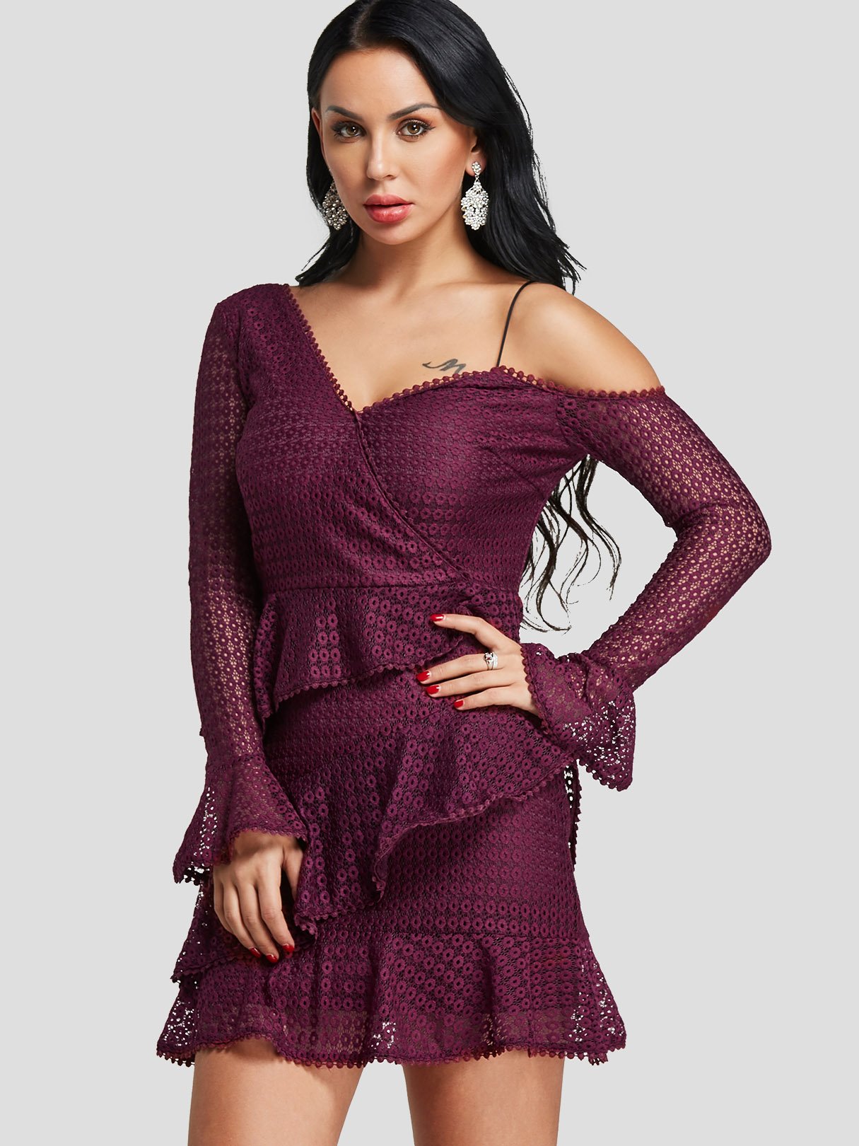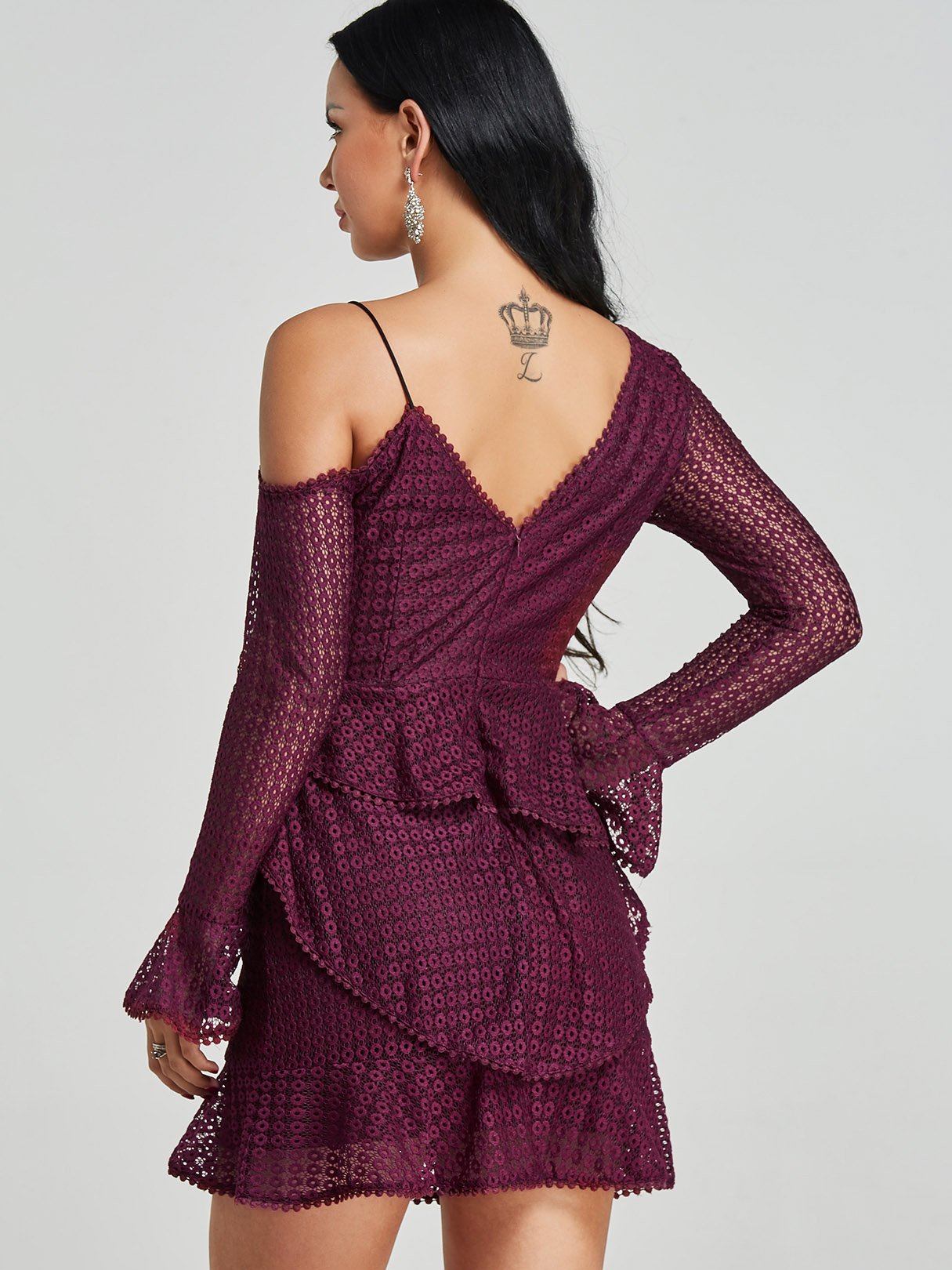 Burgundy Asymmetrical Long Sleeve Backless Spaghetti Strap Ruffle Hem Sexy Dresses