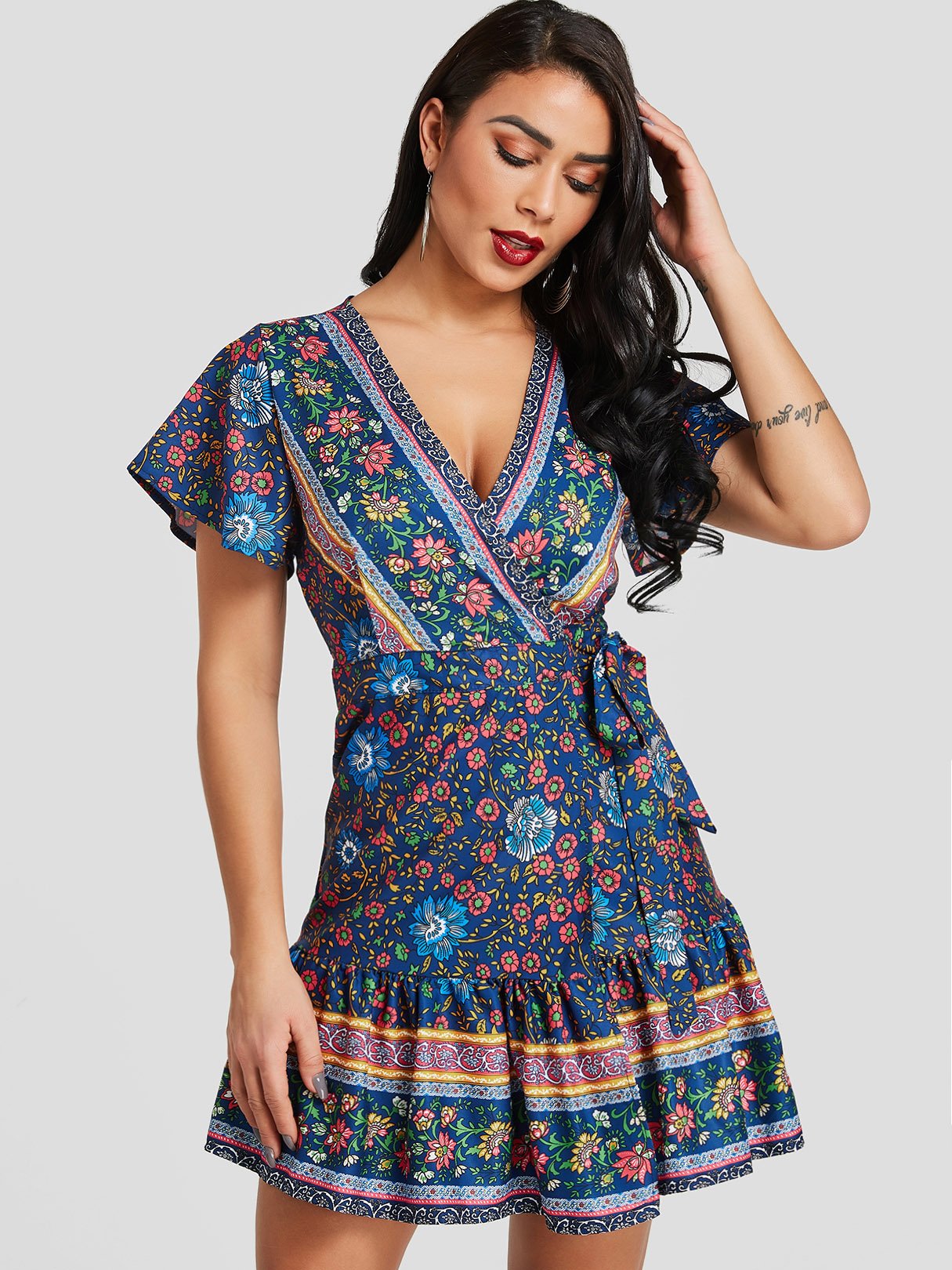 Crossed Collar Short Sleeve Self-Tie Ruffle Hem Dresses