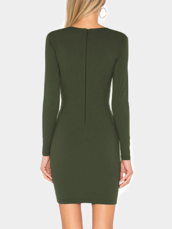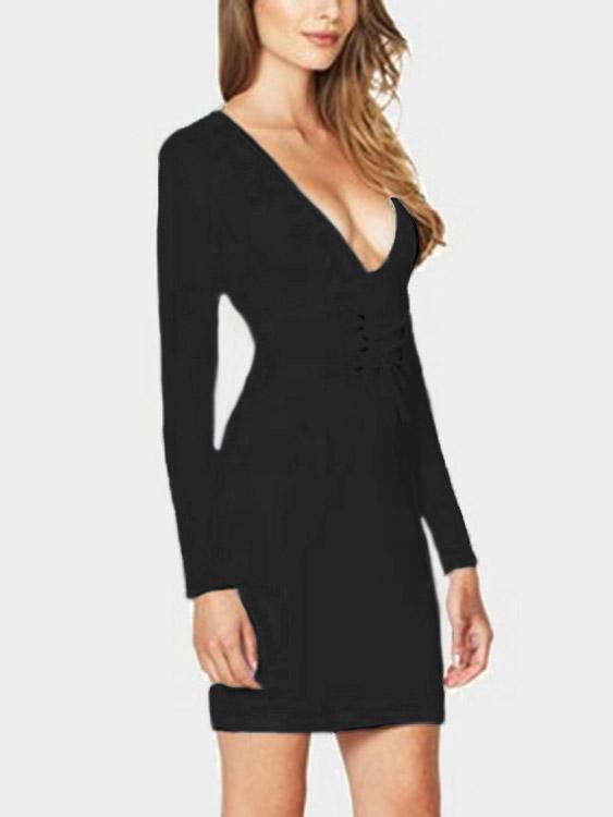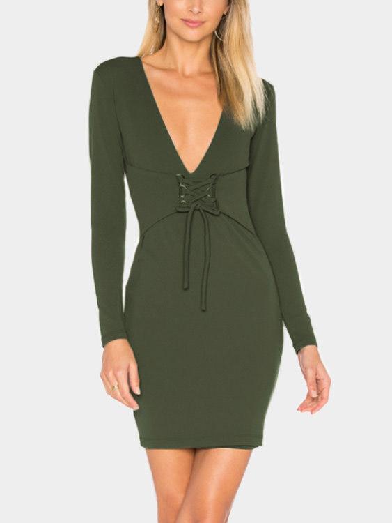 Deep V Neck Long Sleeve Plain Dresses
