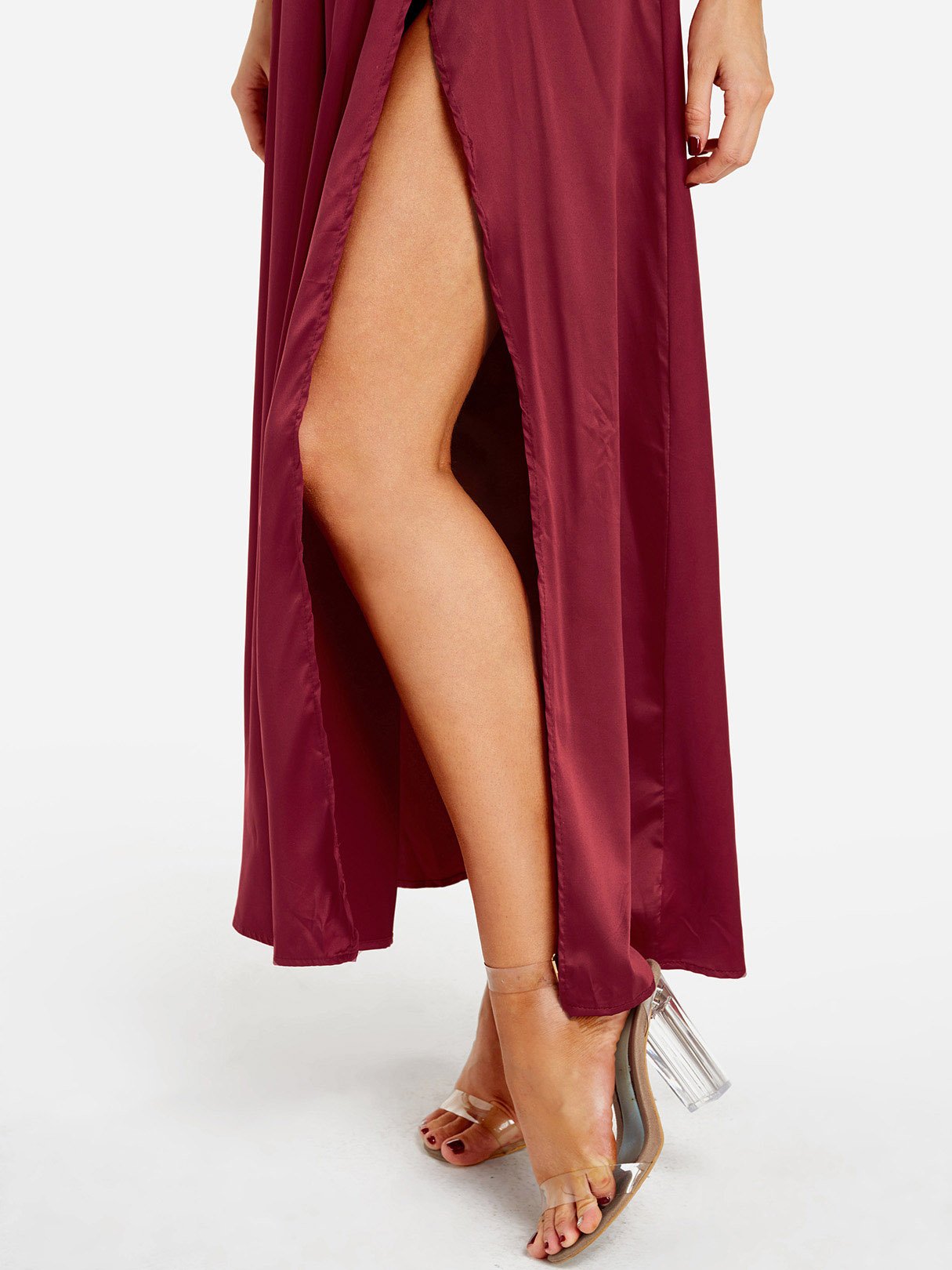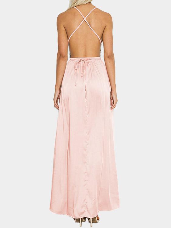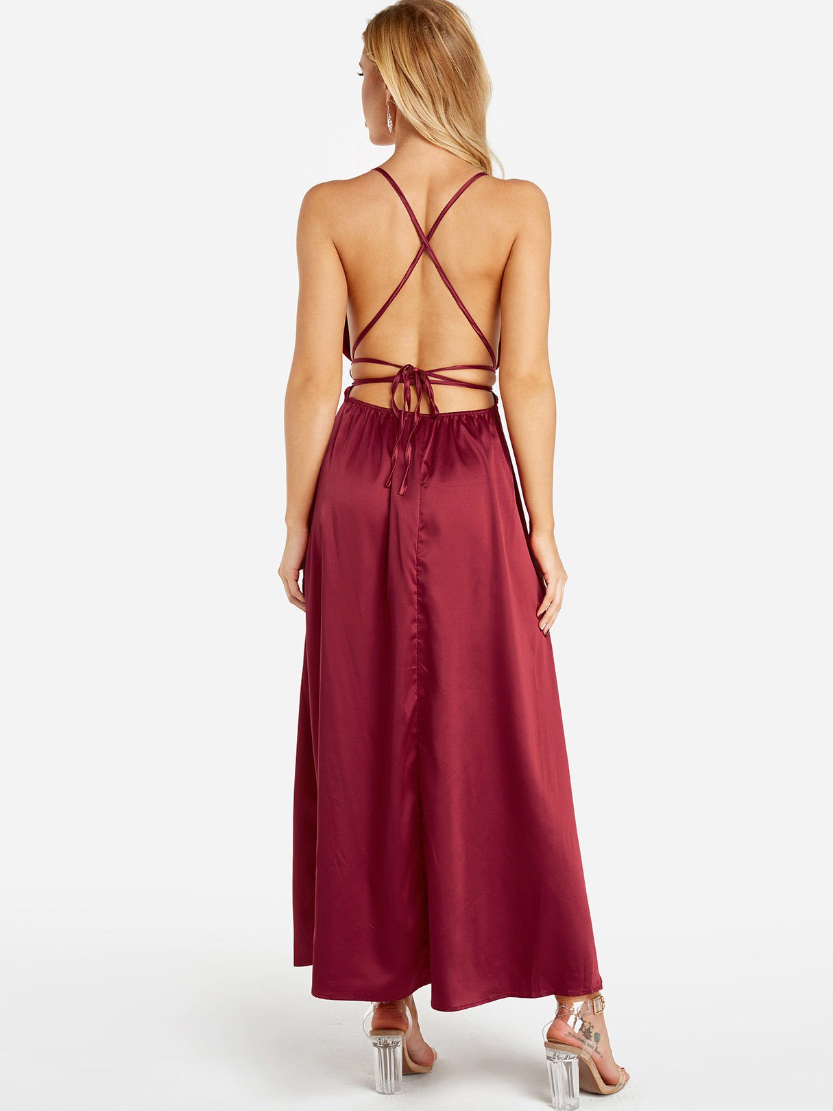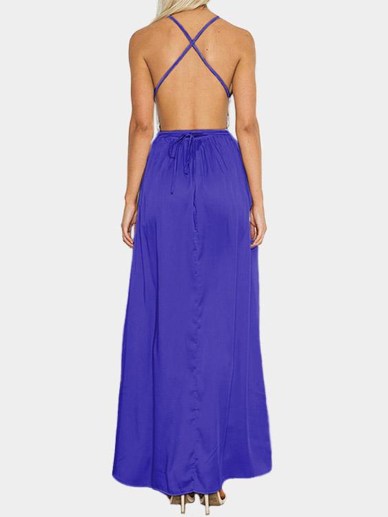 Deep V Neck Sleeveless Backless Lace-Up Slit Hem Dresses