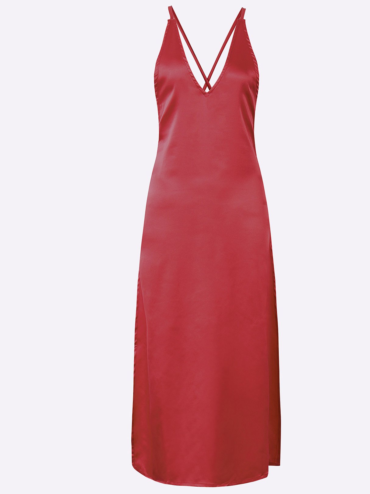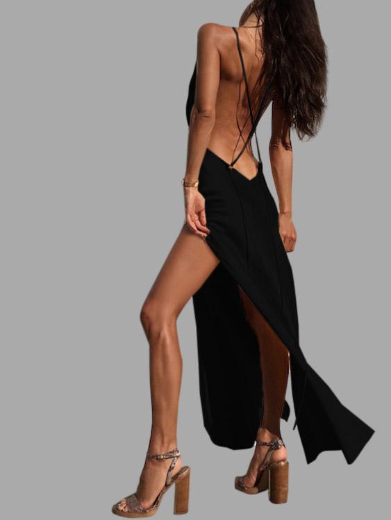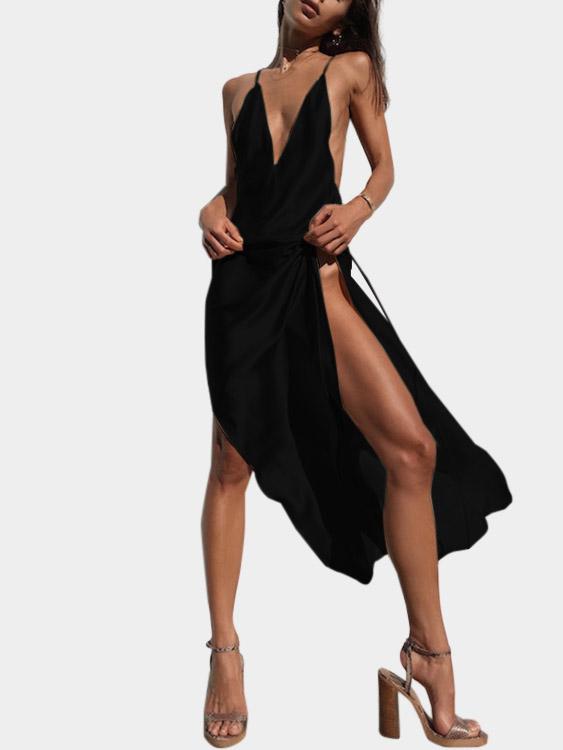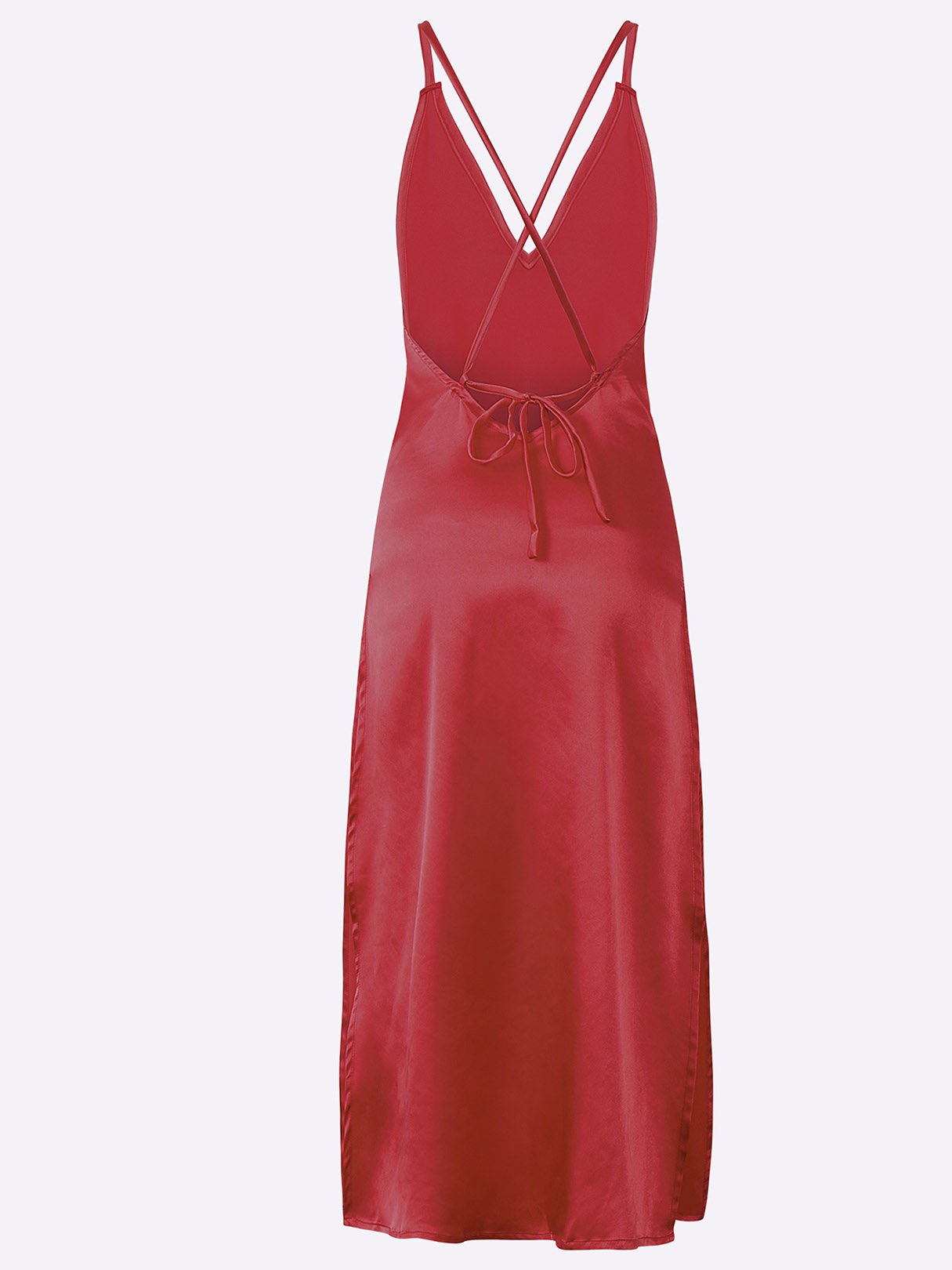 Material:Polyester,SatinNeckline:V-Neck,Deep V NeckSeason:Spring,Summer,AutumnSleeves:SleevelessStyle:Casual StyleDetail:Adjustable Shoulder Straps,Lace-Up Design,Cut OutHem Design:Slit HemLength:MaxiFit:Regular Fit