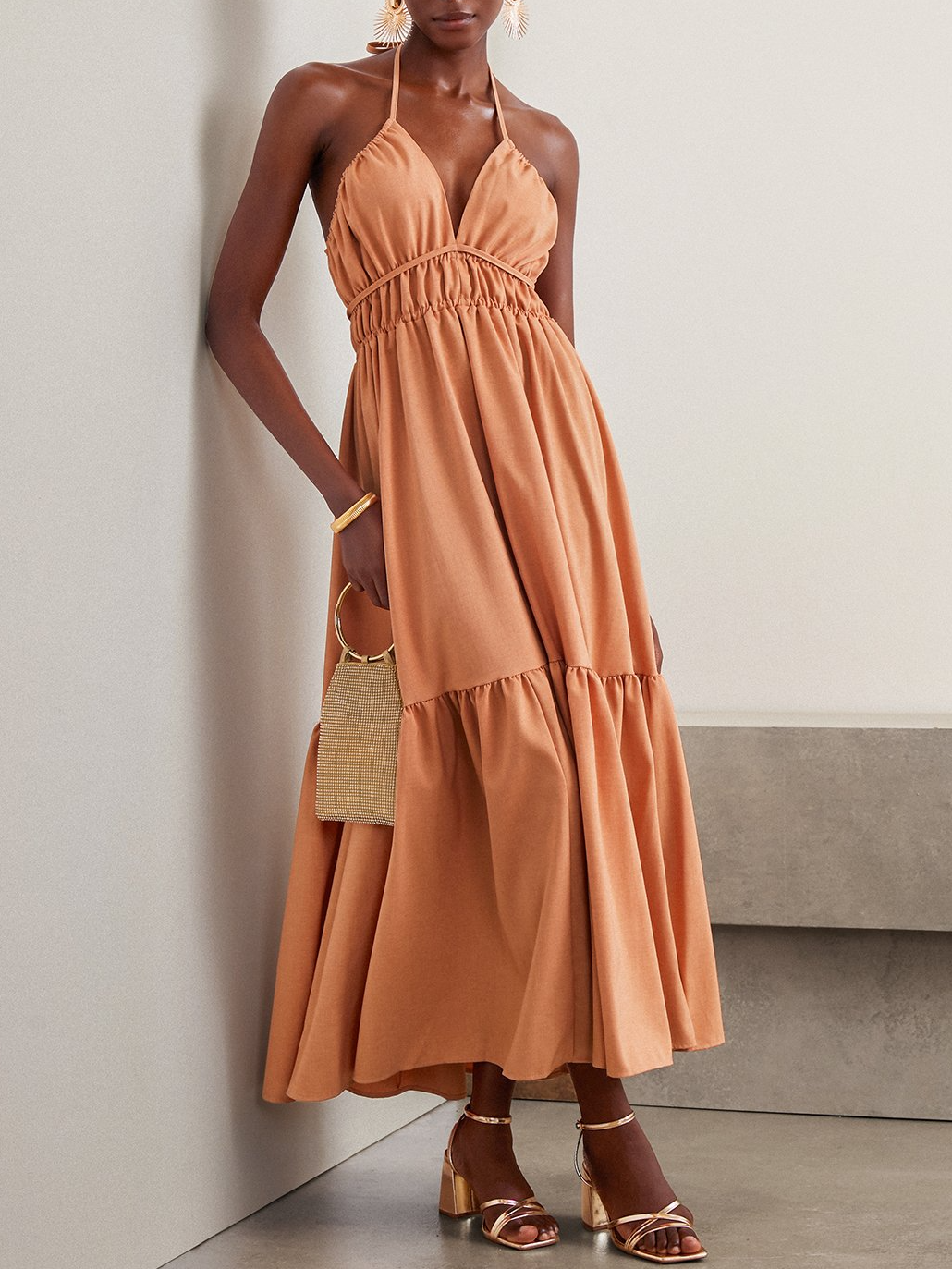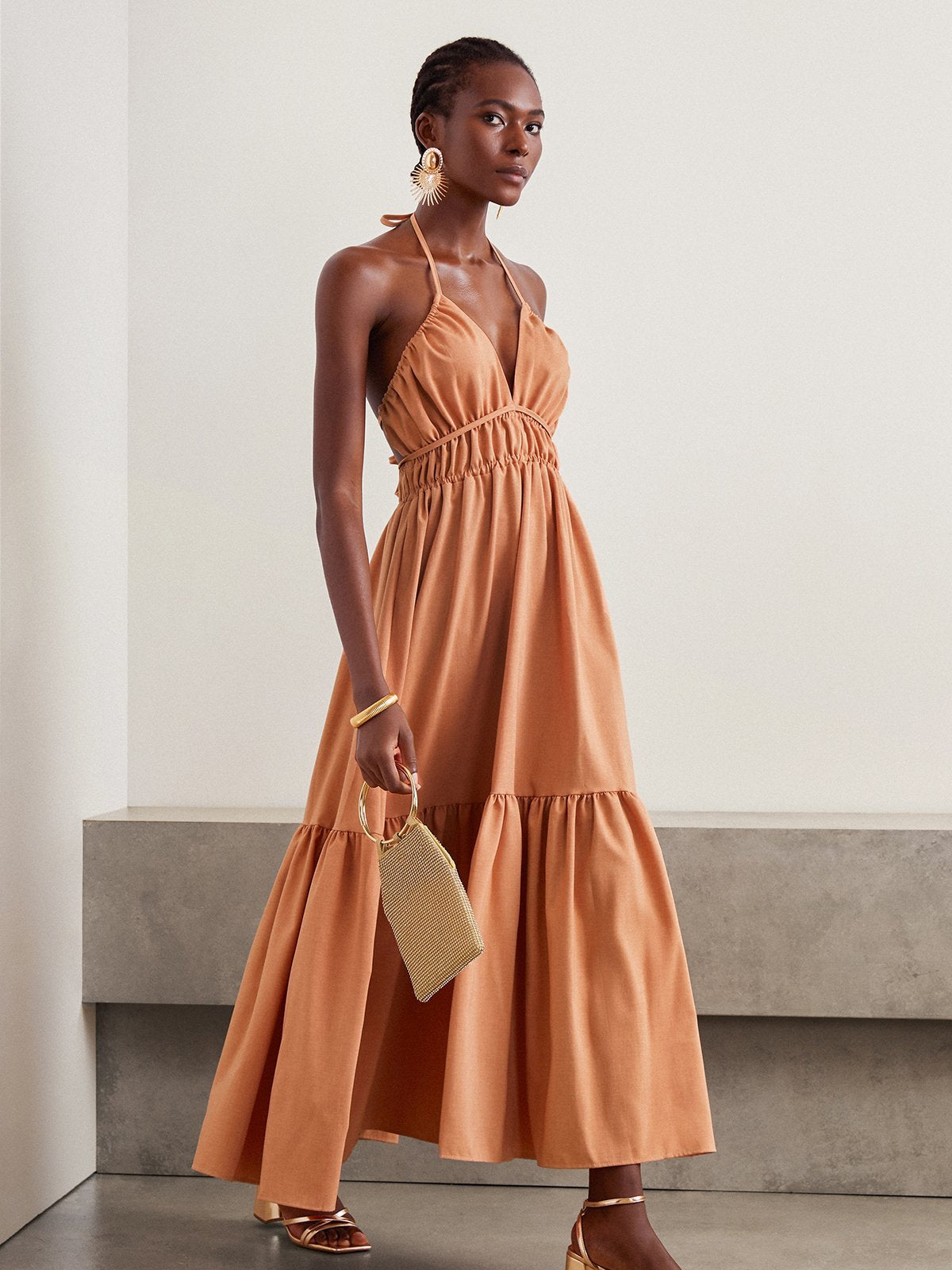 Elegant Gallus Spaghetti Plain Ruched Maxi Dress - Orange / S is backordered and will ship as soon as it is back in stock.
