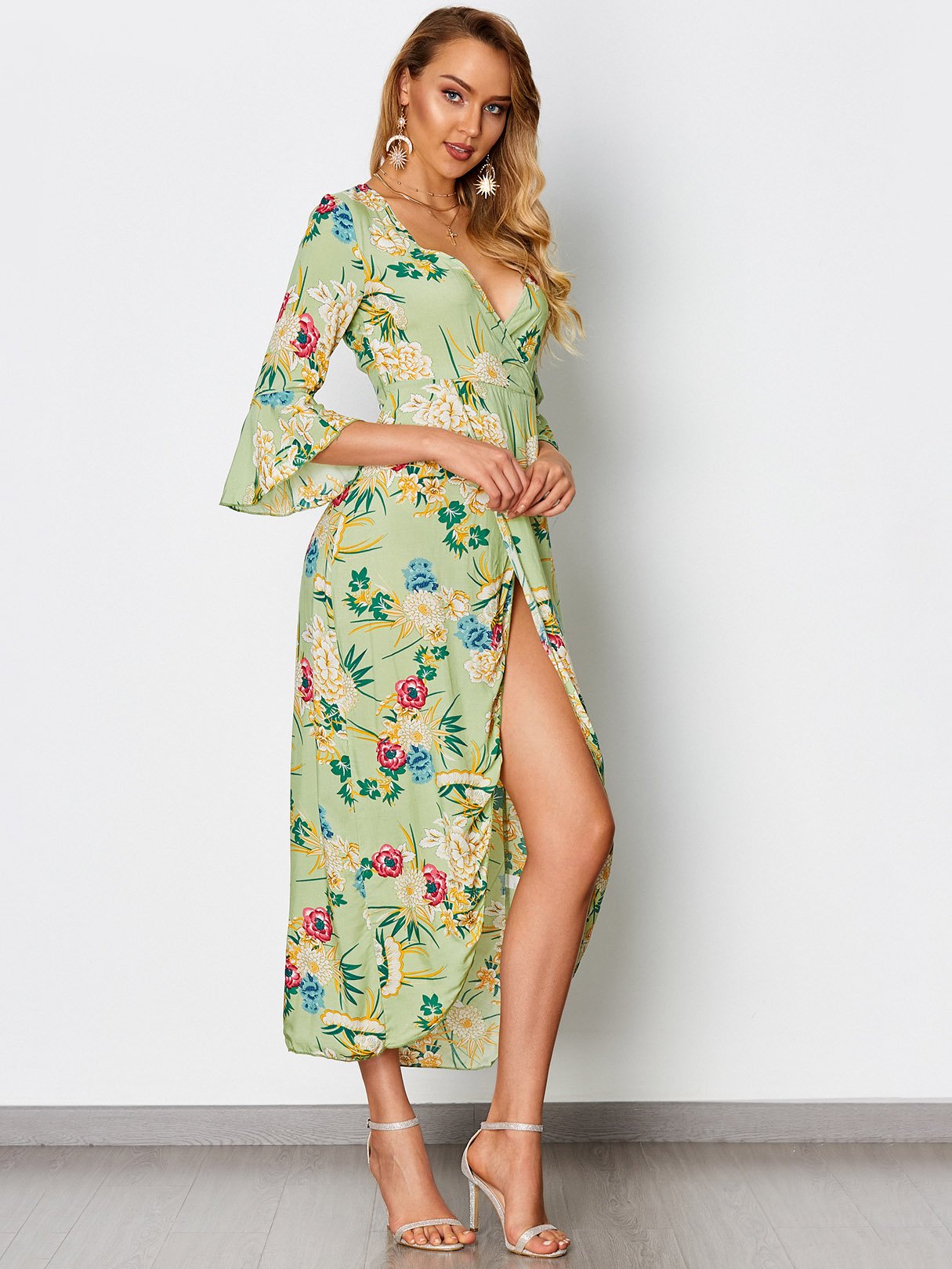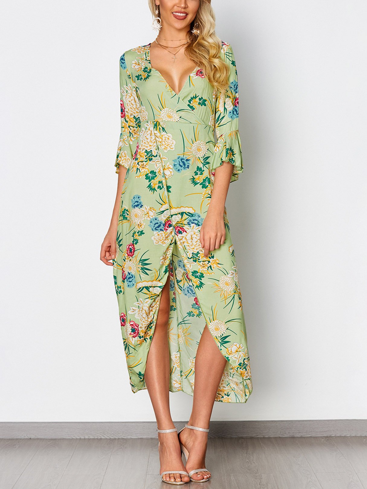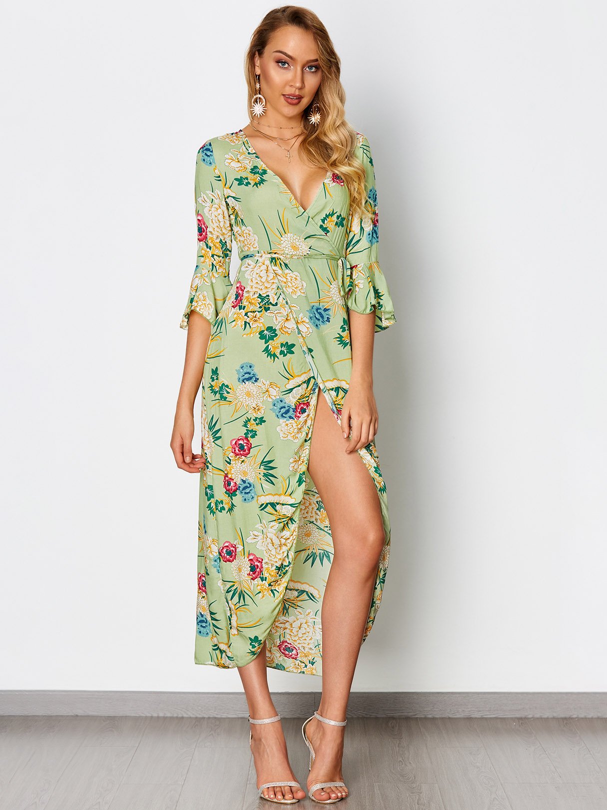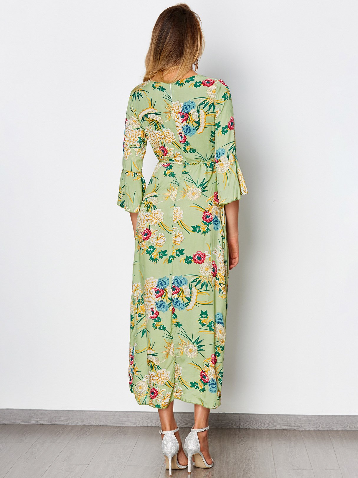 Green Deep V-Neck Half Sleeve Floral Print Crossed Front Lace-Up Flounced Hem Maxi Dress