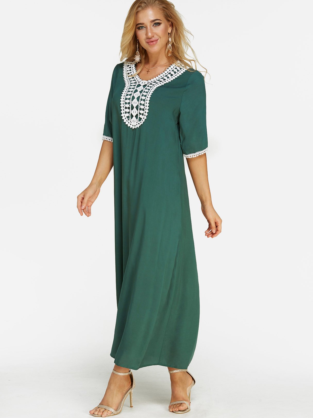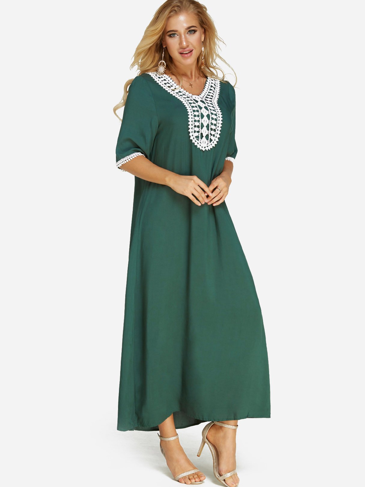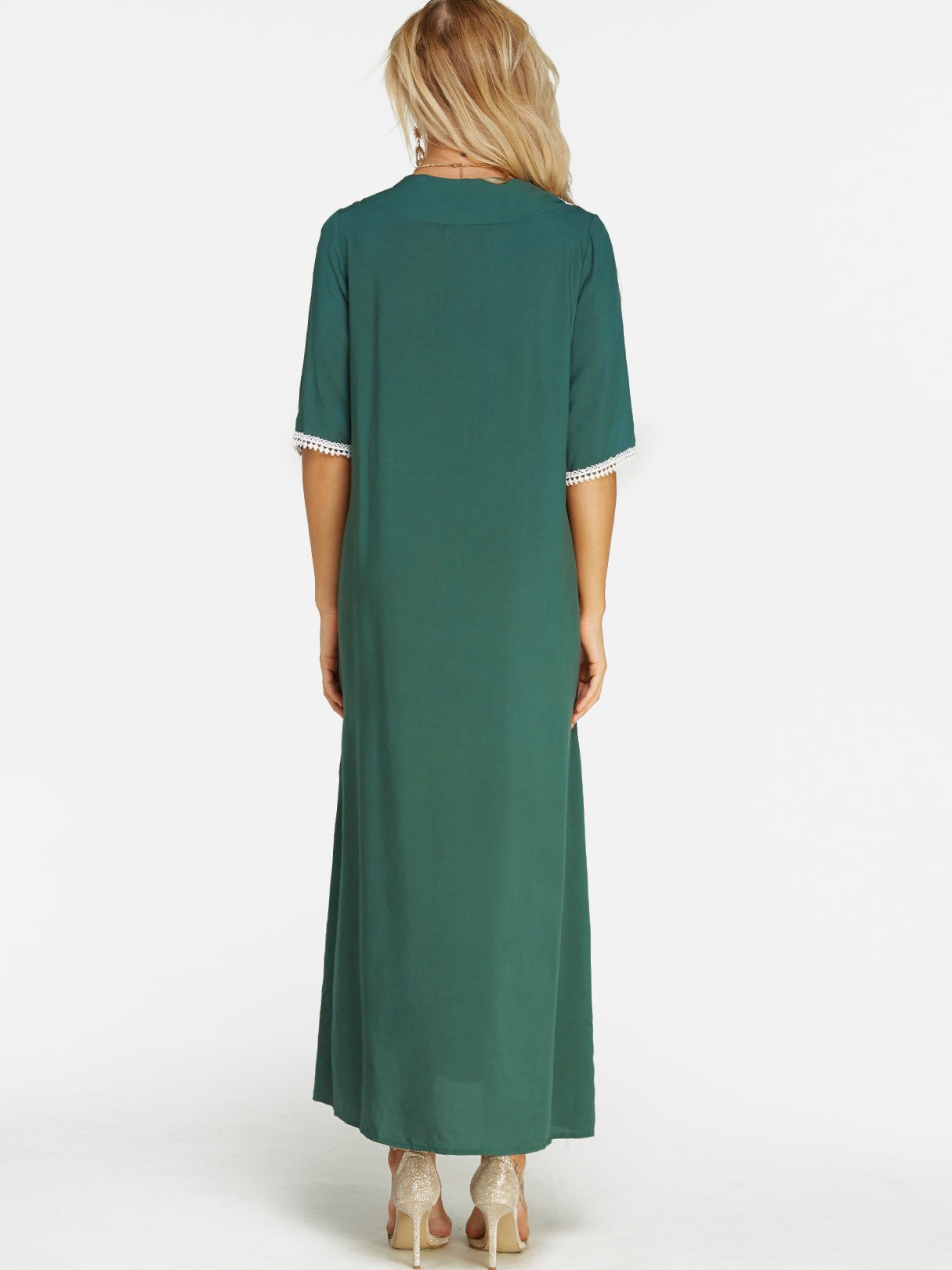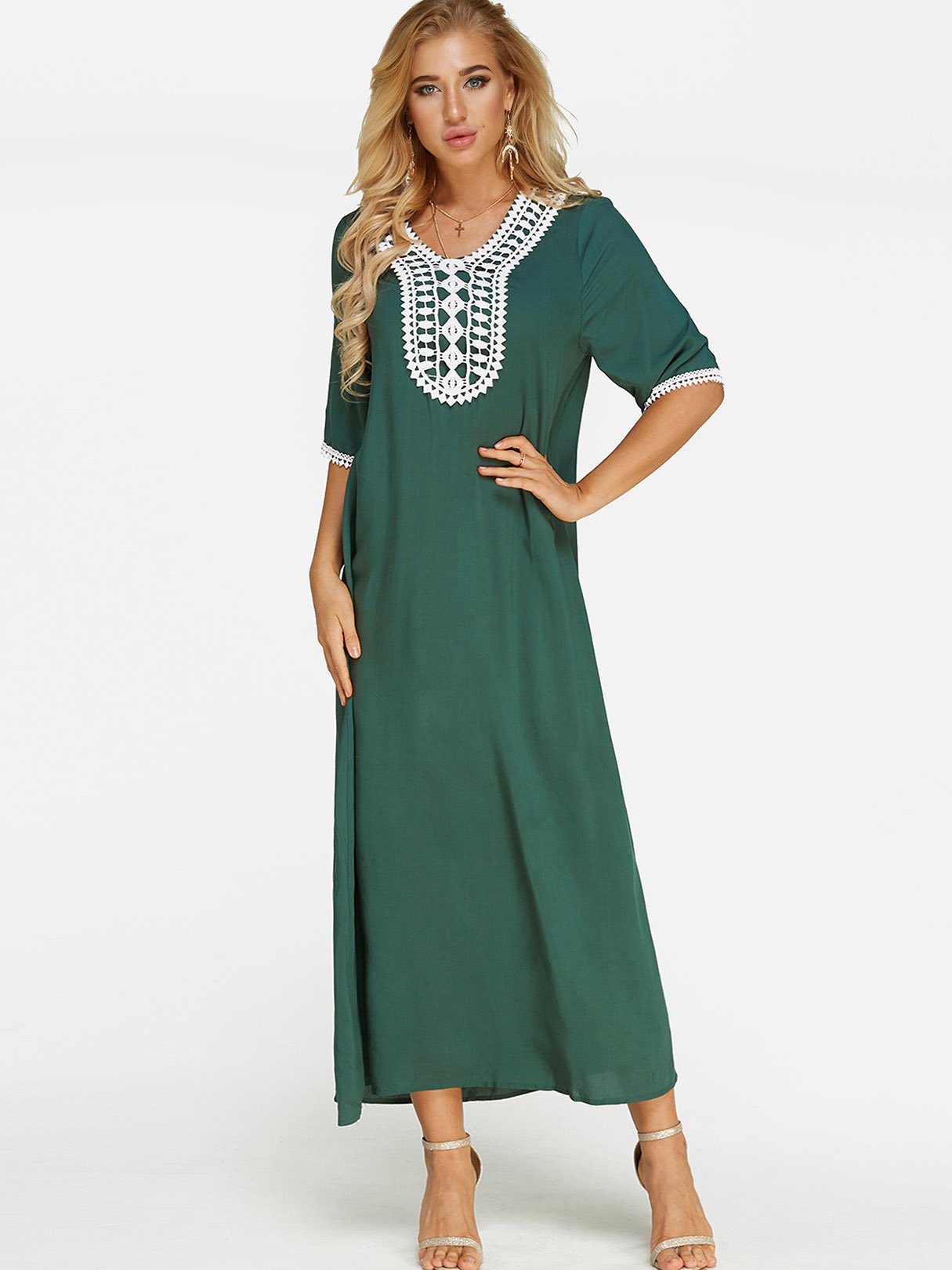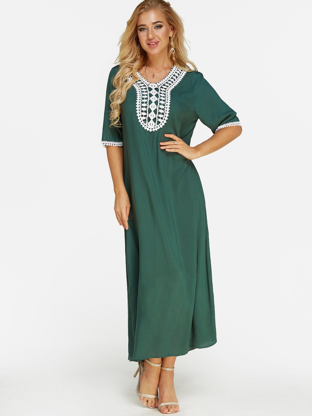 Green V-Neck Half Sleeve Crochet Lace Embellished Dress