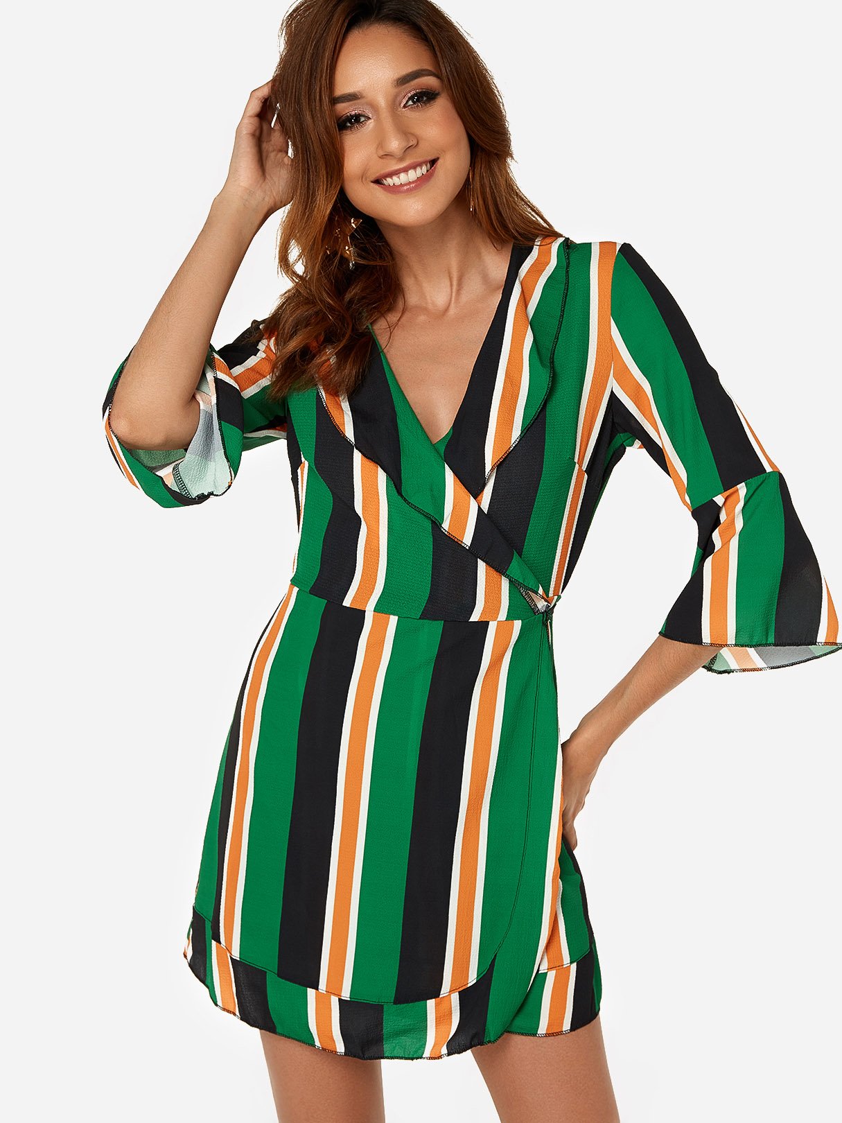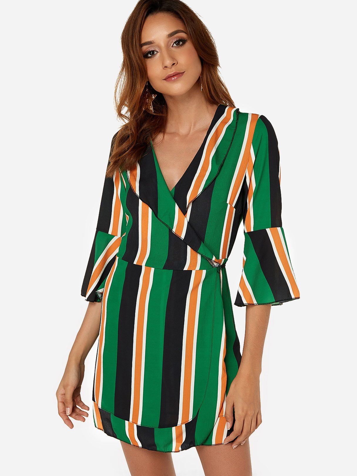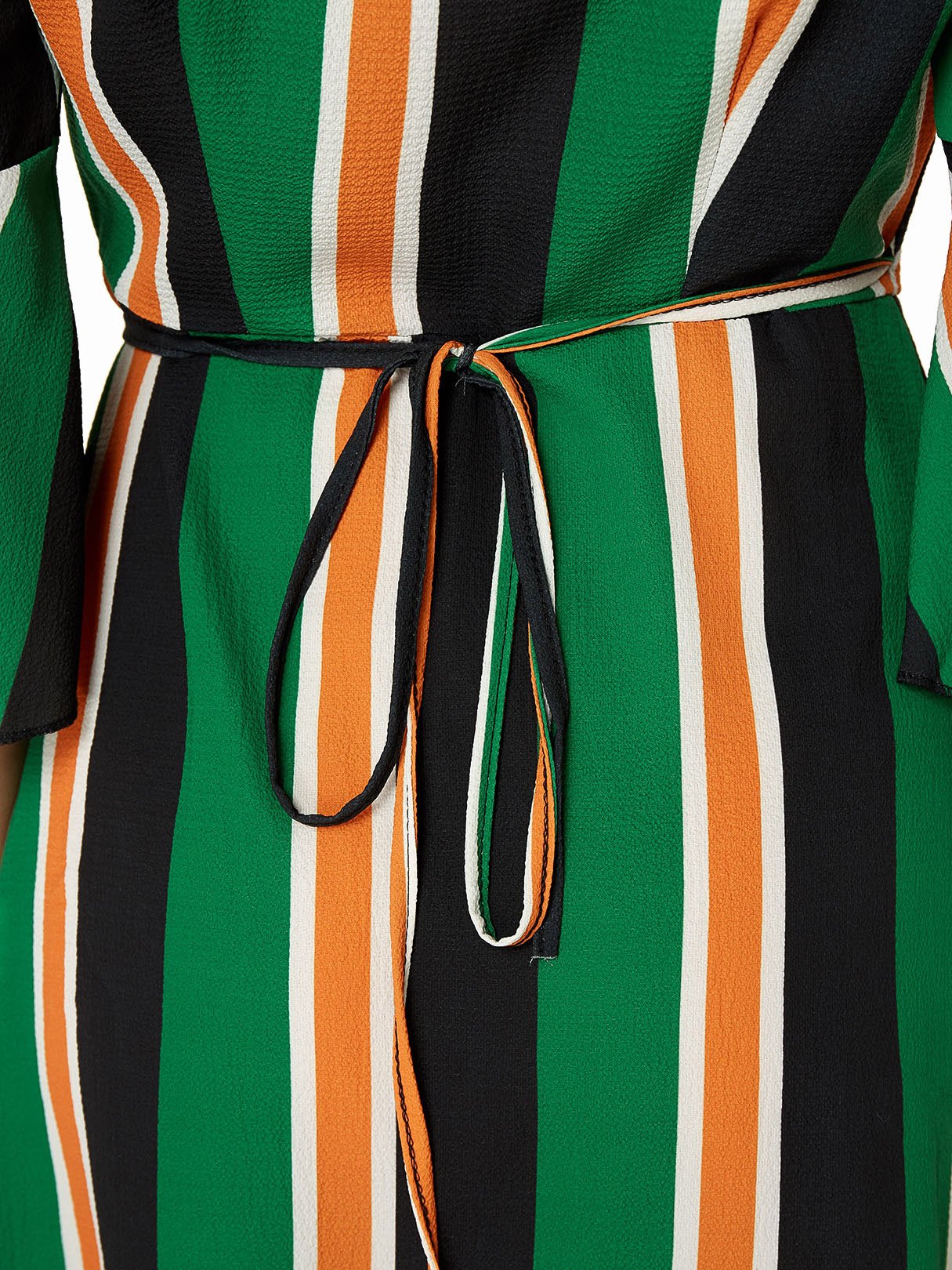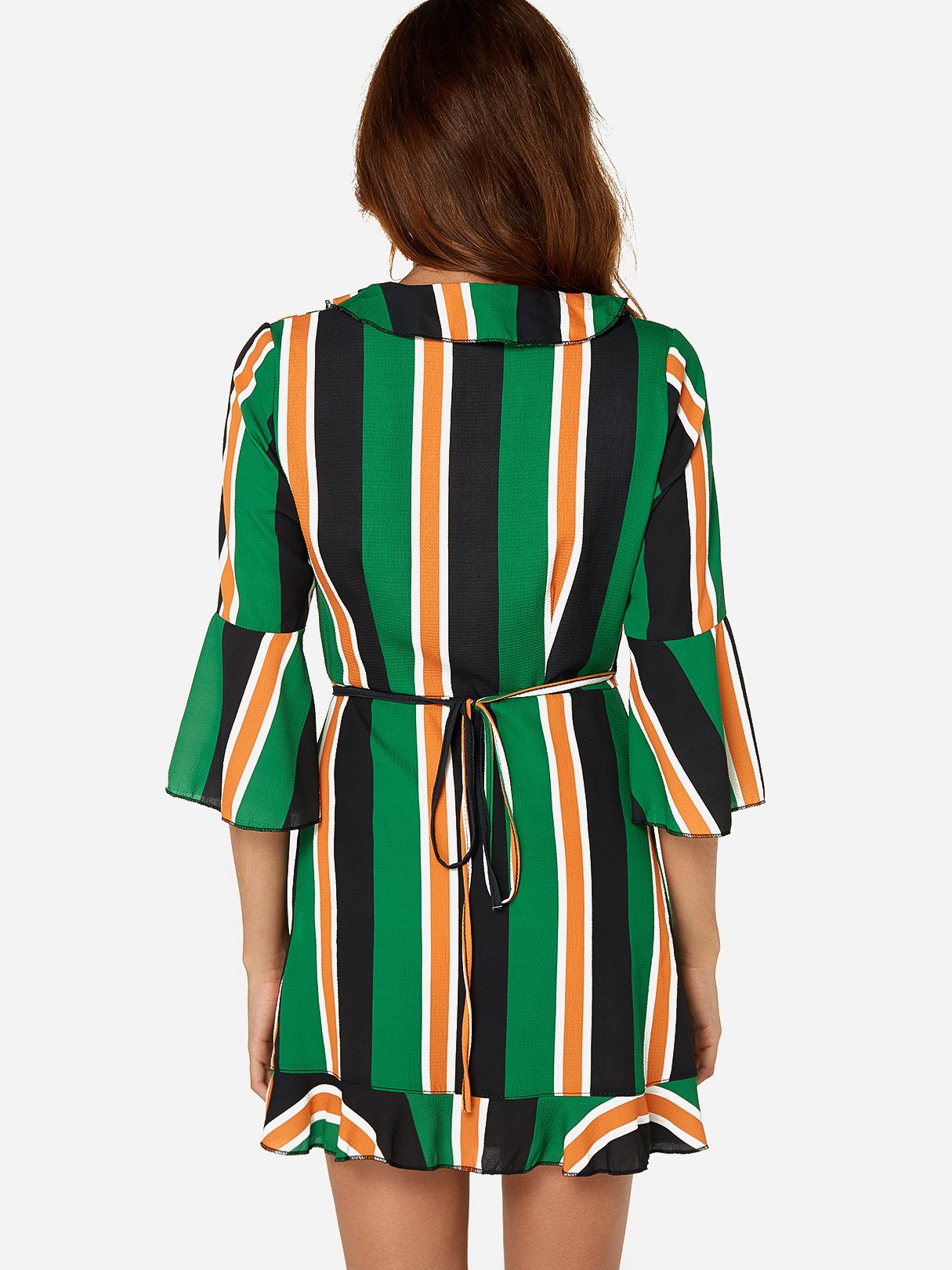Green V-Neck Half Sleeve Stripe Lace-Up High-Waisted Dresses