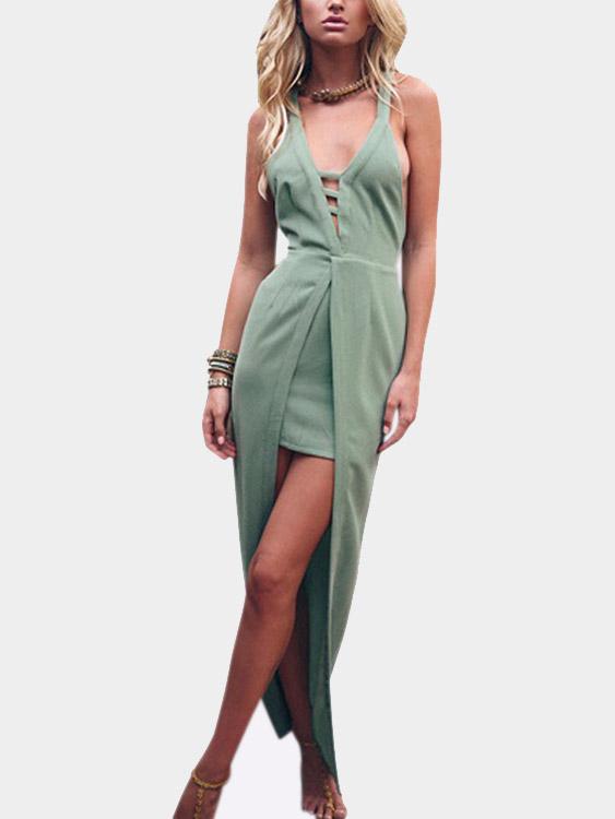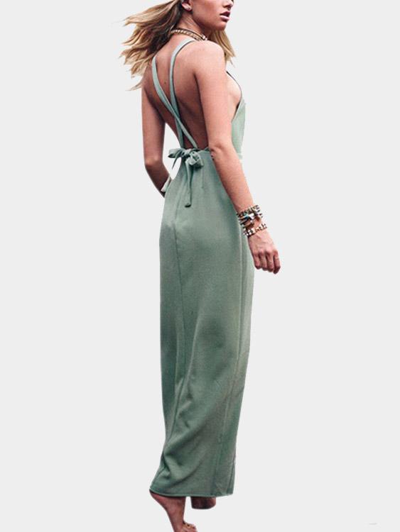Green V-Neck Sleeveless Backless Spaghetti Strap Dresses