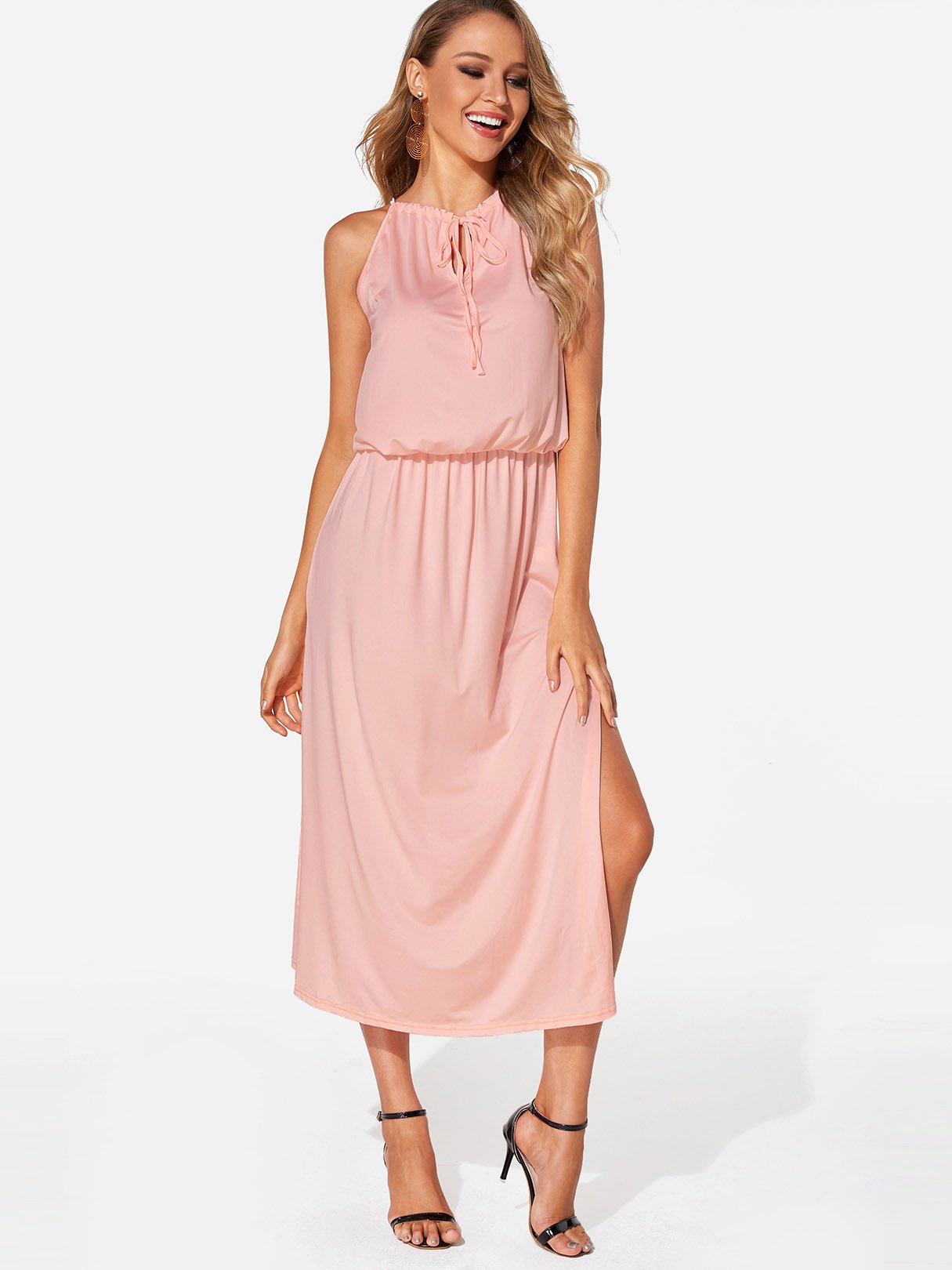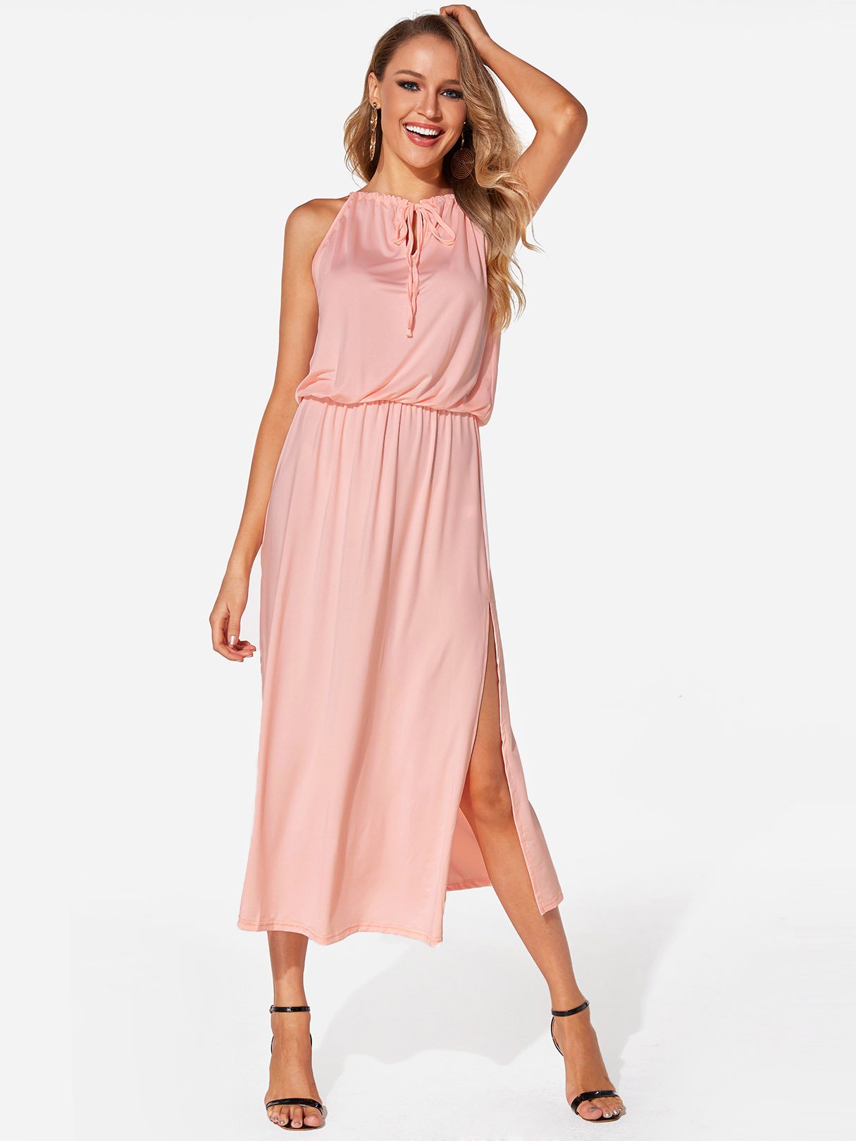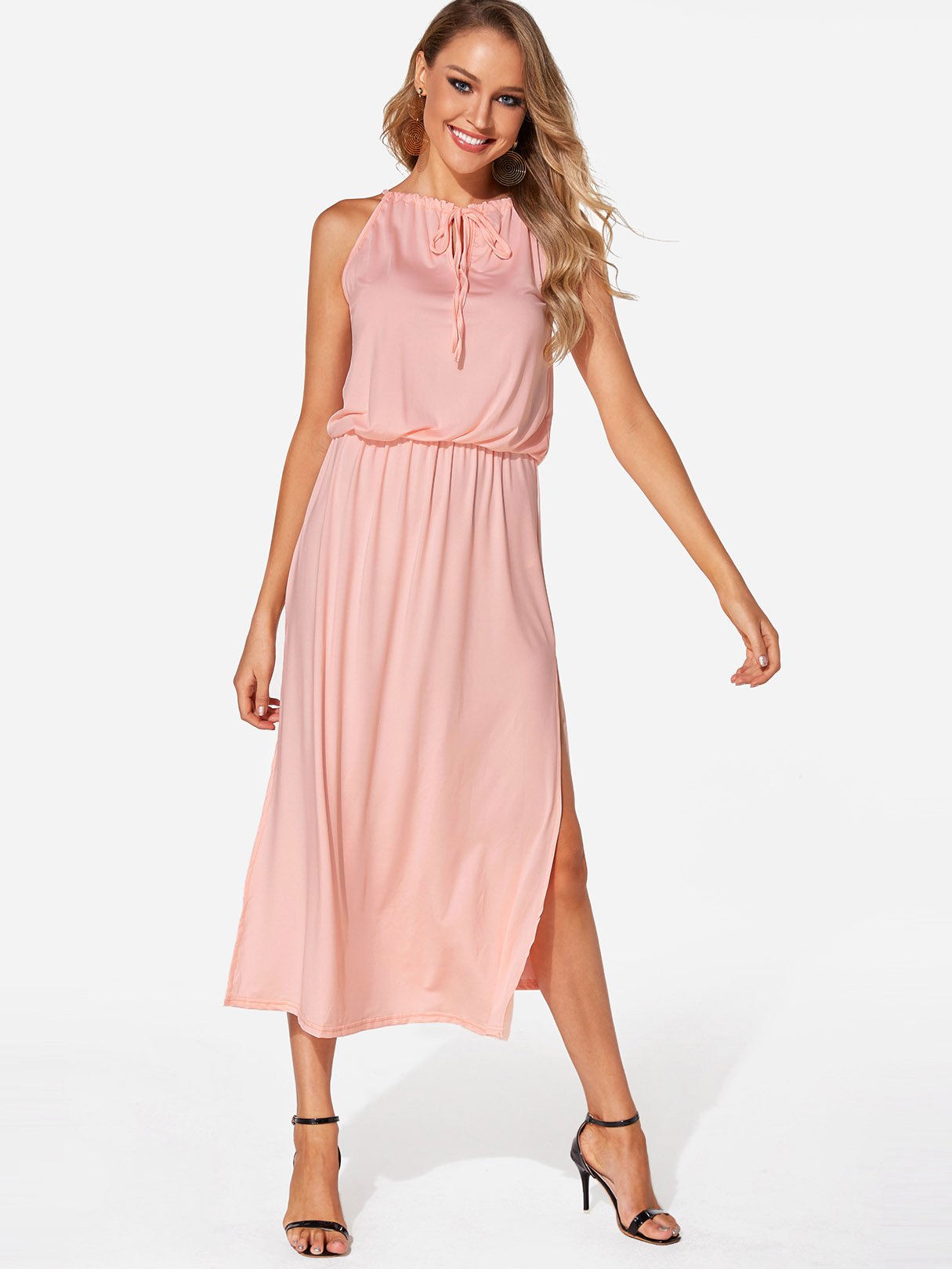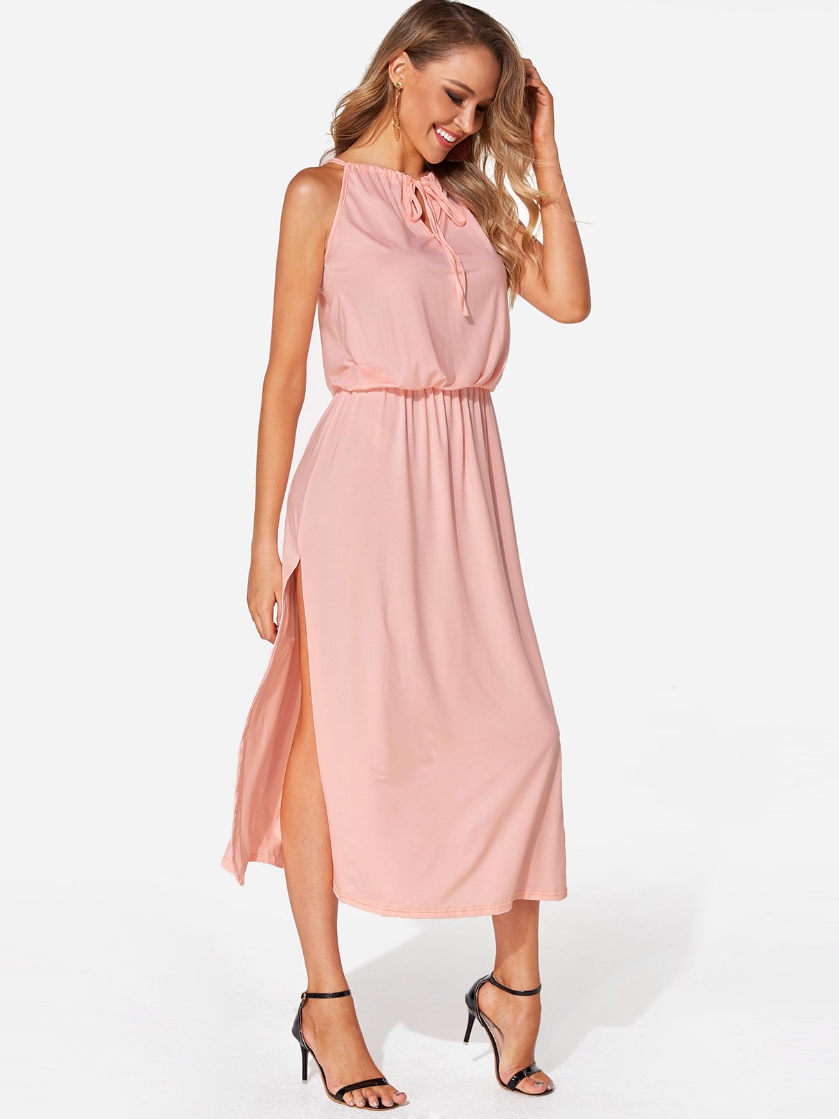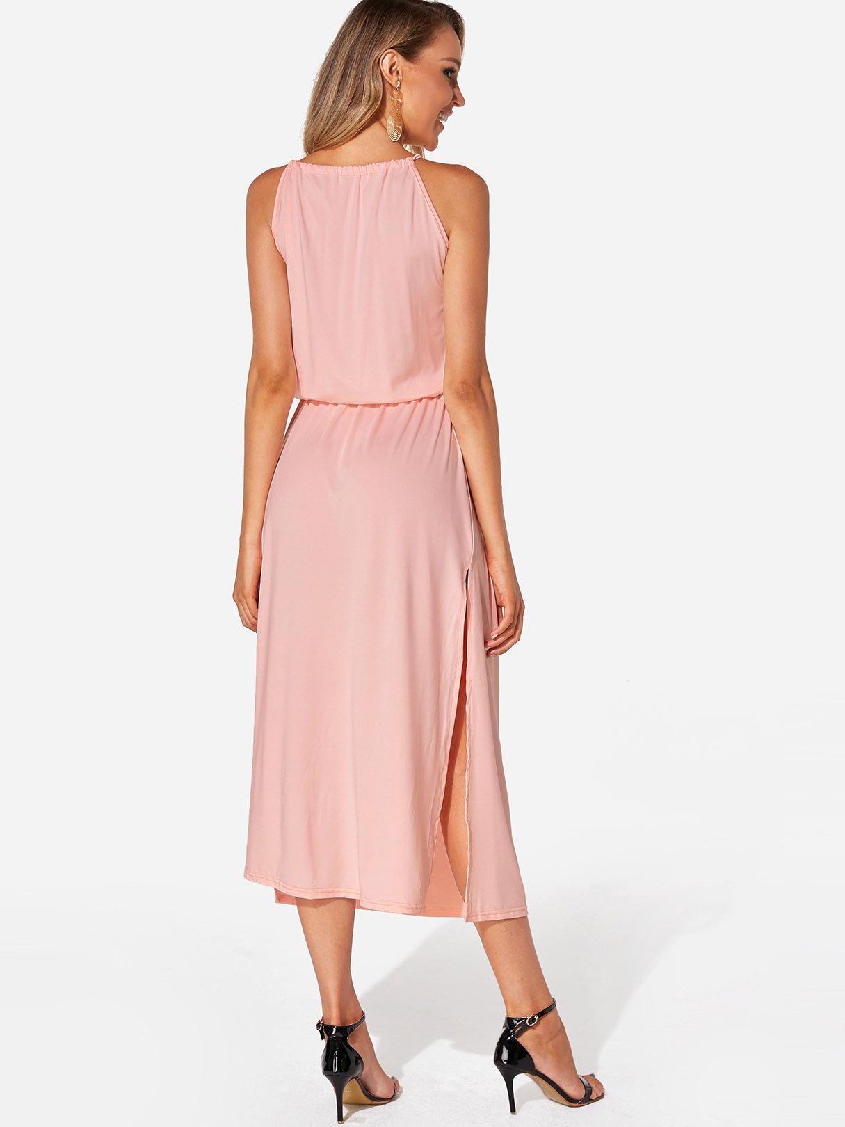 Halter Sleeveless Plain Cut Out Slit Hem Pink Sexy Dresses