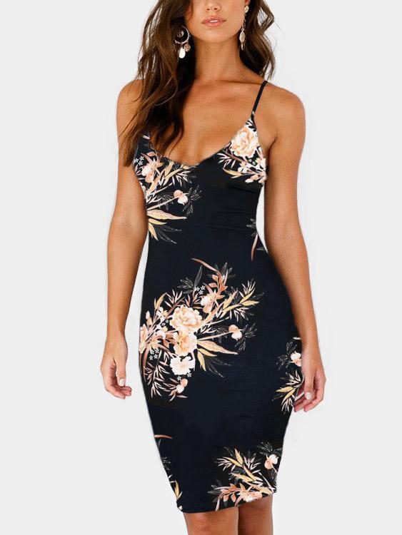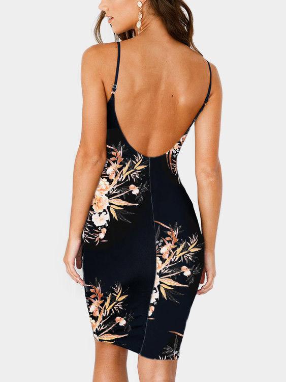 Halter V-Neck Sleeveless Floral Print Backless Black Sexy Dresses