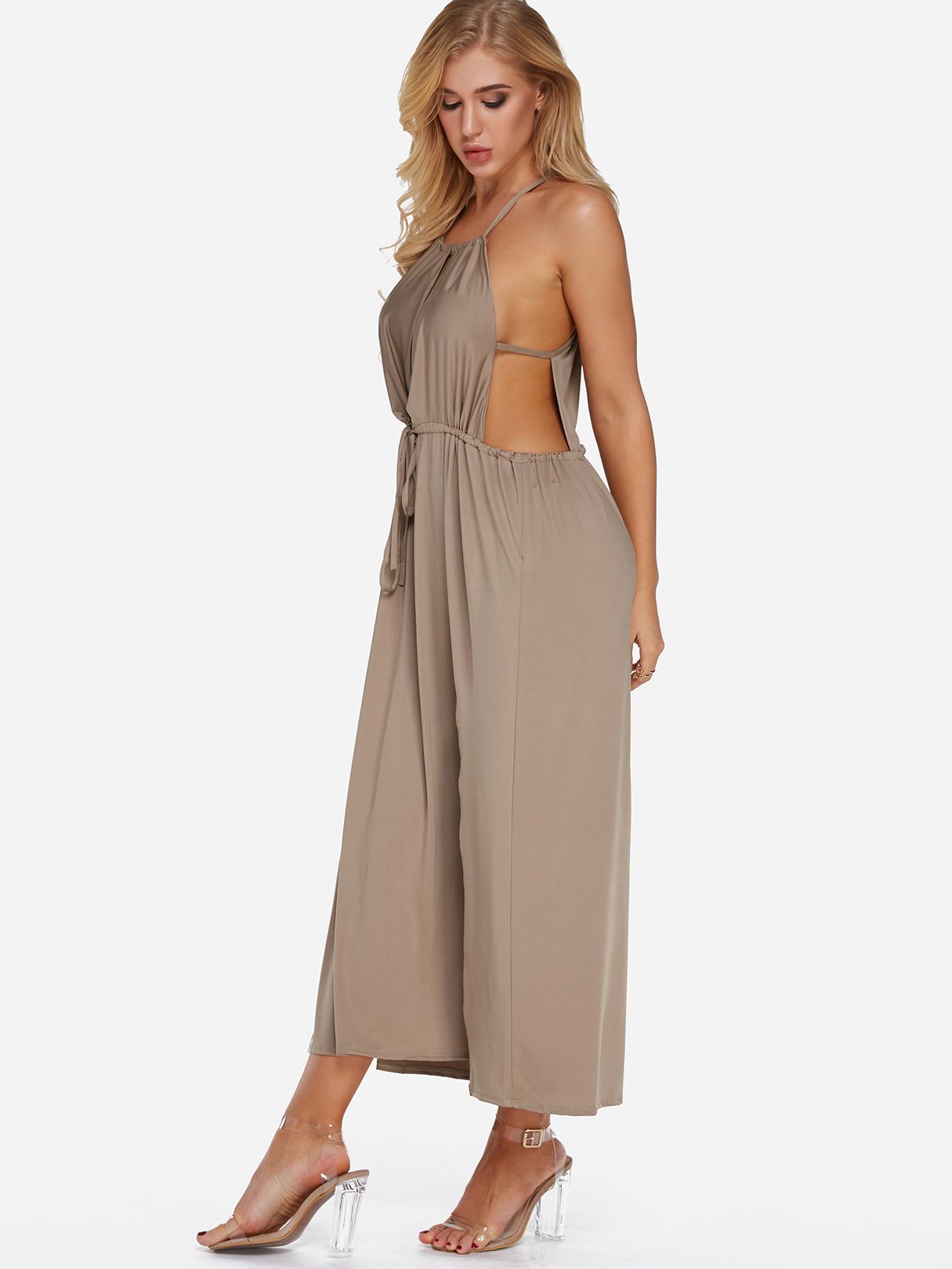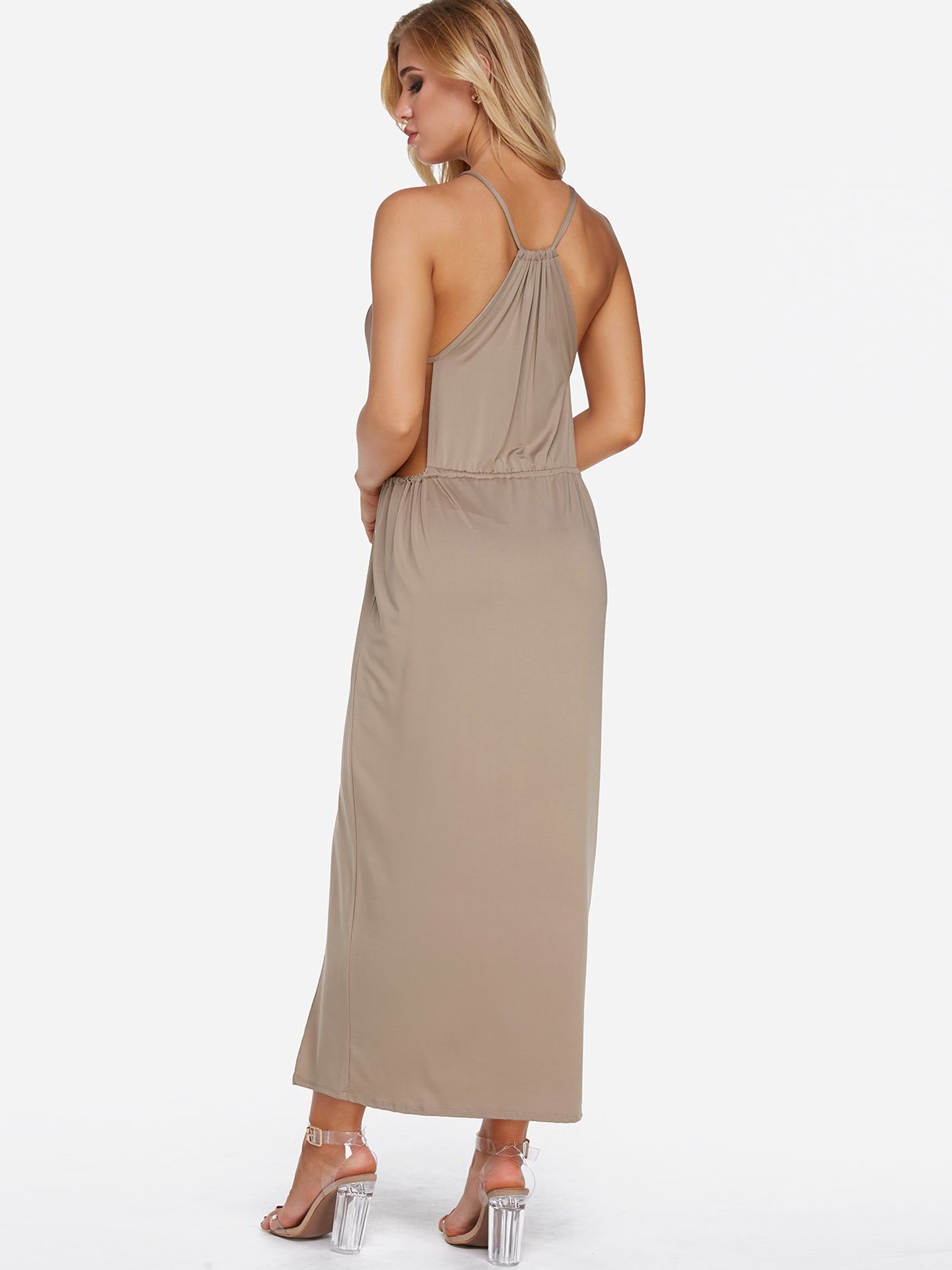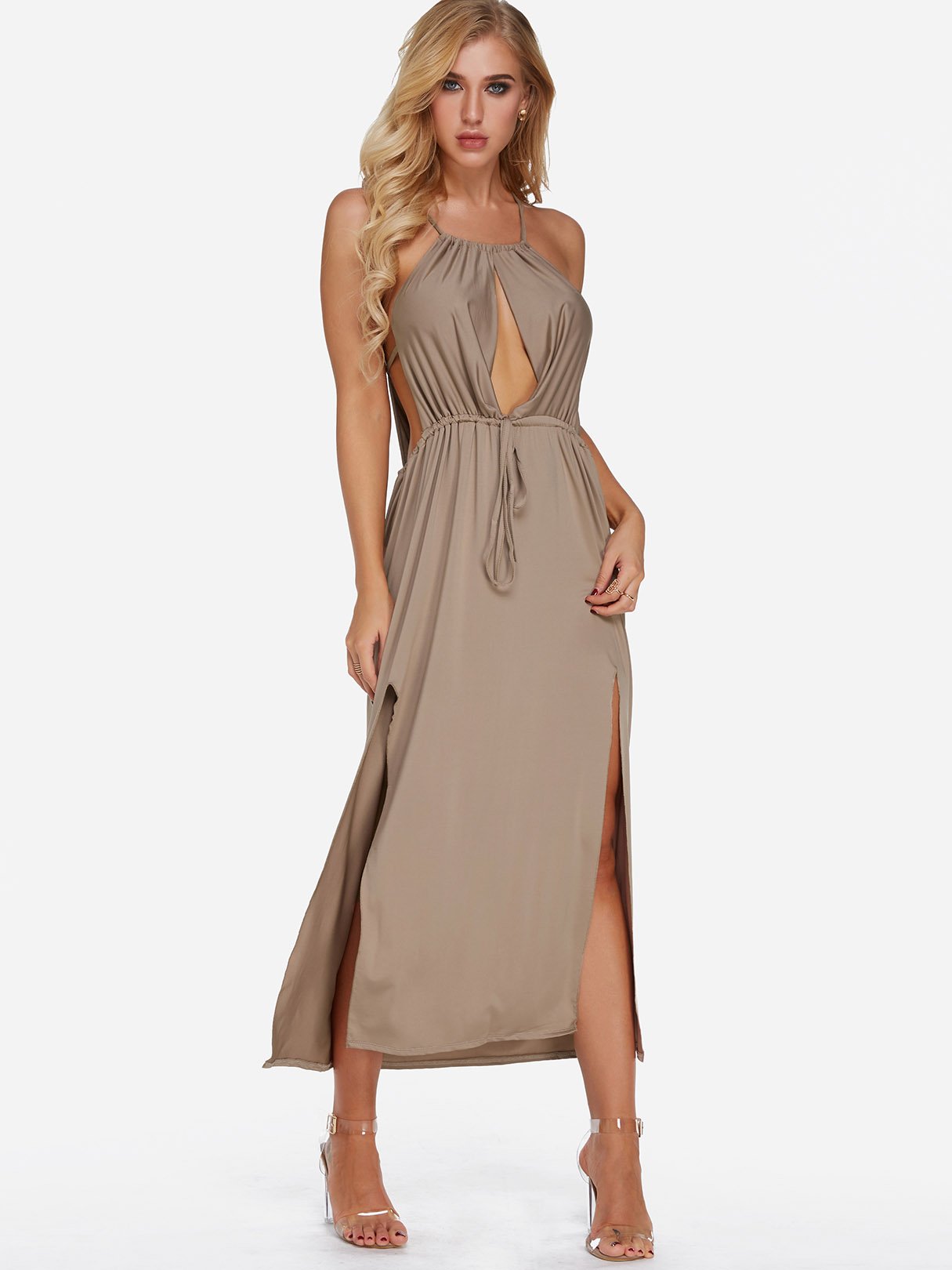 Khaki Halter Sleeveless Lace-Up Cut Out Slit Hem Sexy Dresses