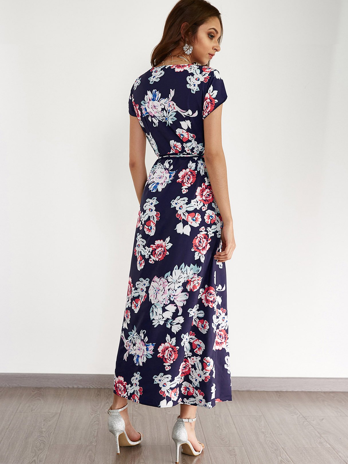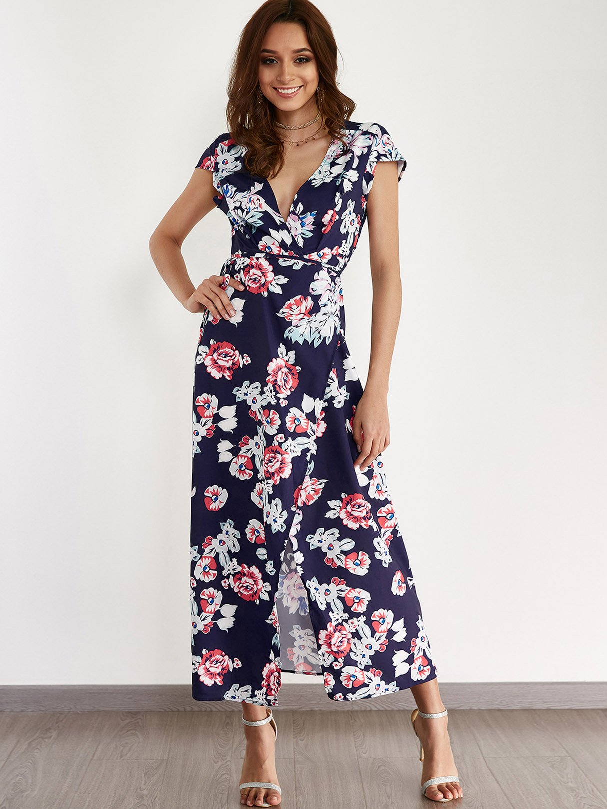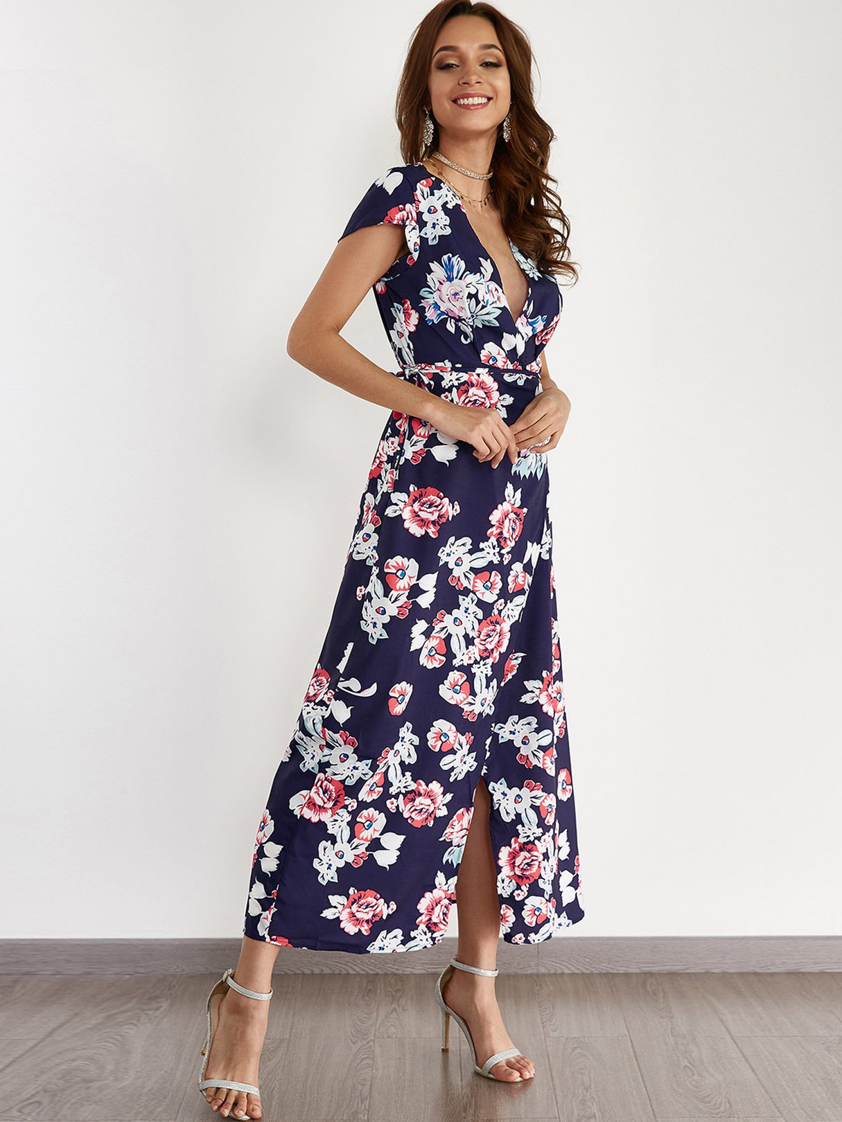 Material:PolyesterNeckline:Deep V NeckSeason:Spring,SummerSleeves:Short SleevesPattern:Floral PrintDetail:Slit DesignHem Design:Slit HemLength:MaxiFit:Regular Fit