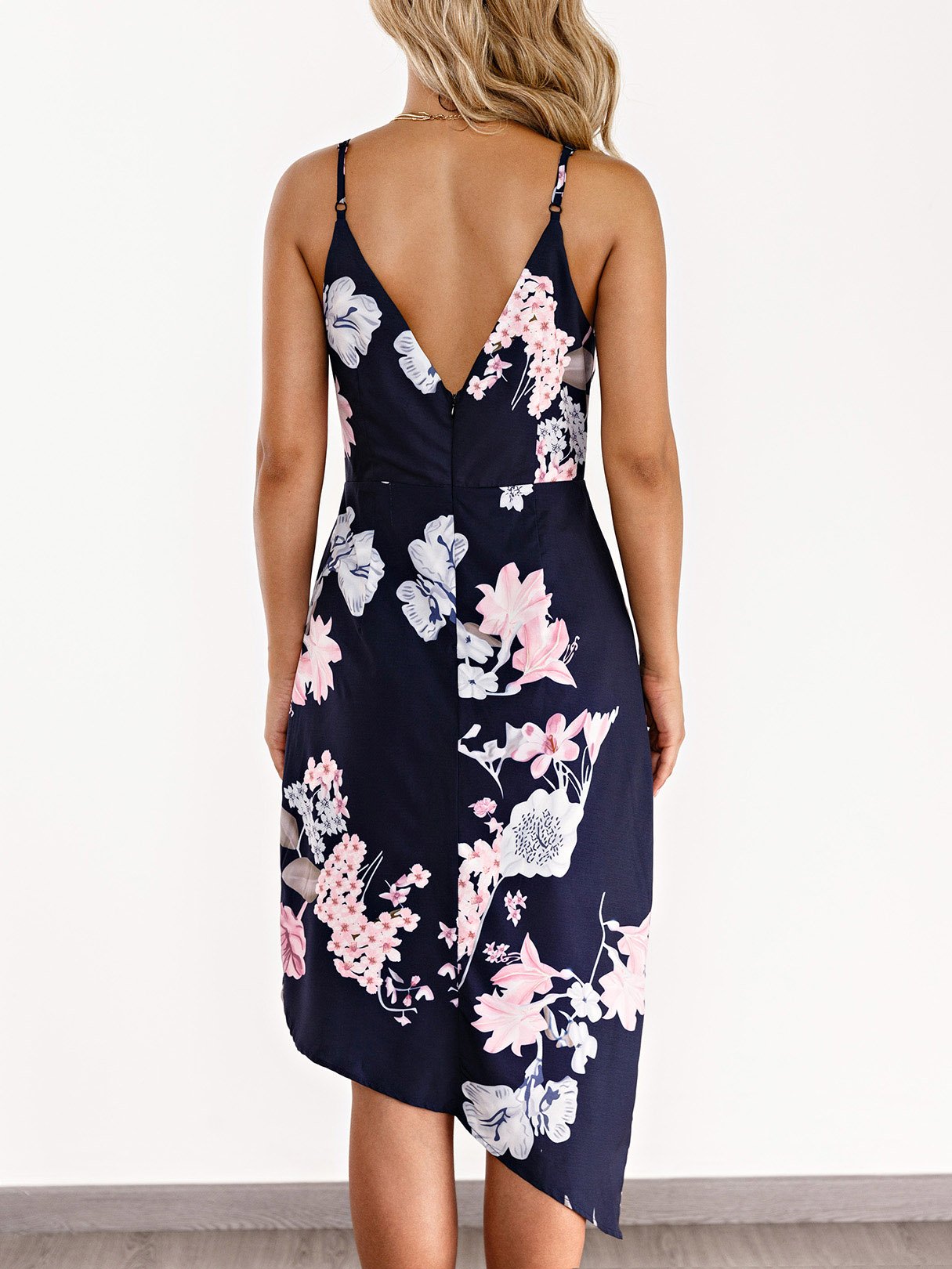 Navy Deep V Neck Sleeveless Floral Print Crossed Front Wrap Irregular Hem Dresses