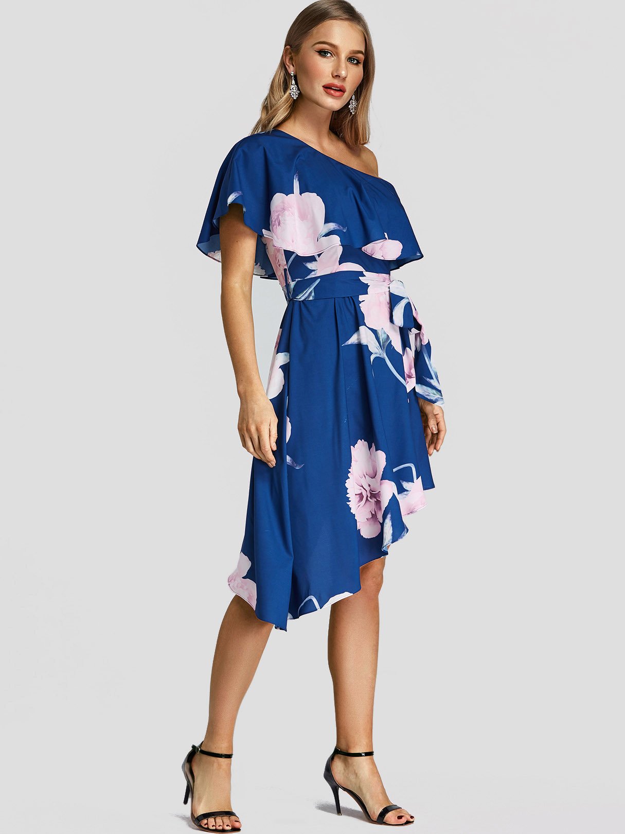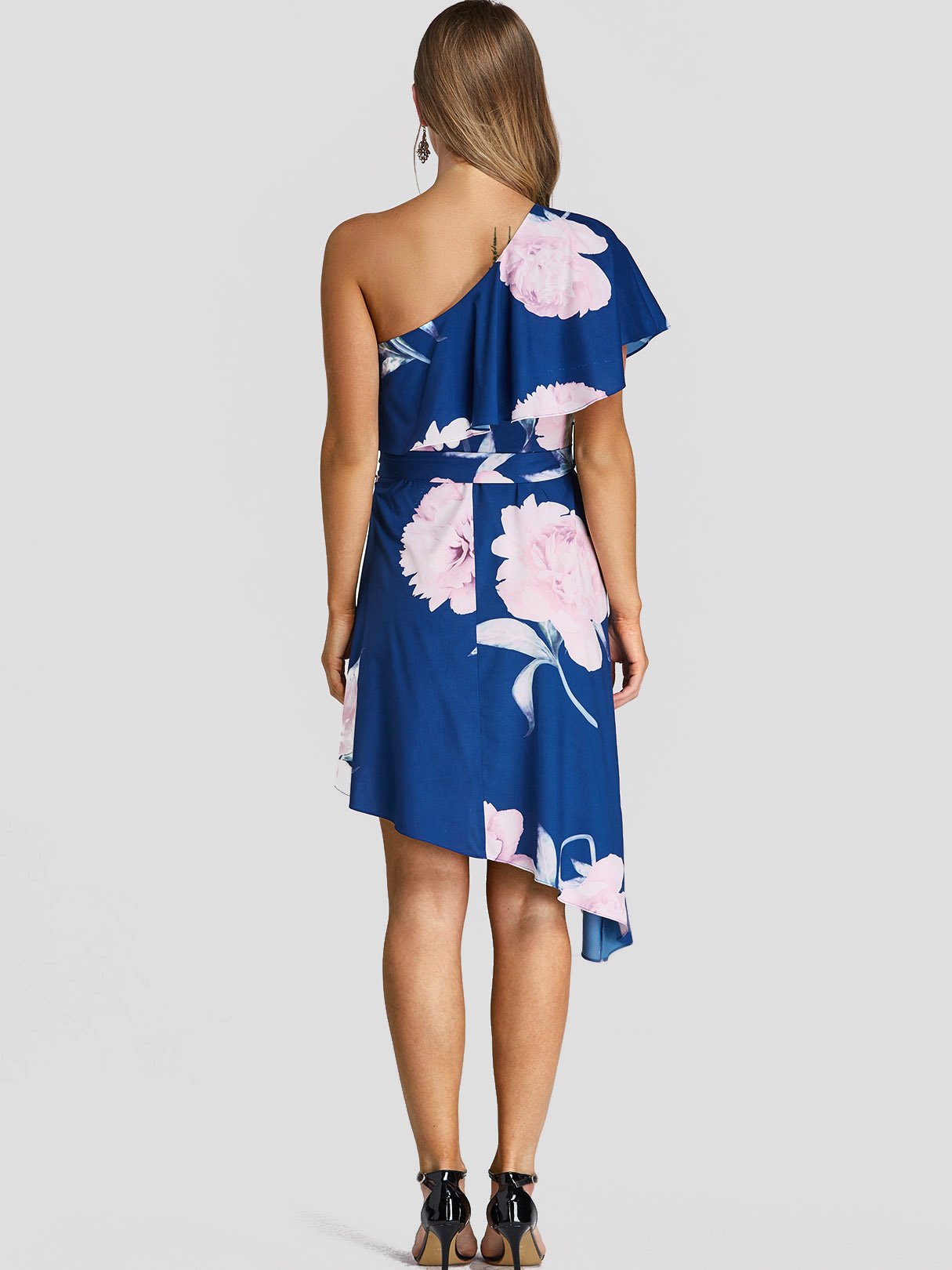 Navy One Shoulder Floral Print Tiered Belt Irregular Hem Dresses