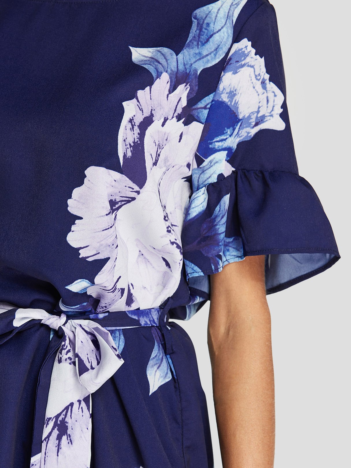 Navy Round Neck Short Sleeve Floral Print Belt Self-Tie Ruffle Hem Dresses