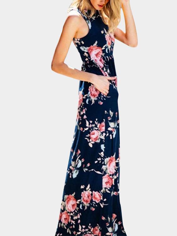 Navy Round Neck Sleeveless Floral Print Maxi Dress - Navy / S is backordered and will ship as soon as it is back in stock.