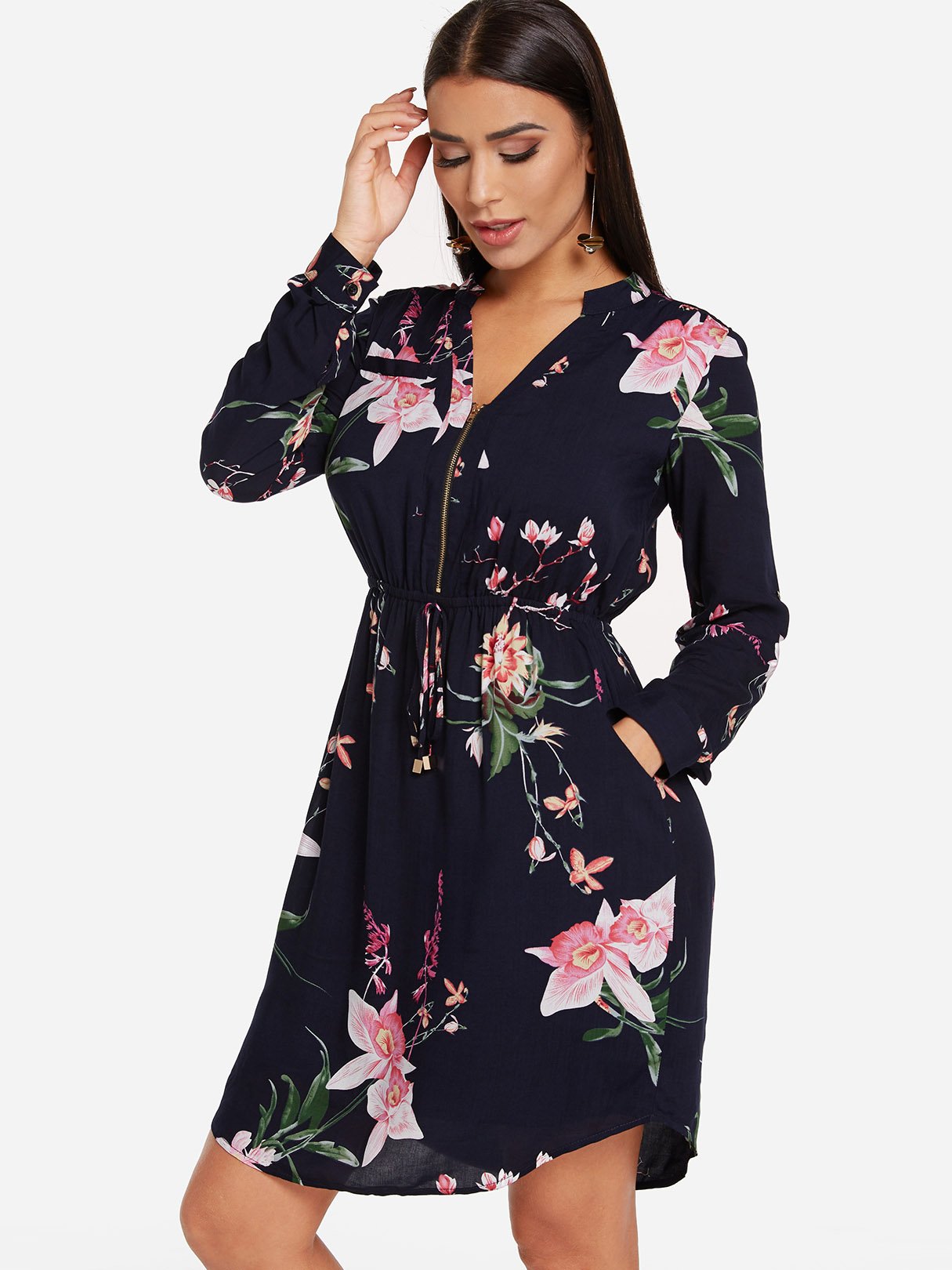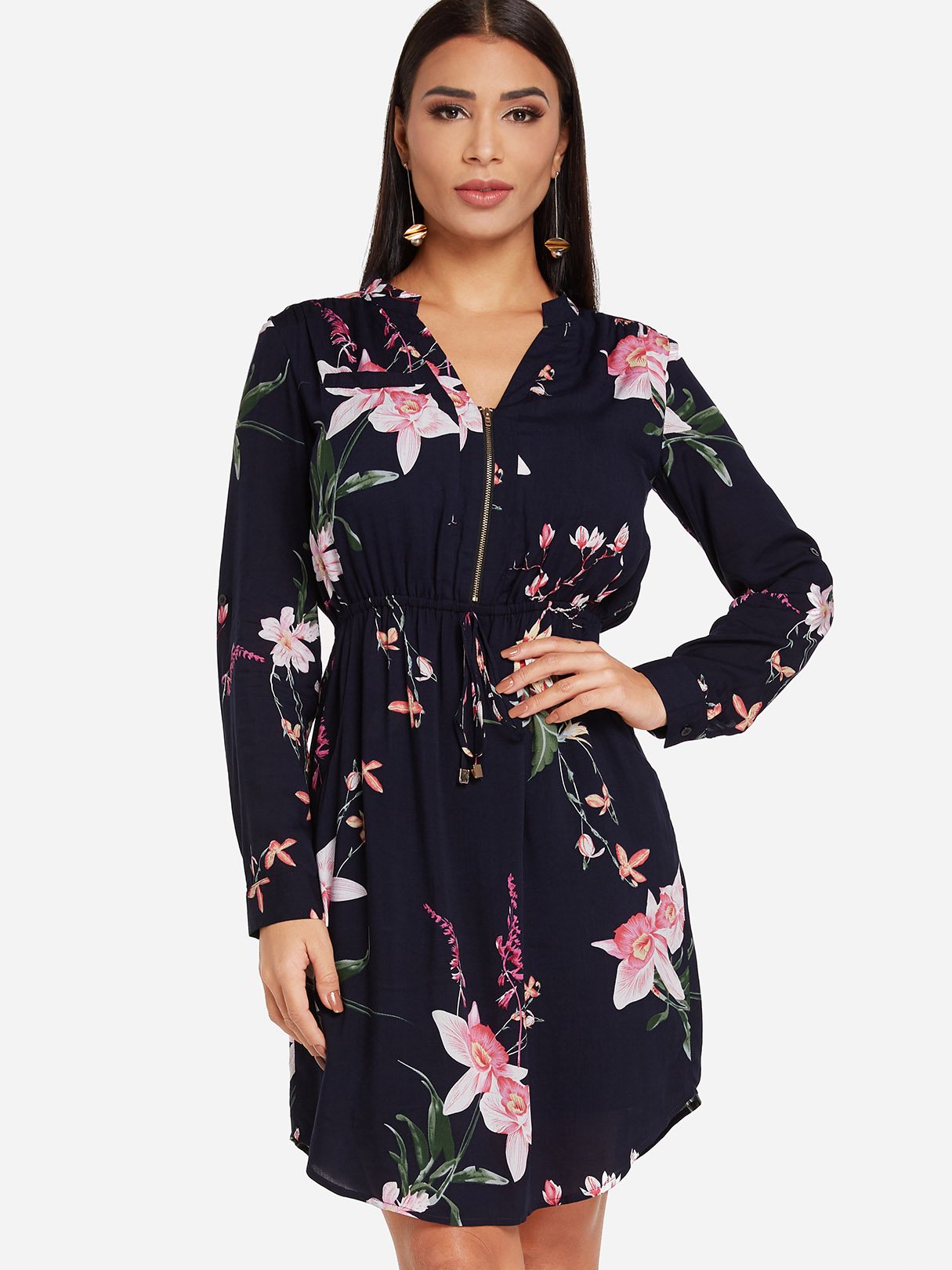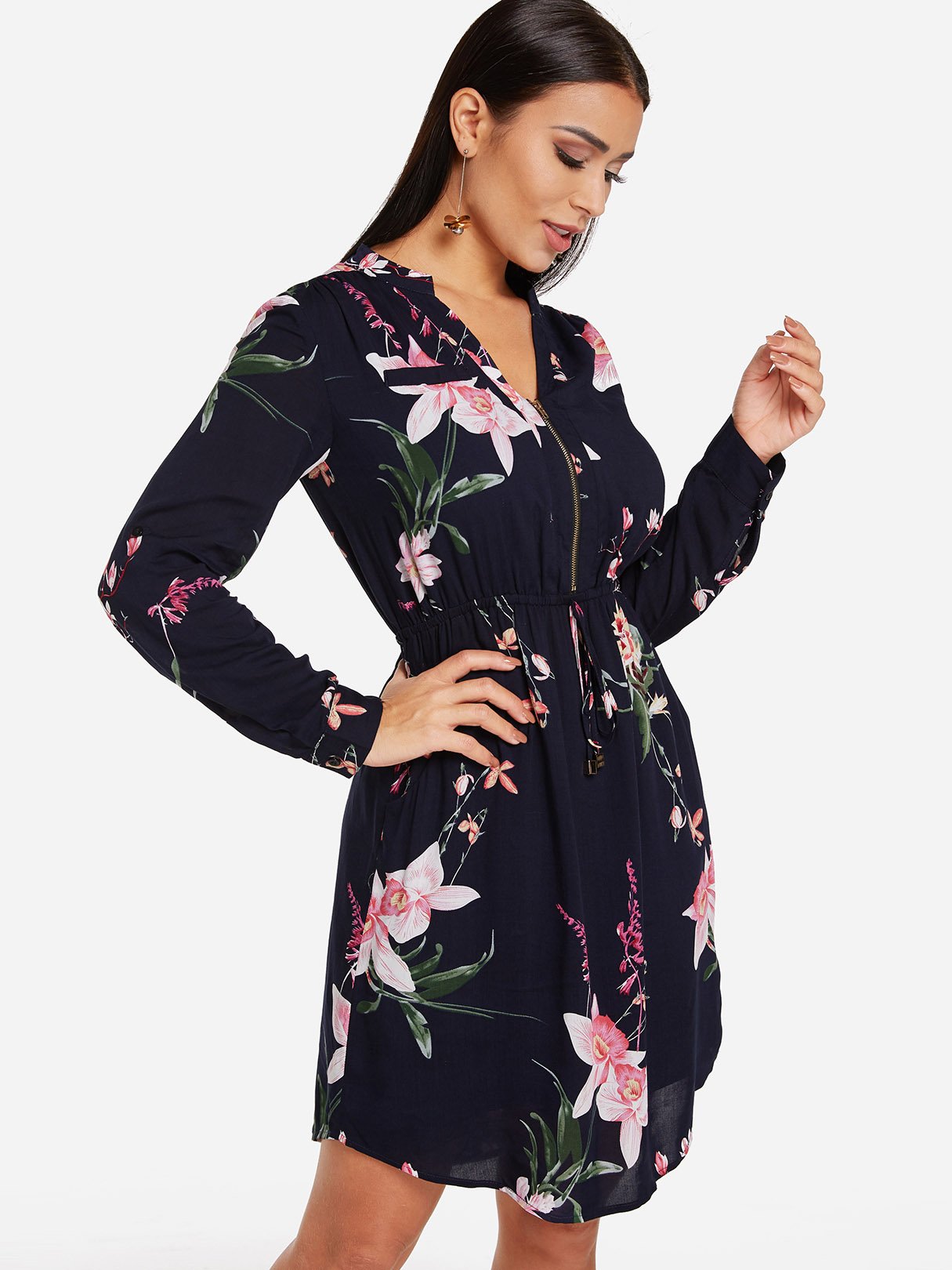 Navy V-Neck Long Sleeve Floral Print Zip Back Side Pockets Curved Hem Dresses - Navy / S is backordered and will ship as soon as it is back in stock.
