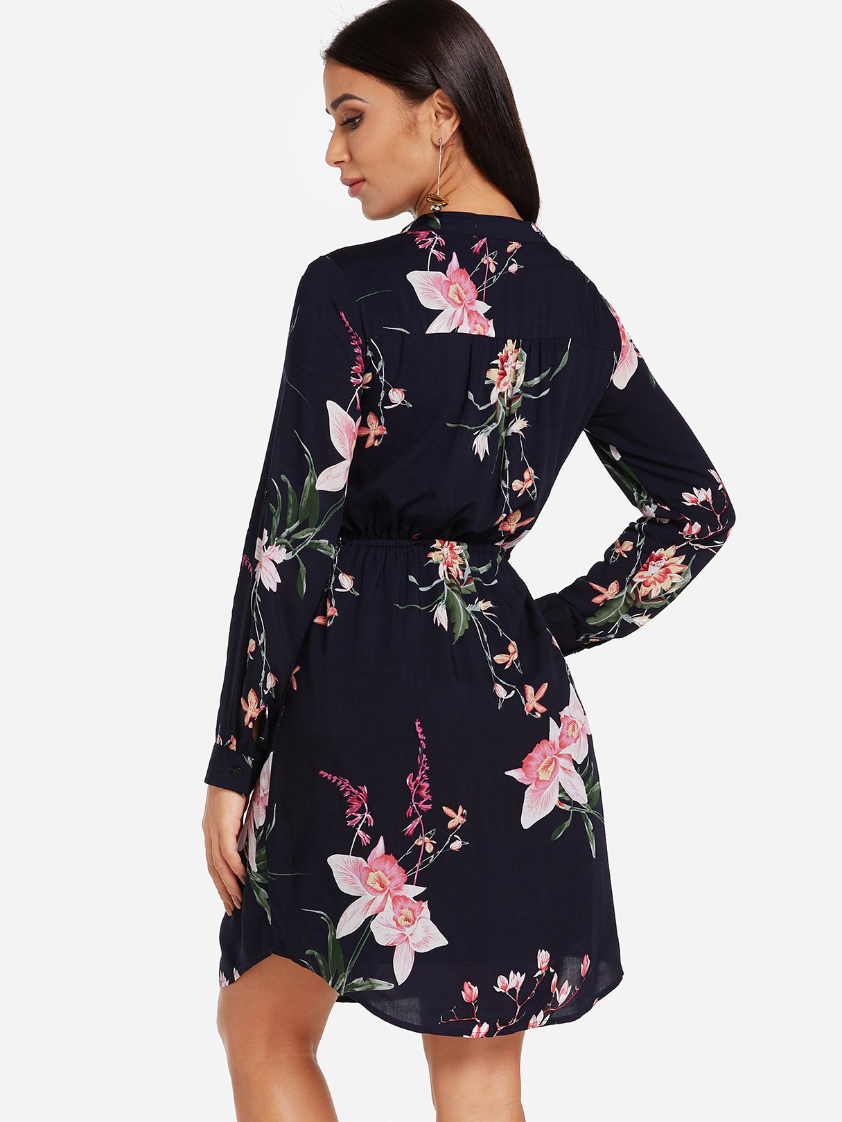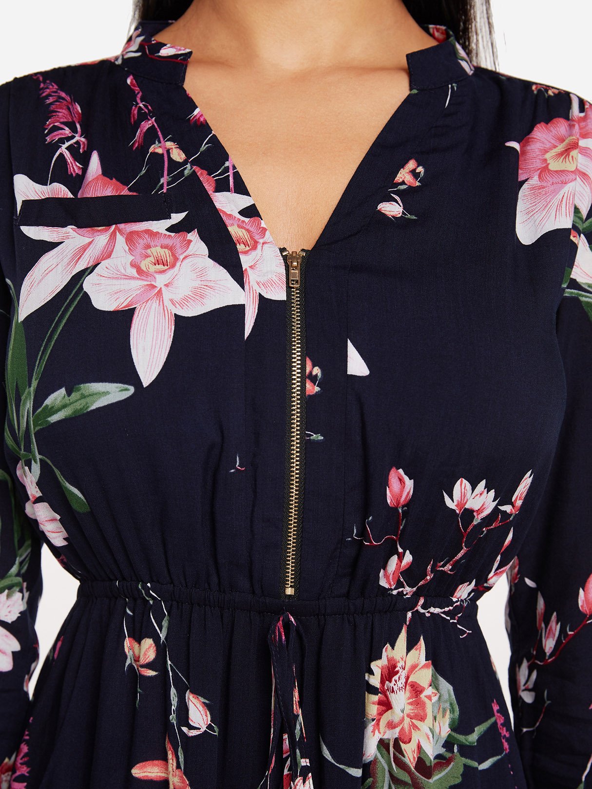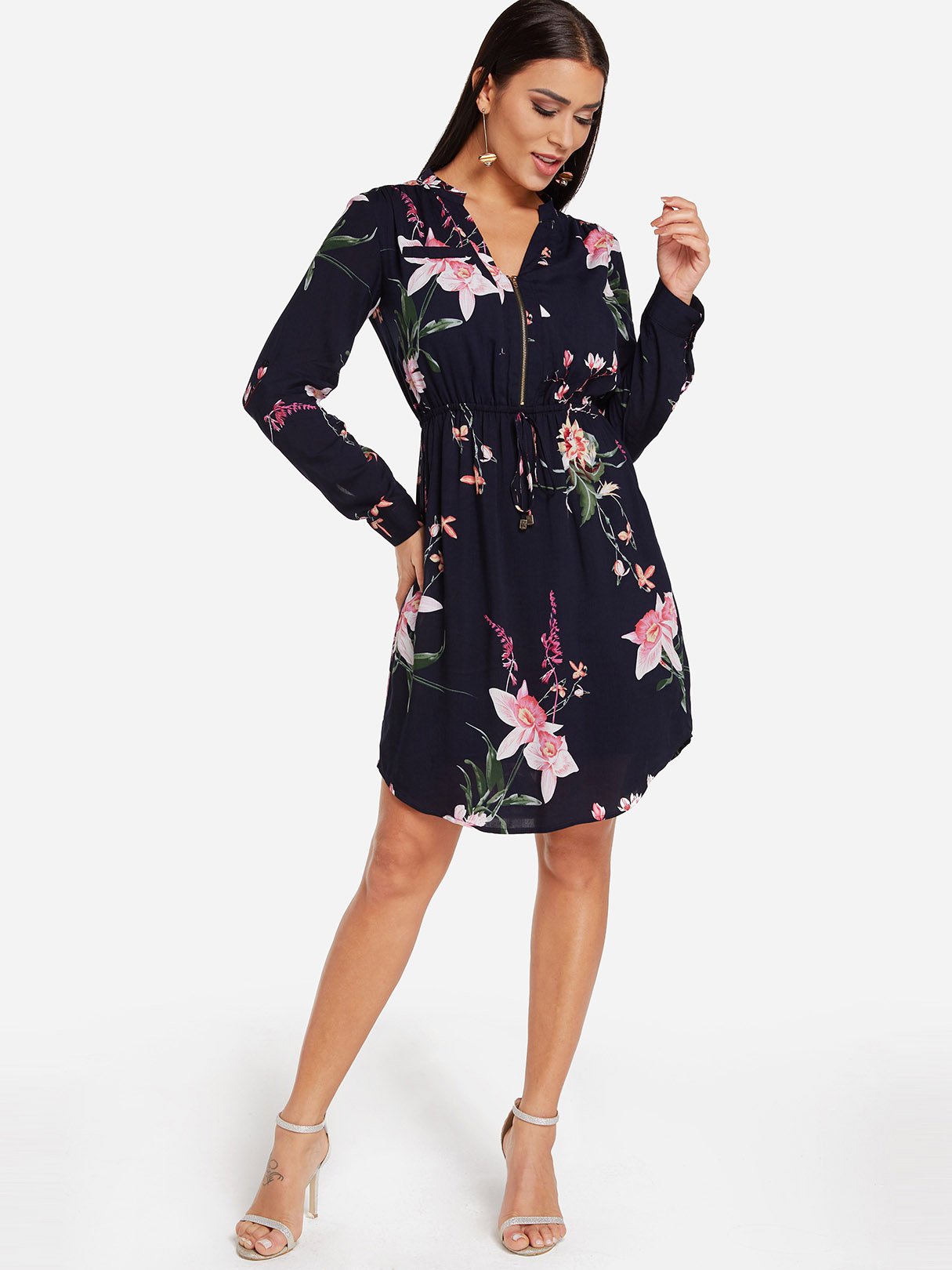 Navy V-Neck Long Sleeve Floral Print Zip Back Side Pockets Curved Hem Dresses - Navy / S is backordered and will ship as soon as it is back in stock.