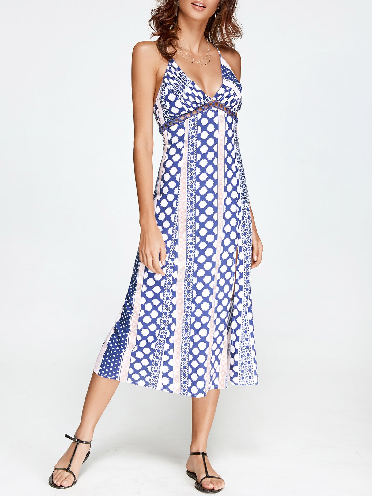 Navy V-Neck Sleeveless Geometrical Backless Spaghetti Strap Slit Hem Dresses