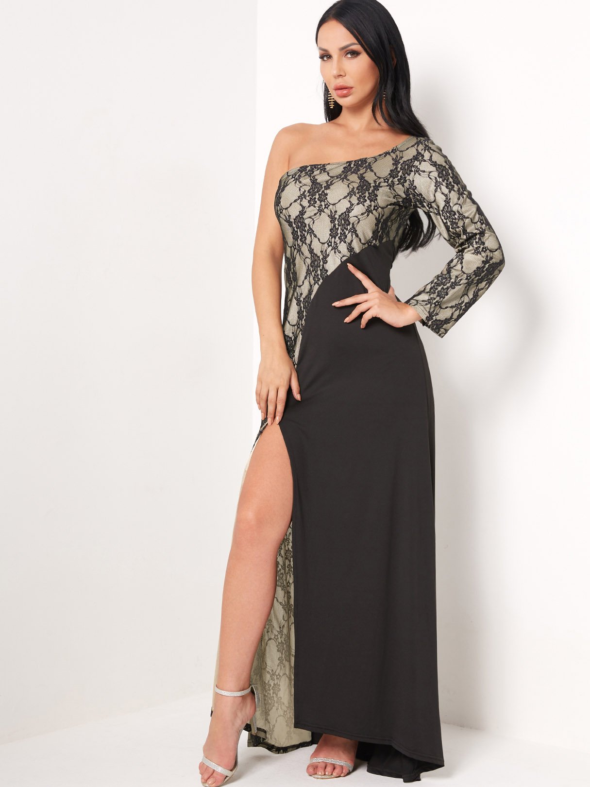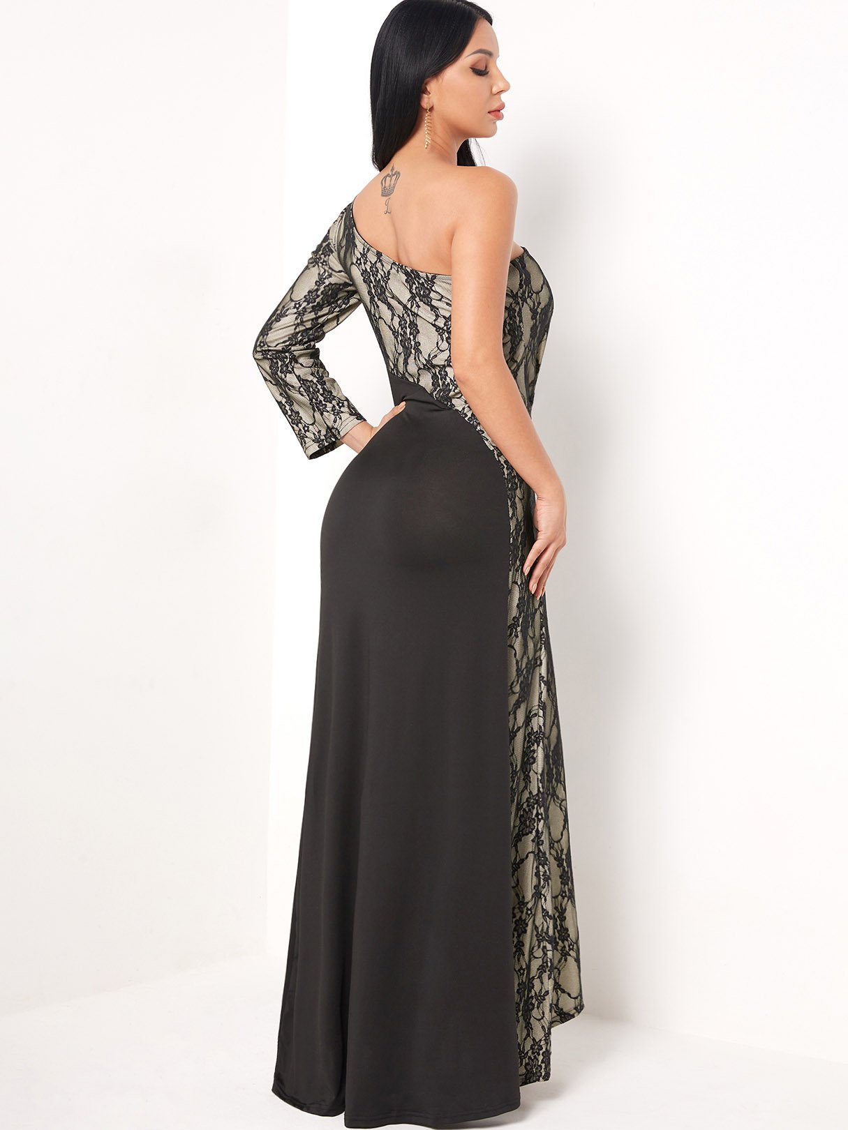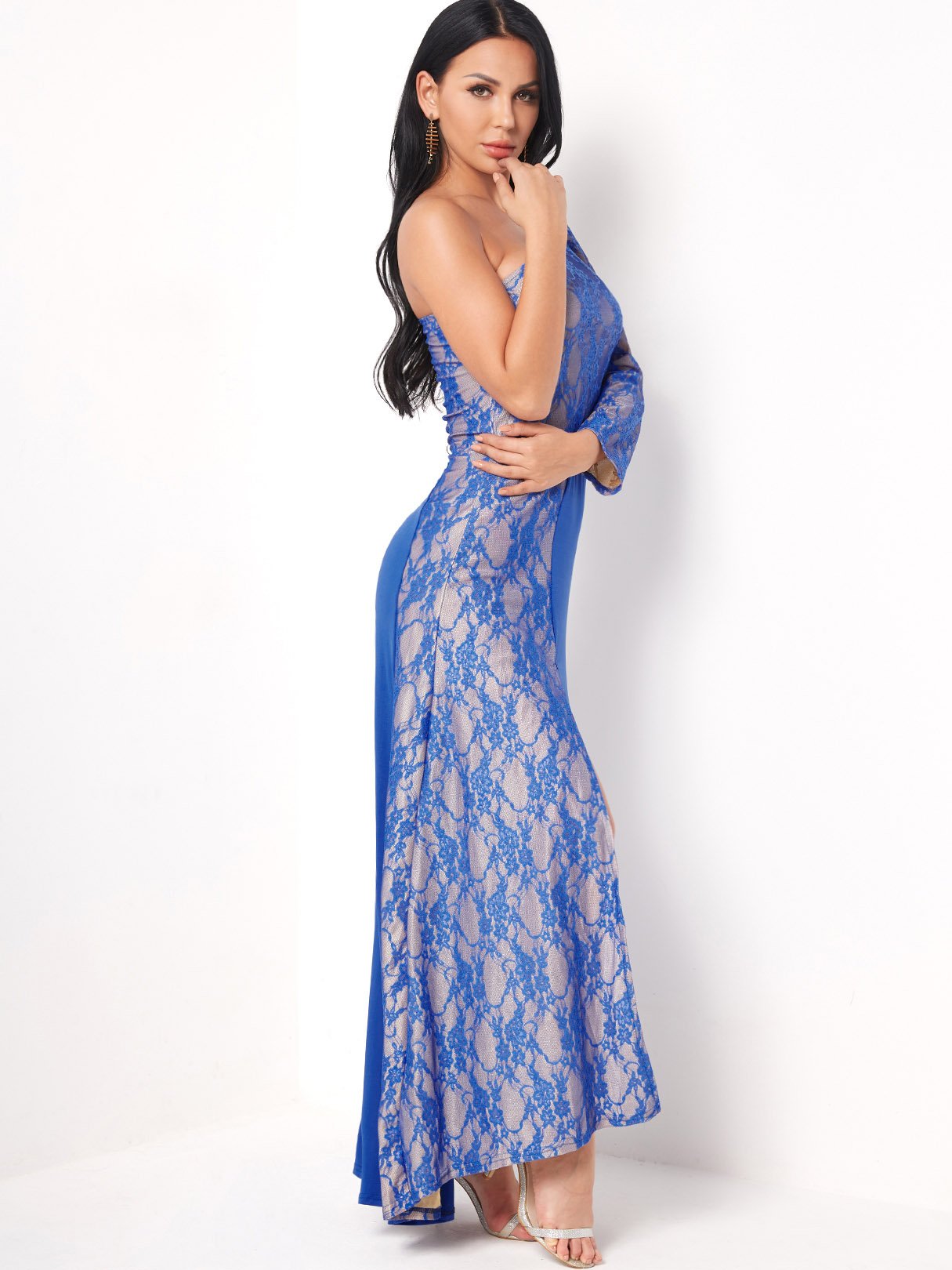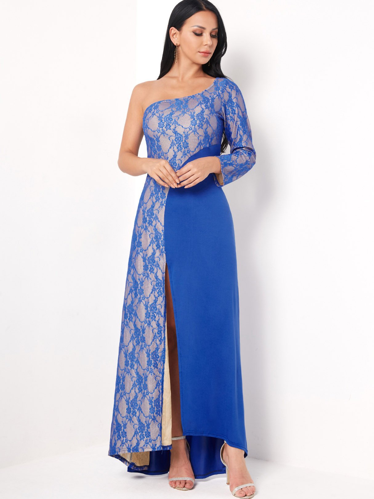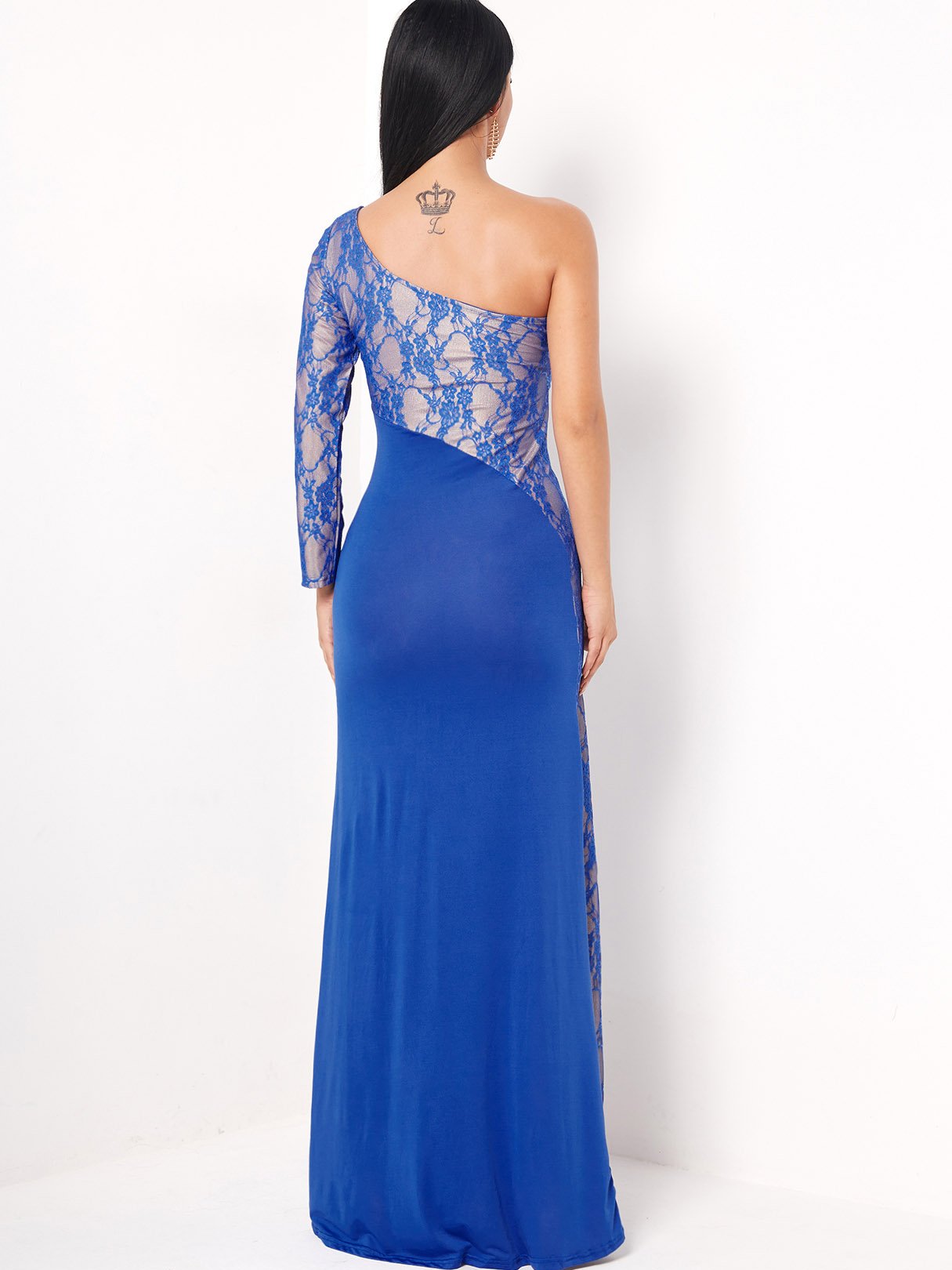 One Shoulder Lace Long Sleeve Slit Hem Blue Sexy Dresses