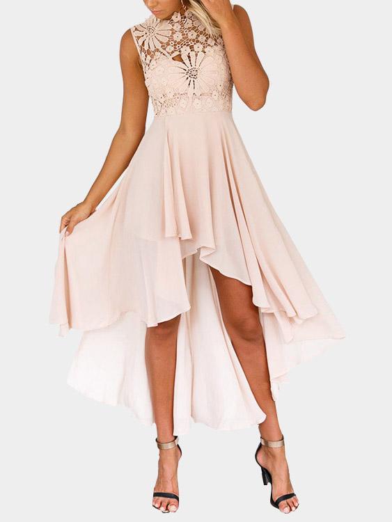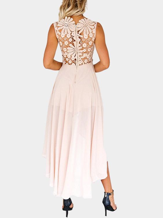 Pink Crew Neck Sleeveless Embroidered Lace Hollow Irregular Hem High-Waisted Sexy Dress