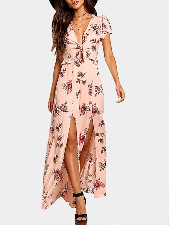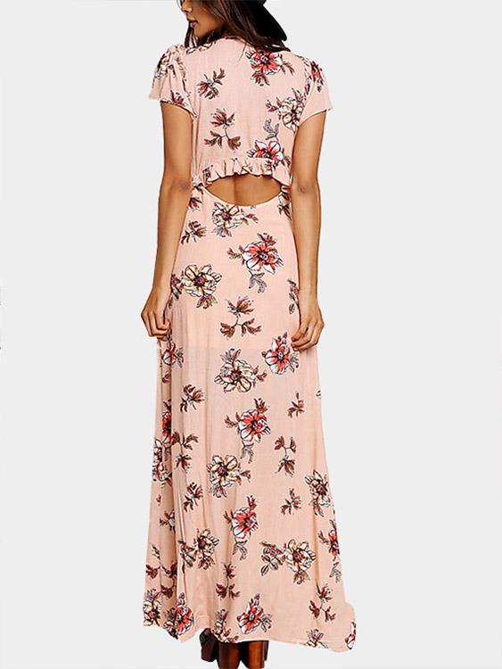 Pink Deep V Neck Short Sleeve Floral Print Cut Out Slit Hem Maxi Dress - Pink / S is backordered and will ship as soon as it is back in stock.