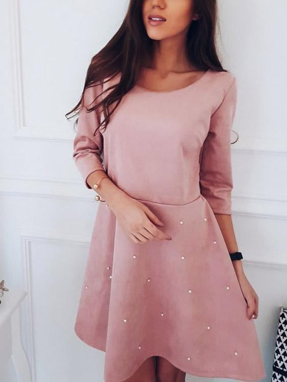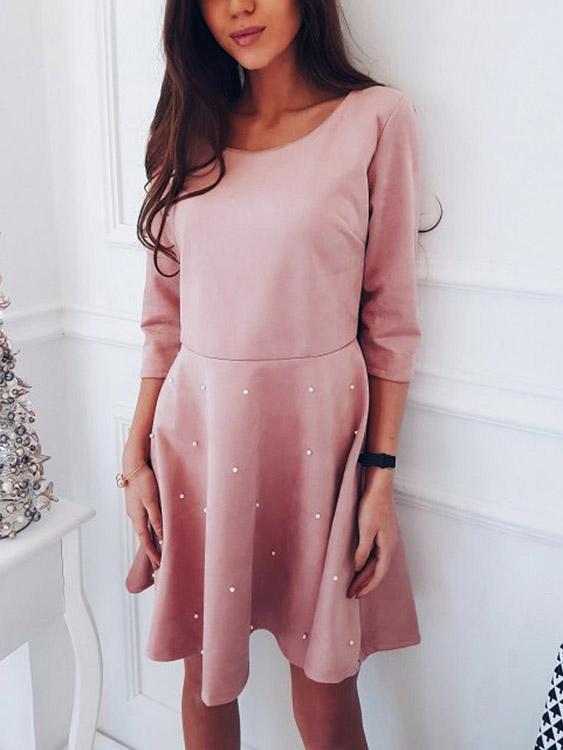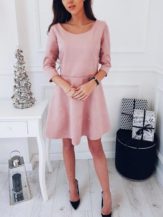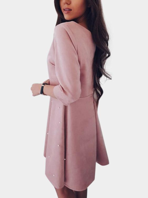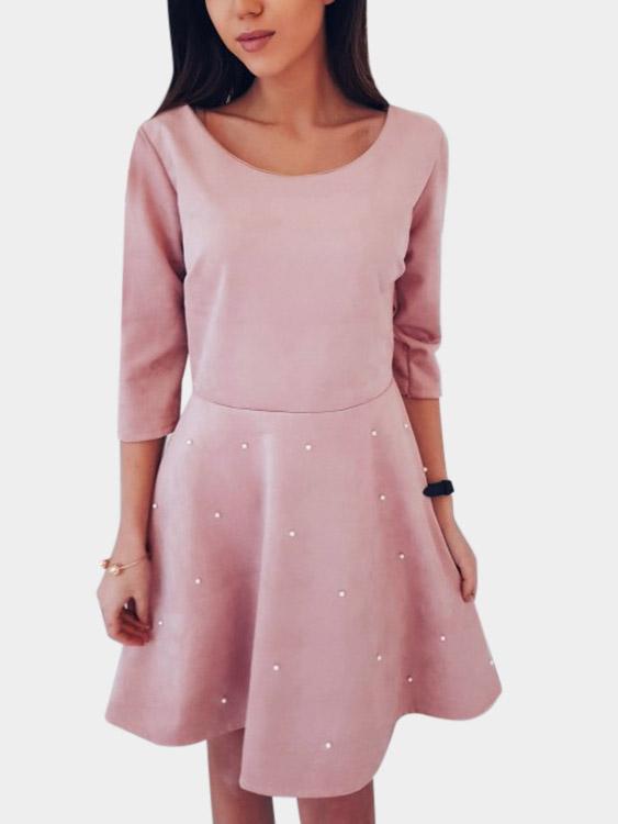 Pink Round Neck 3/4 Length Sleeve High-Waisted Sexy Dress