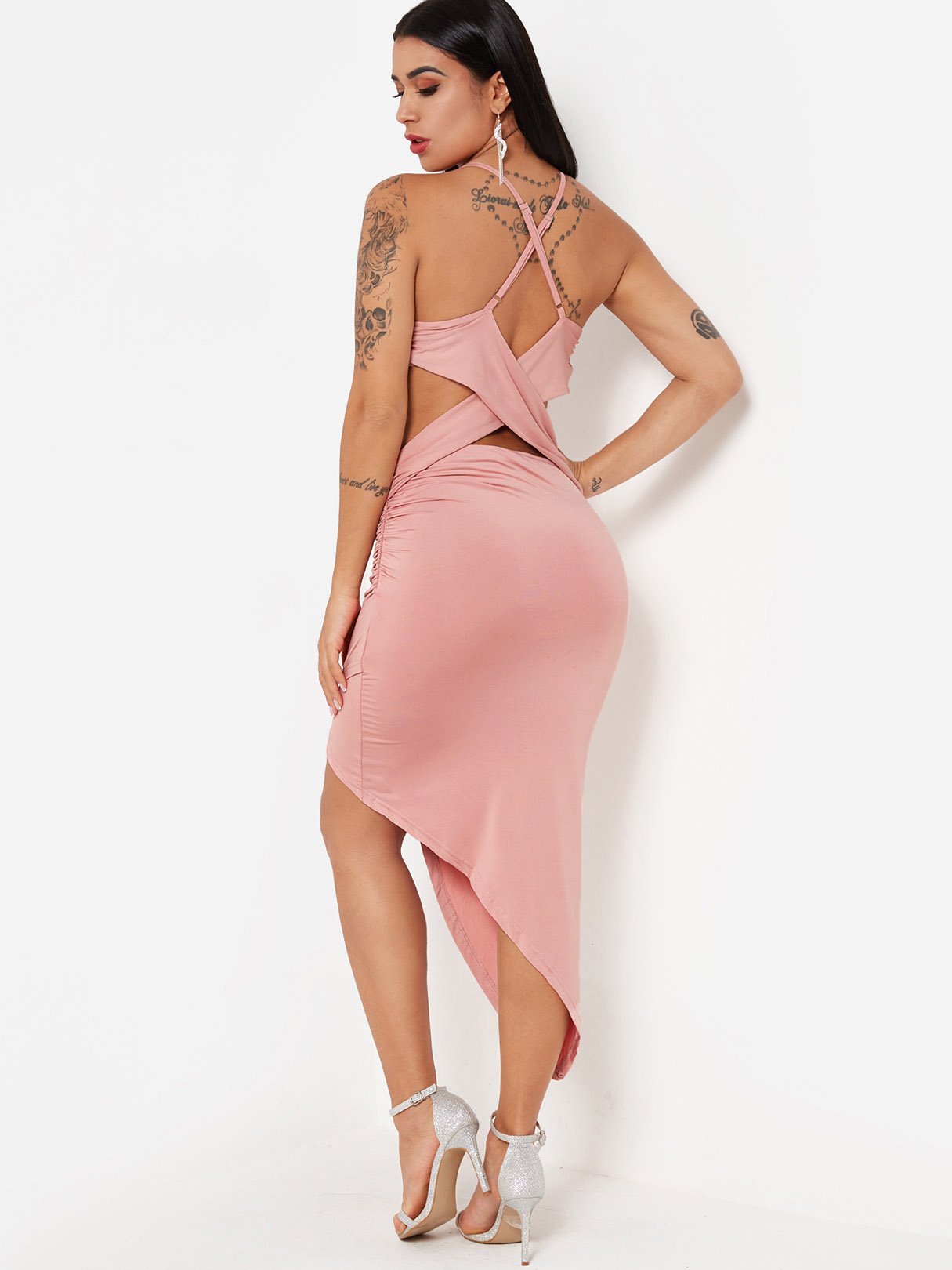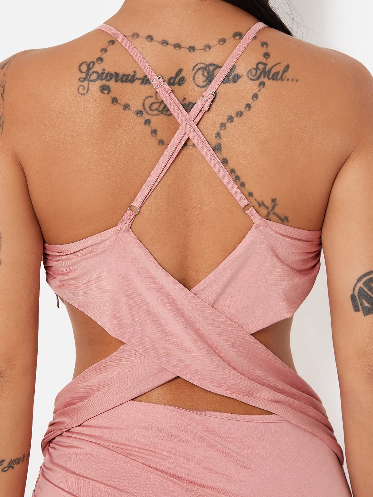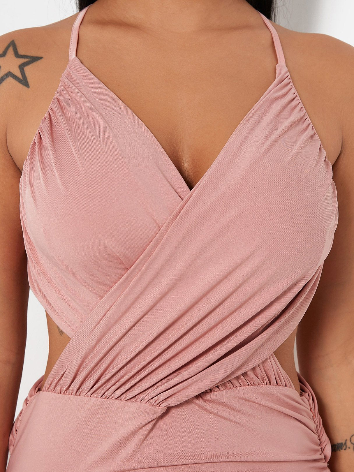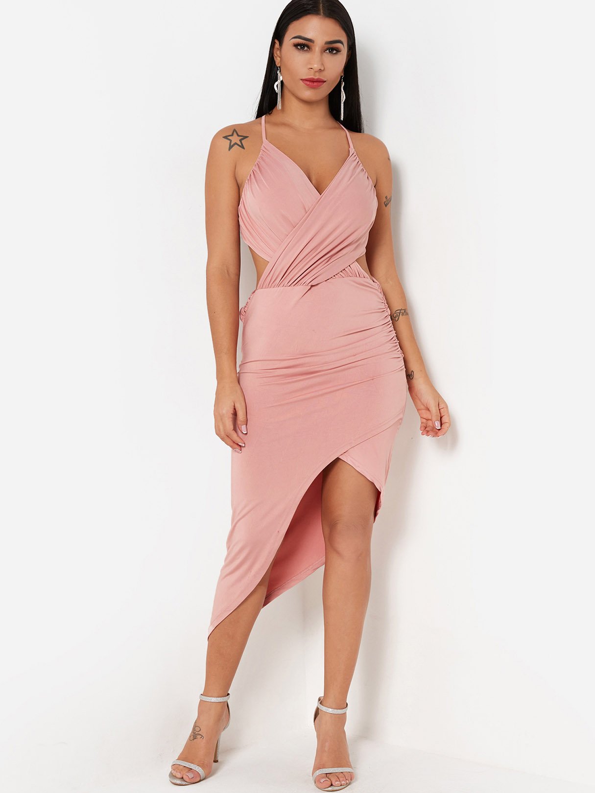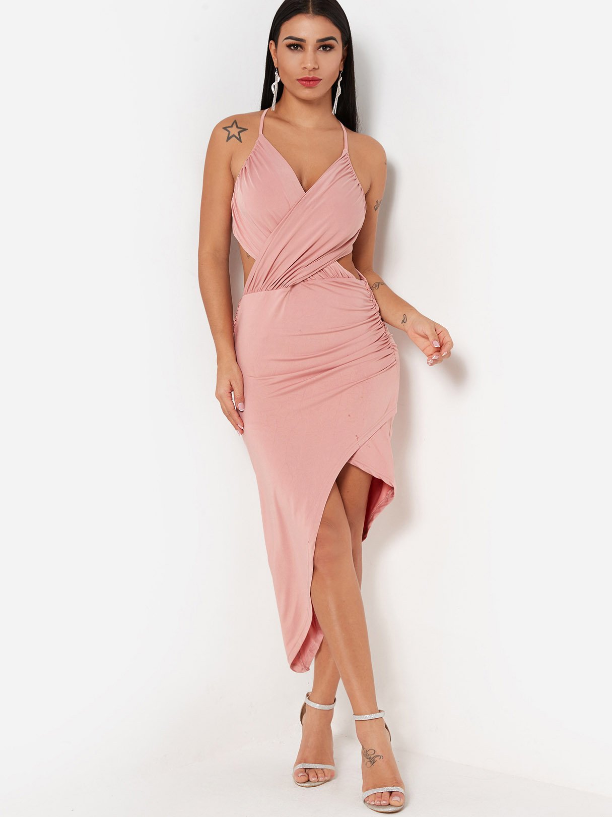 Pink V-Neck Sleeveless Backless Slit Wrap Dresses