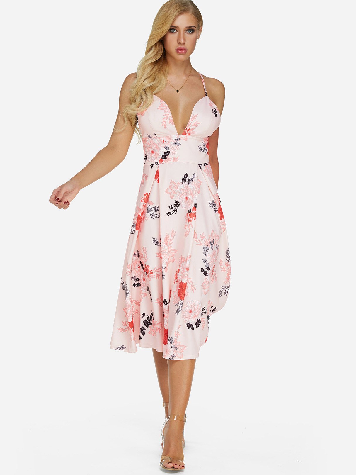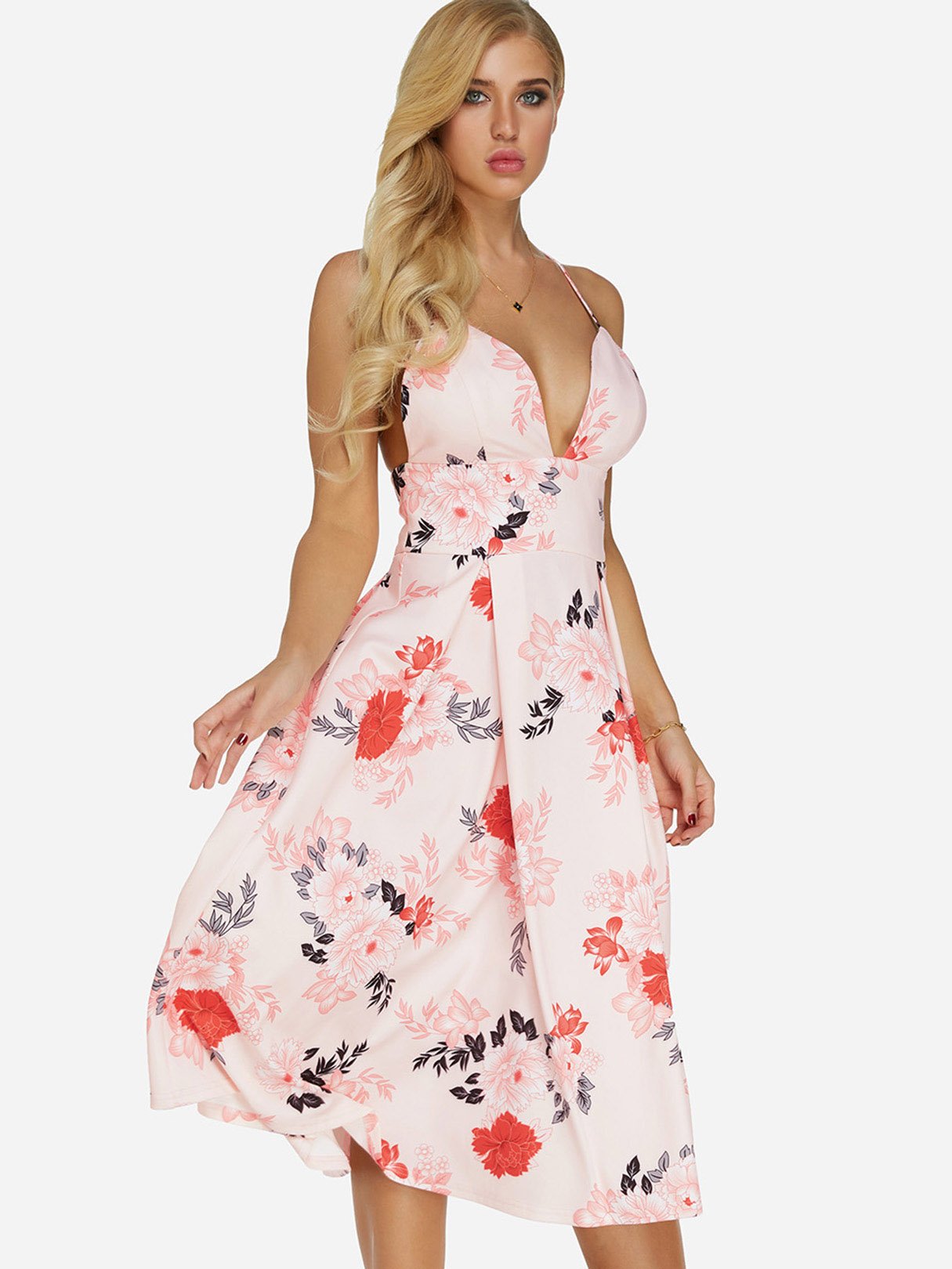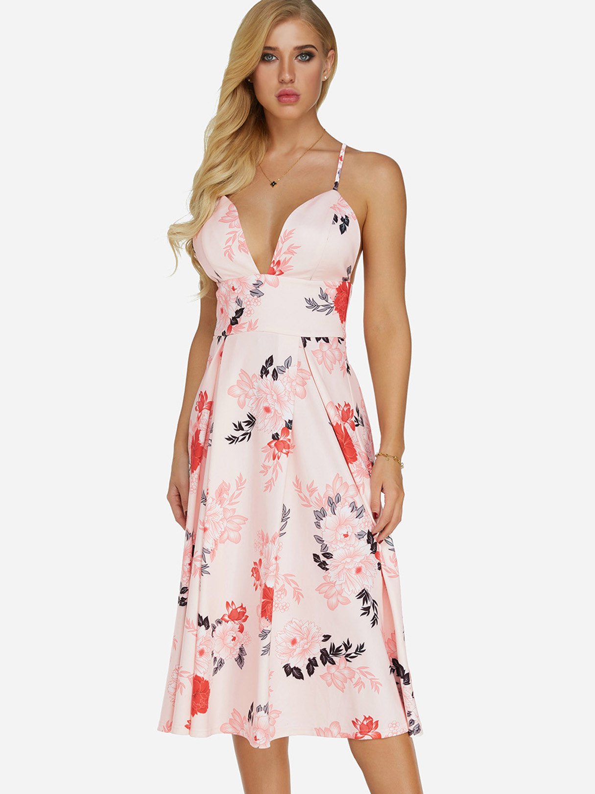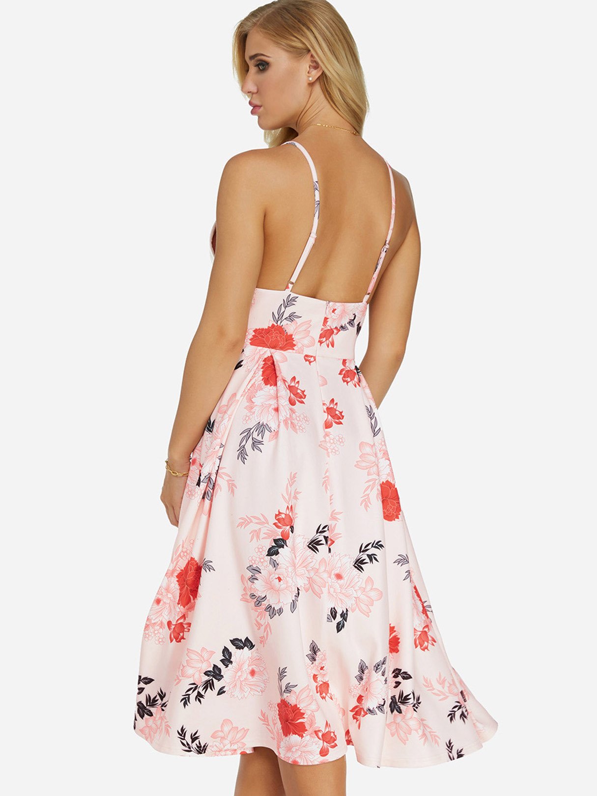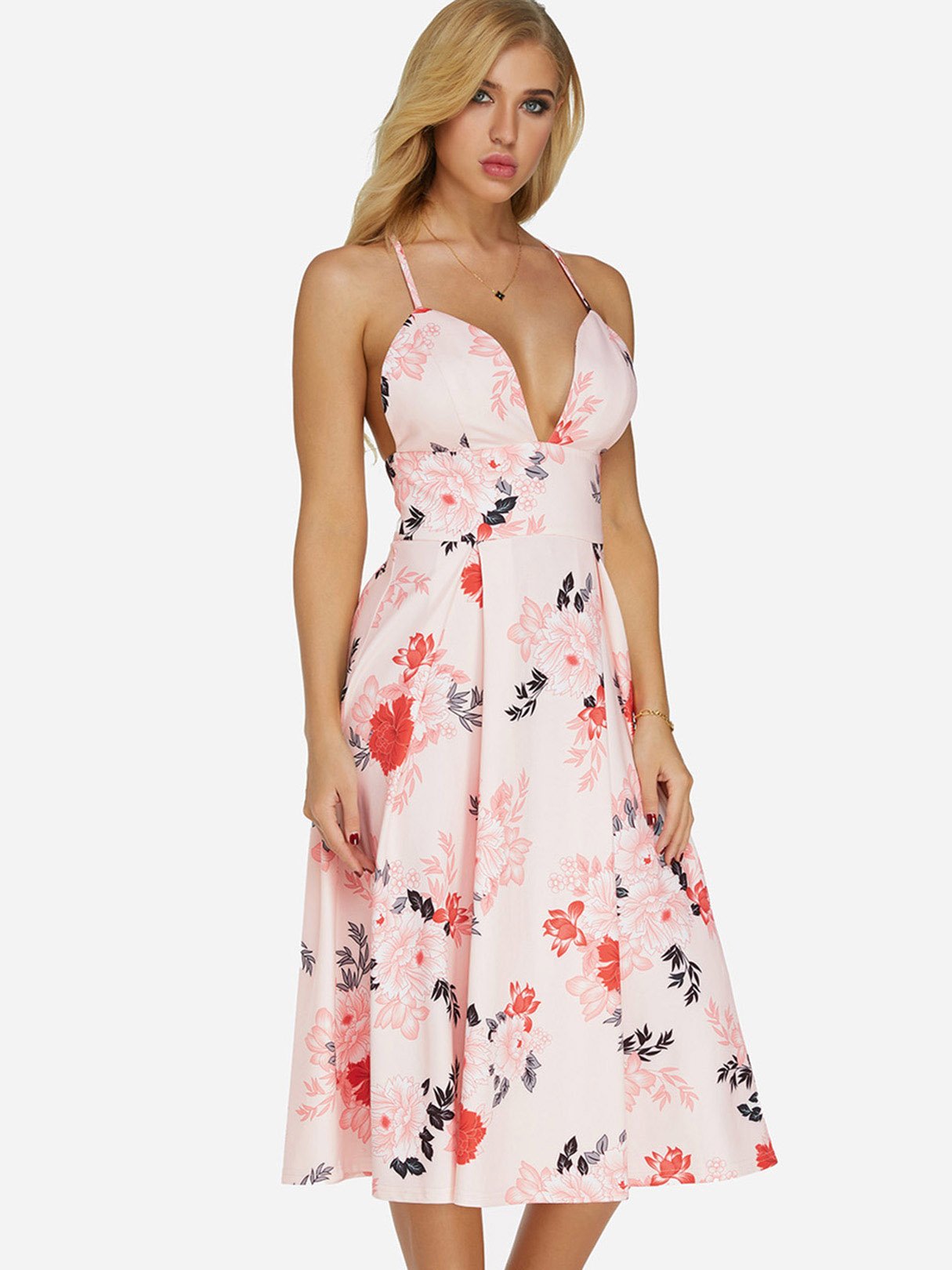 Pink V-Neck Sleeveless Floral Print Backless High-Waisted Dresses