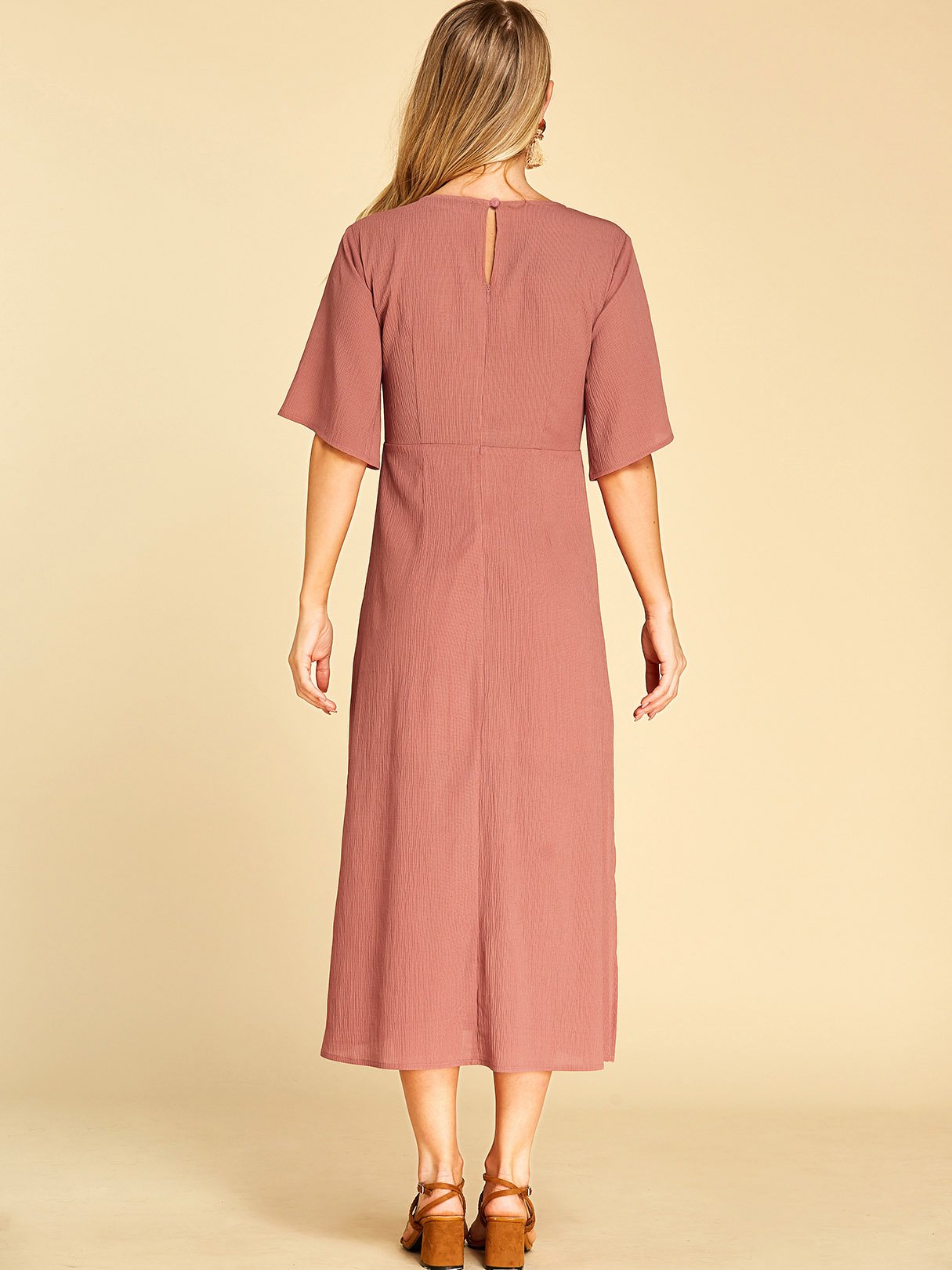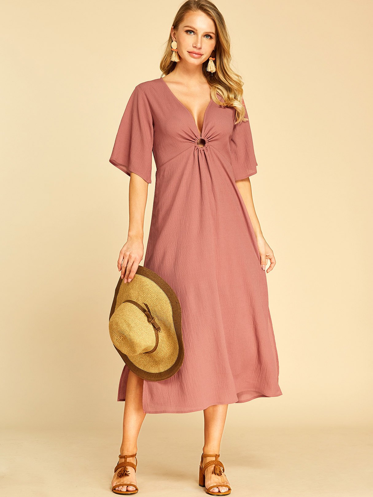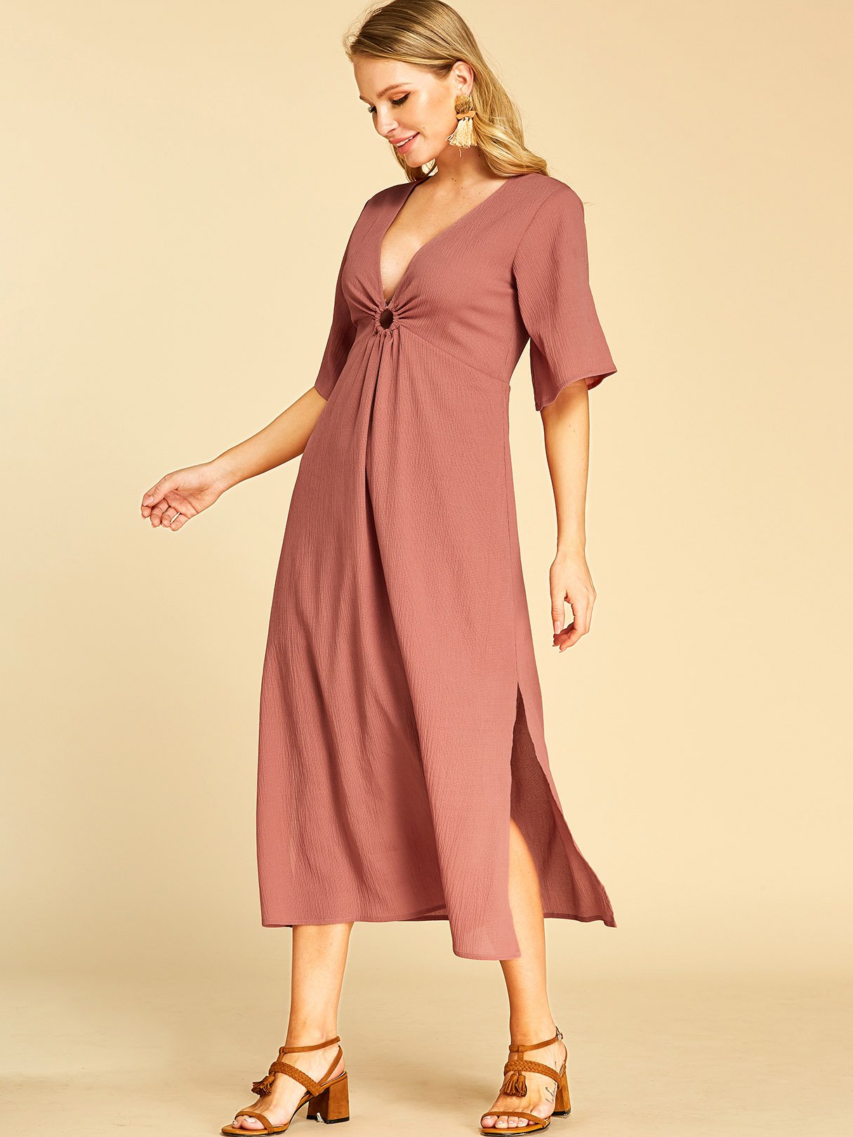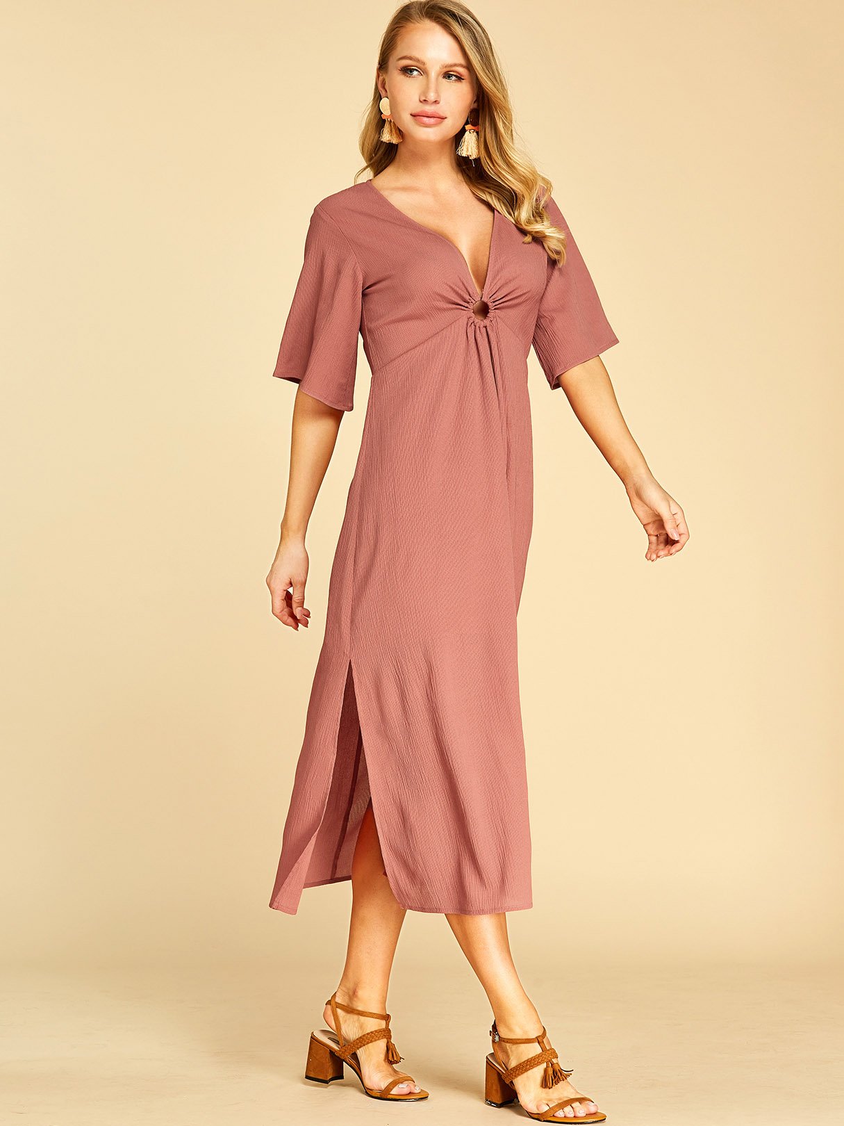 Red Deep V Neck Short Sleeve Plain Hollow Pleated Slit Dresses