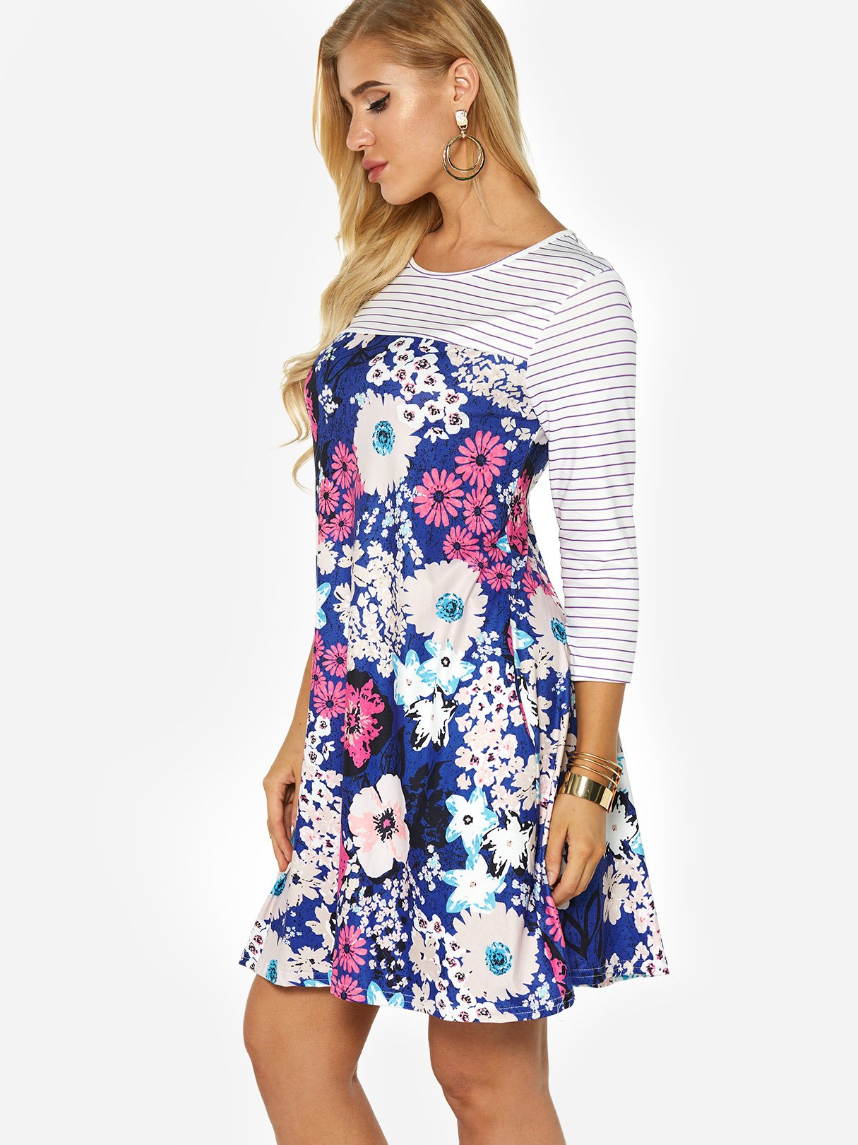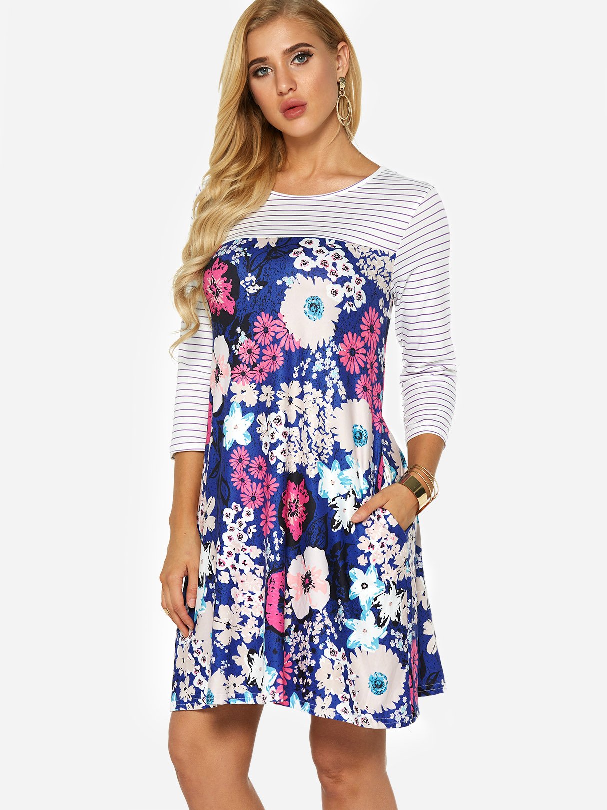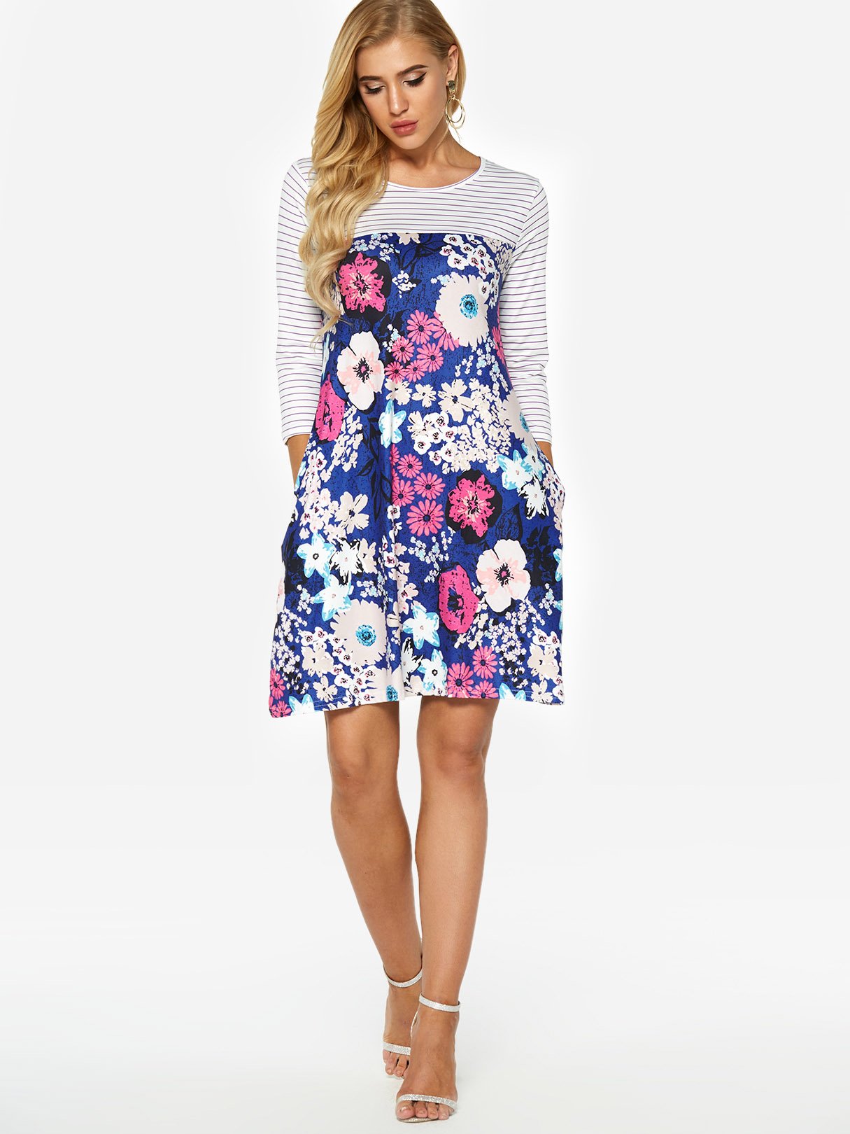 Round Neck Long Sleeve Stripe Floral Print Side Pockets Dresses