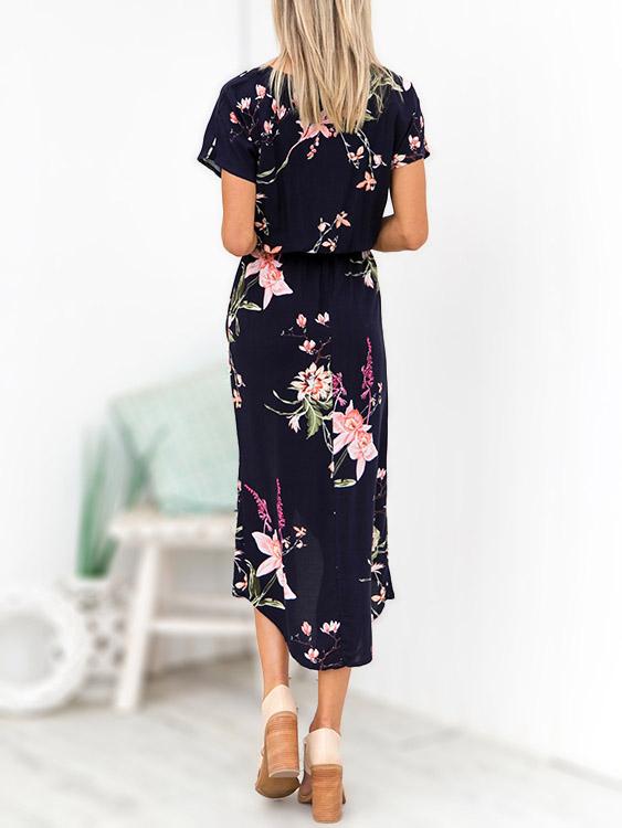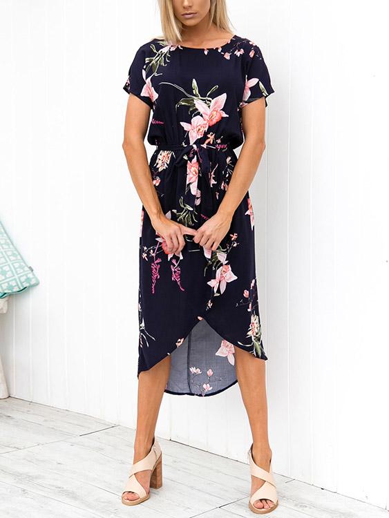 Round Neck Short Sleeve Floral Print Slit Dresses